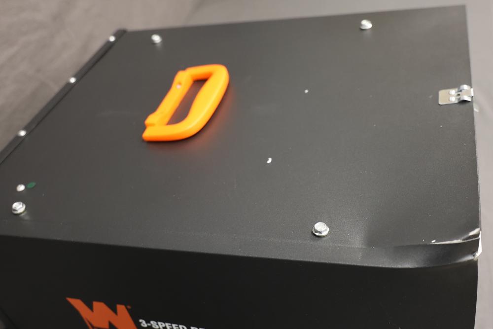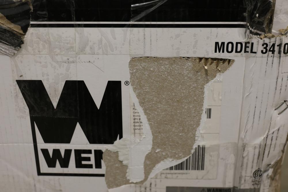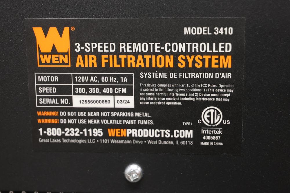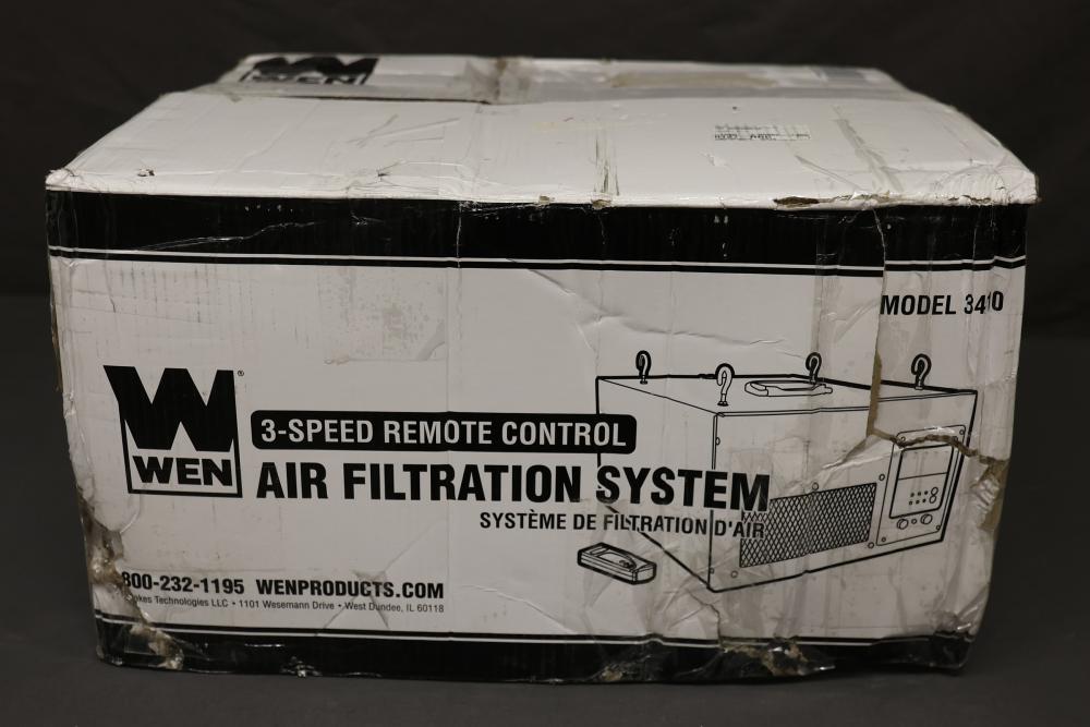 WEN Model 3410 3-Speed Remote-Controlled Air Filtration System featuring a 120V AC motor with a power of 60 Hz and 1A. It includes remote control functionality, adjustable speed settings (300, 350, 400 CFM), and mounting hardware. The unit comes in its original packaging, showing minor wear and tear on the box. Opened product. Appearing to be complete. Runs and operates.