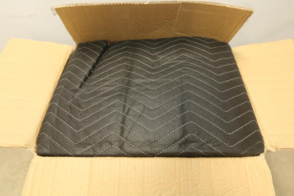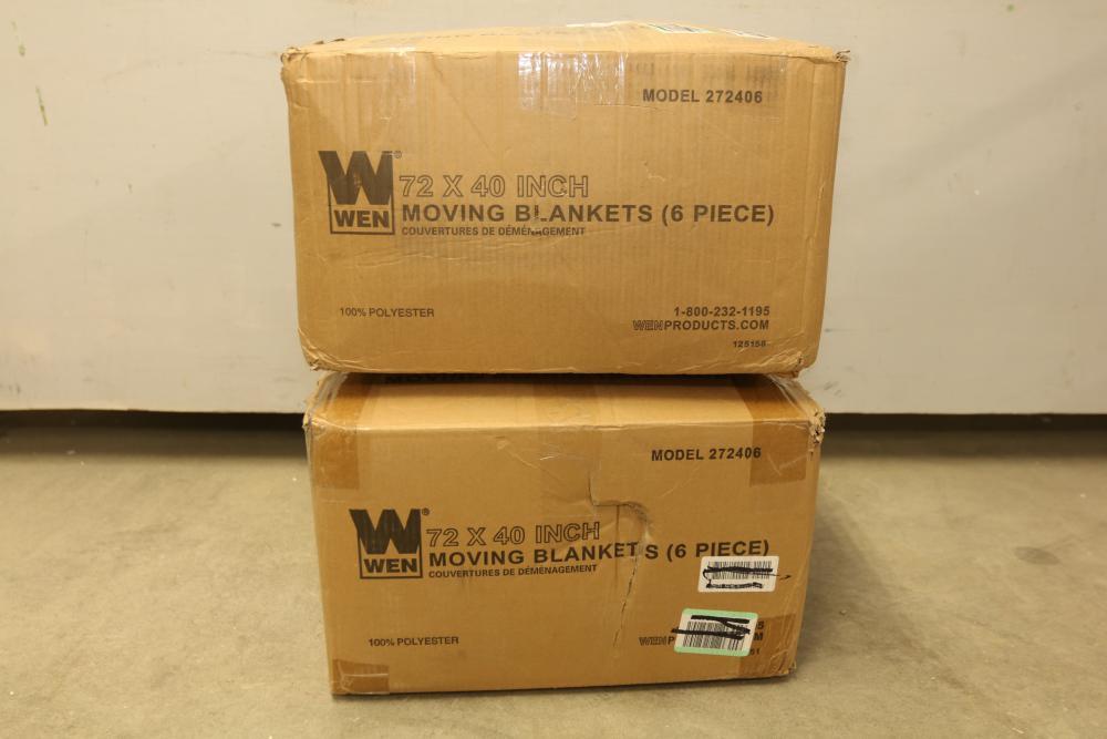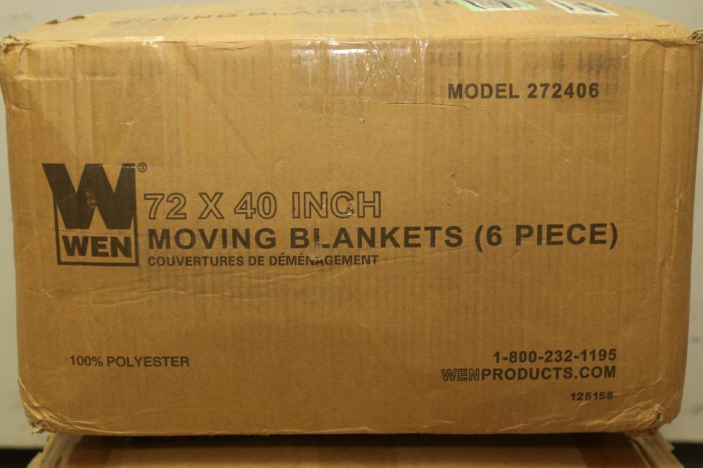 Set of six WEN Model 272406 moving blankets, each measuring 72 x 40 inches. Constructed from 100% polyester for durability and protection during moving or storage. Each blanket features a black surface with zigzag stitching and orange edging for added reinforcement. Opened product. Appearing to be complete.