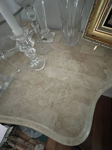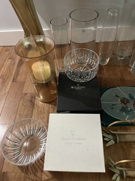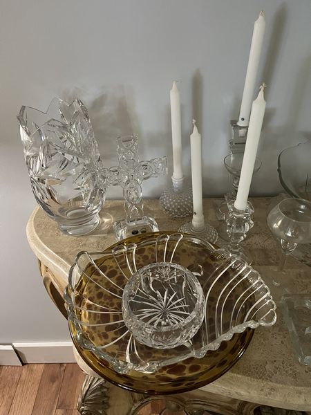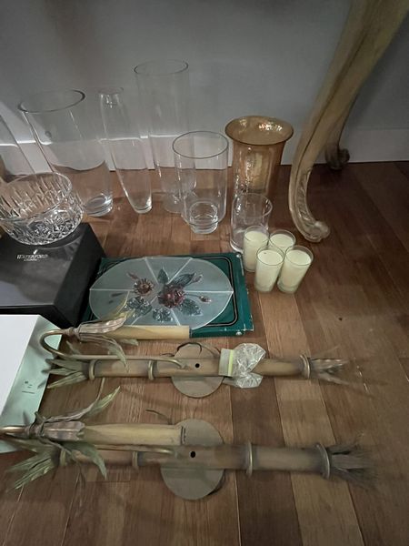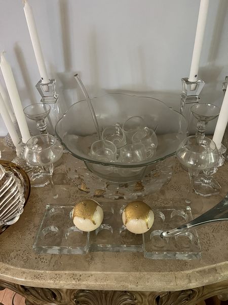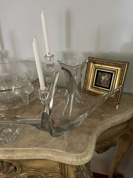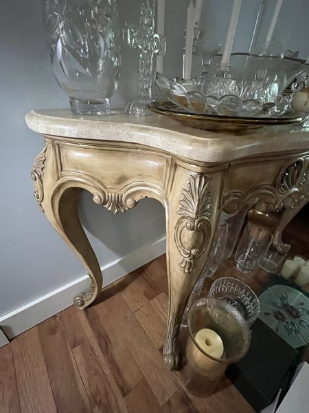 Louis XV Style Console Table, Crystal Entertaining. Formal gilt entry table w/ stone top, 62”Wx23”Dx36.5”H; entertaining pcs feat: candlesticks; punch bowl; vases from various countries; Waterford crystal bowl; Royal Dalton crystal bowl; lg'est crystal vase, 17.5”H; pr electrically wired sconces; other décor as seen in photos on table and floor.