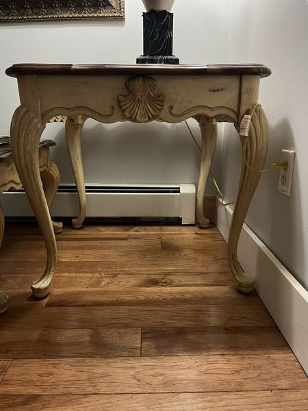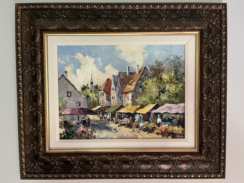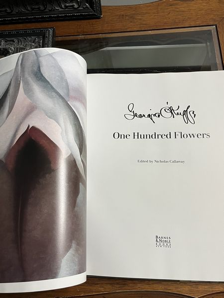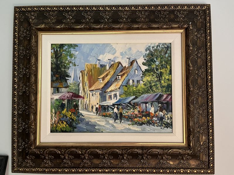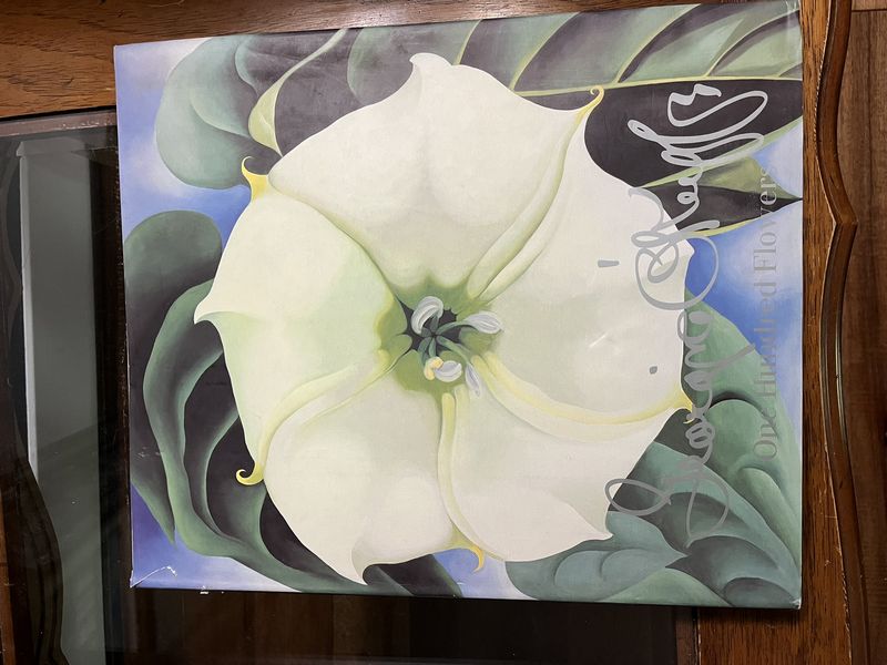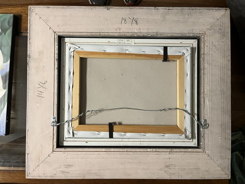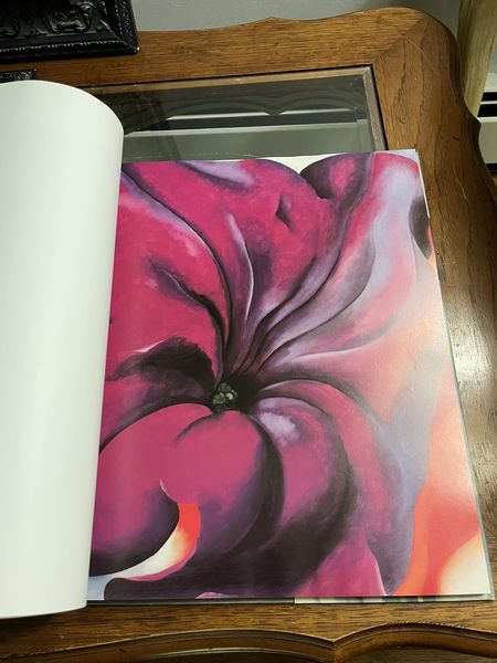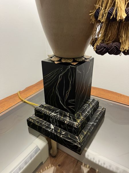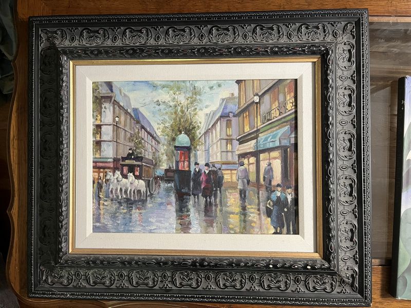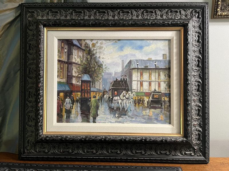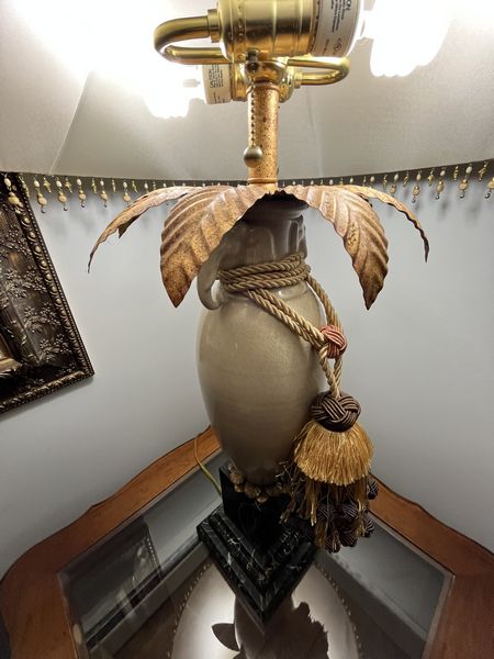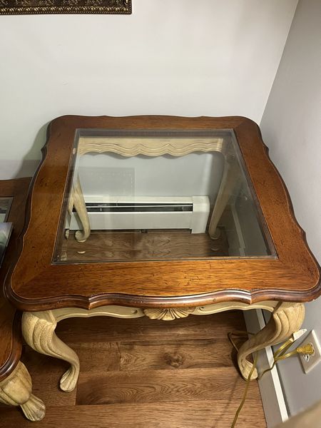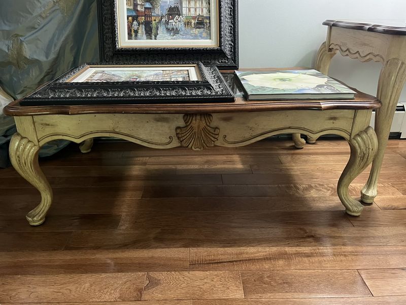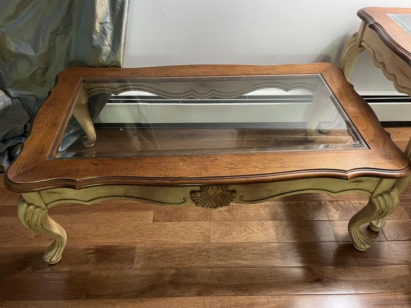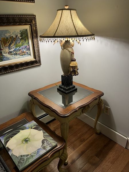Glass Inset Coffee Table and End Table, Table lamp, Artwork. Set/2 coffee table w/ glass inset, 47”Wx28”Dx17”H; matching end table w/ glass inset, 28”sq x25.5”H; decorative table lamp (leaf motif) w/ beaded trim shade, 3'H; set/4 antique framed wall art (street scenes), ea. 26”Wx22”H in 2.5” thick carved frames; Georgia O'Keefe coffee table book.