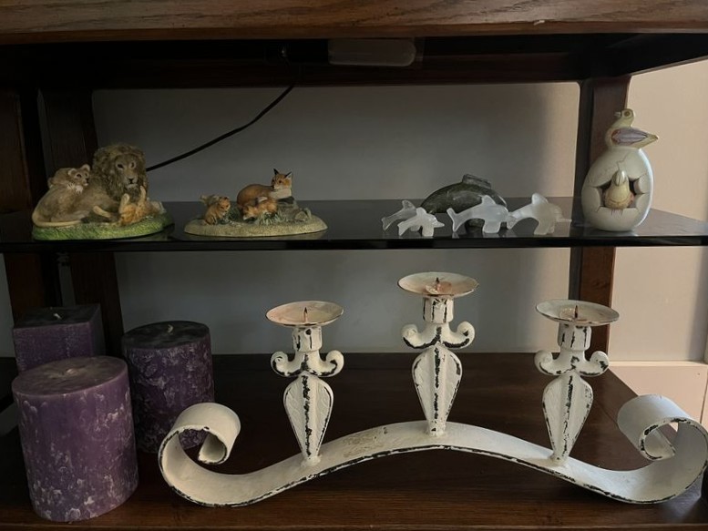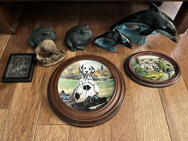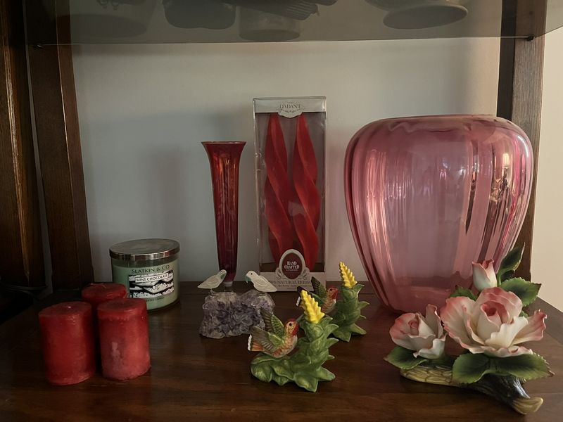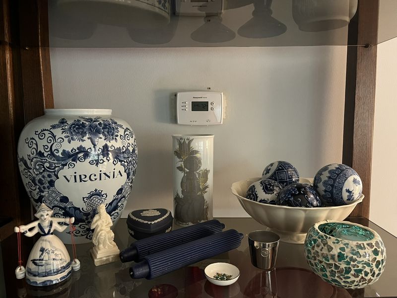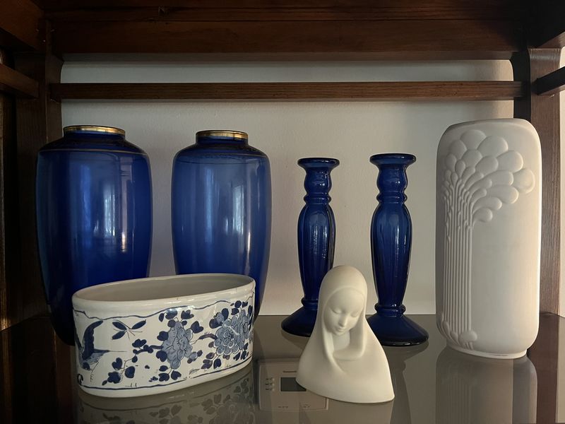 Quality Clear and Colored Glass Décor, featuring Lenox, Delft, Wedgwood, Rosenthal. Mostly vases in varying sizes w/ lg'est vase (pink) 1'H; Lenox bowl (seen w/ blue & white balls inside); Wedgwood covered heart-shaped dish; Kaisere W. Germany white vase; Rosenthal white w/ gold enhancements of angelic child; Delft "Virginia" vase and oval container; other related items as seen in photos. Shelving offered in lot #6.