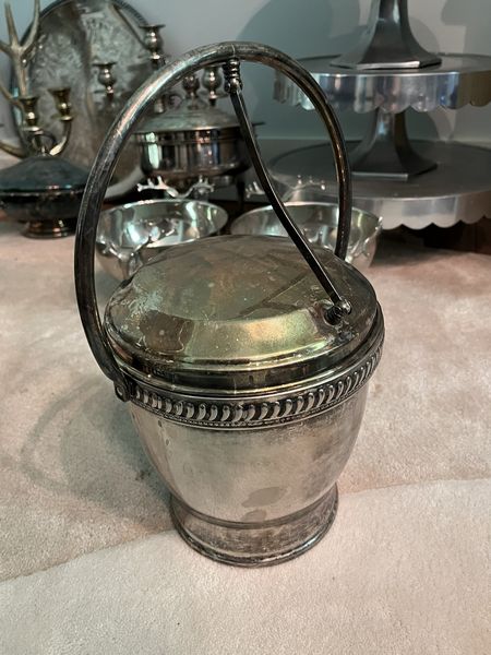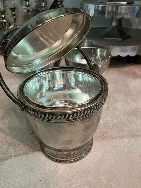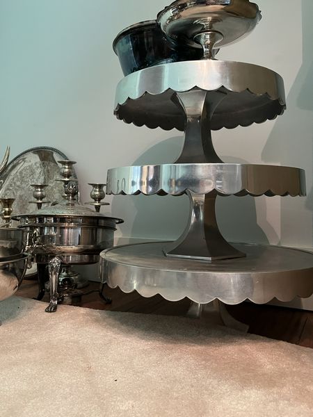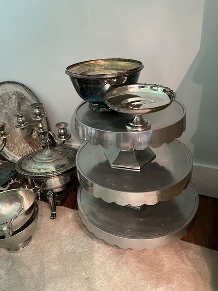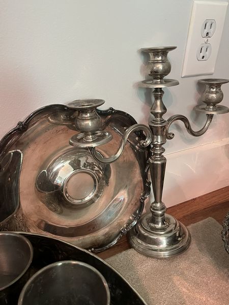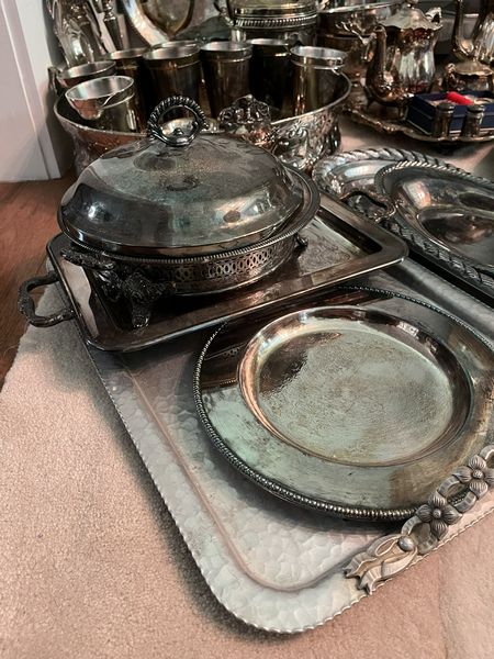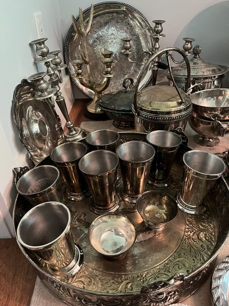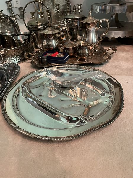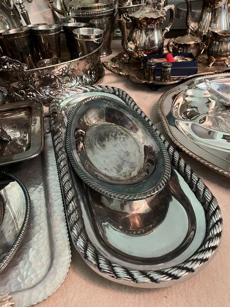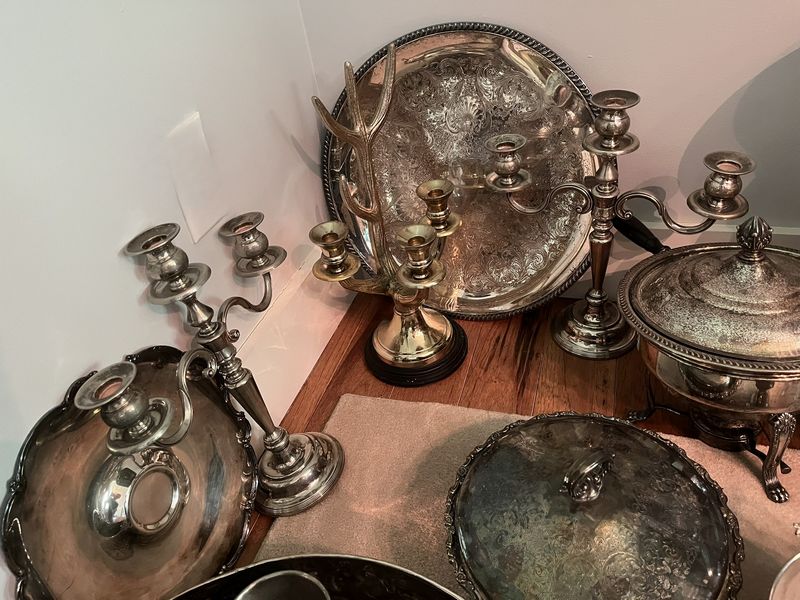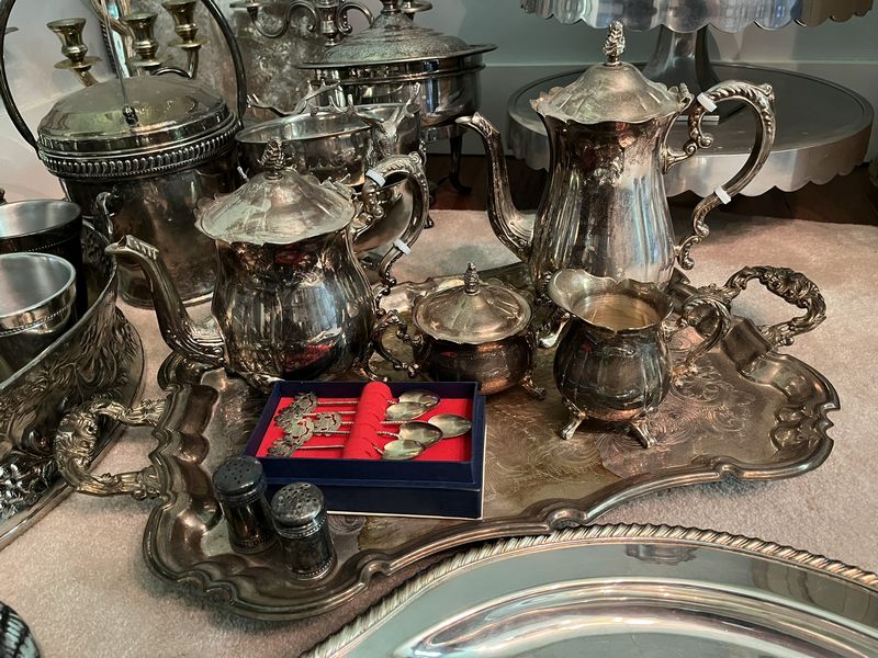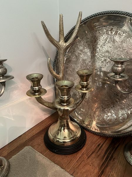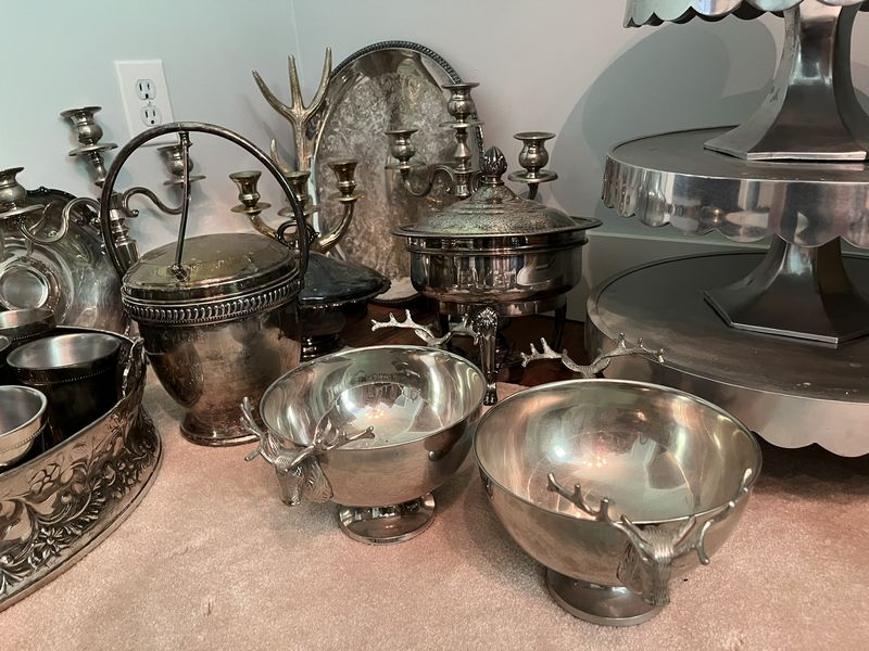 Vintage Metal Entertaining. Leonard silver plated coffee/tea service; International Silver Co dish; antler candelabra, 18”H; pr deer head bowls; cordial cups; platters & tray, incl carving platter, 19”diam; bowls; pedestal cake dishes; S&P; much more. See photos for details and quantities.
