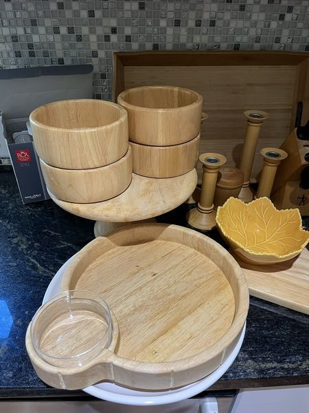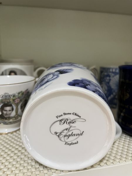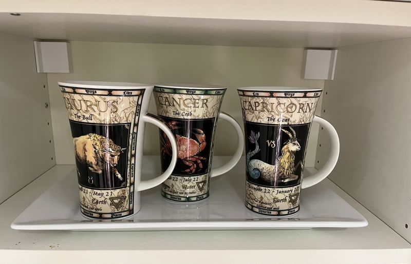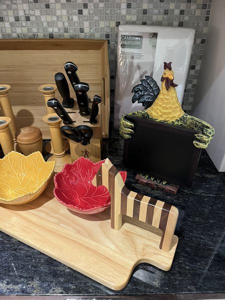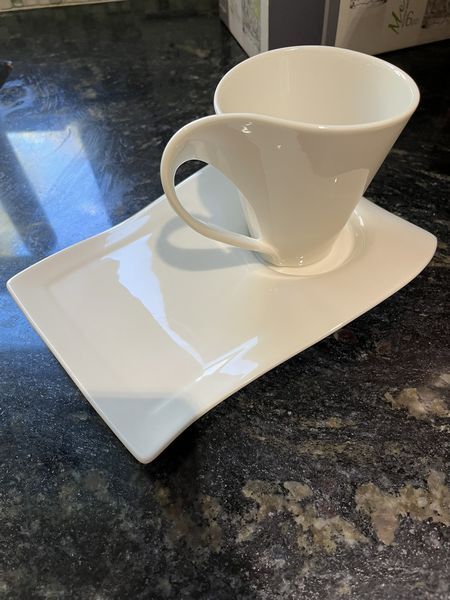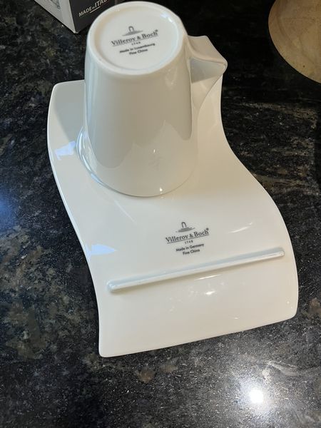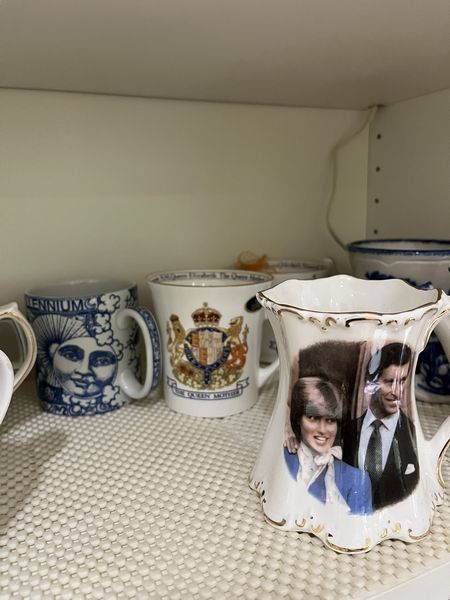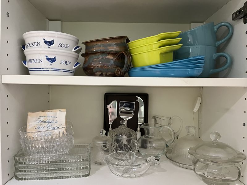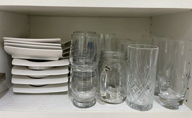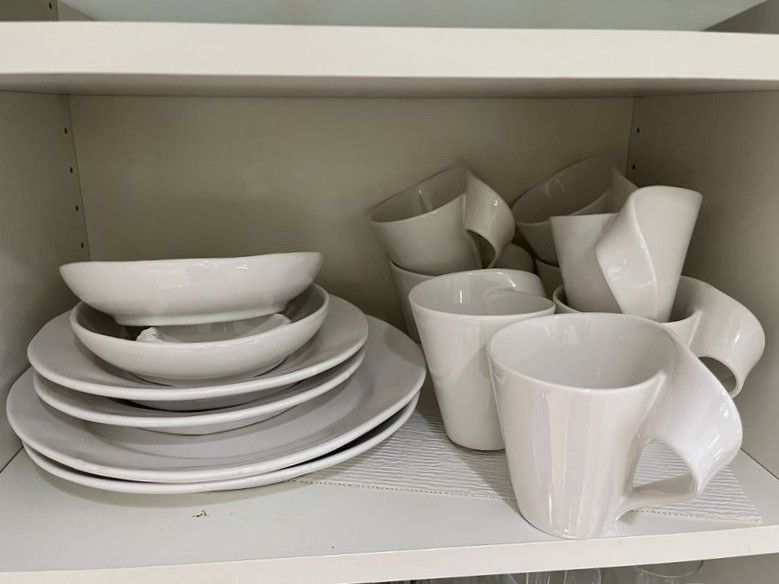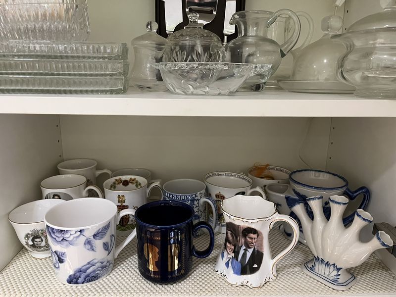 Kitchen Entertaining, featuring Villeroy & Boch. Contents of cabs and counter incl Villeroy & Boch contemporary white plate & cup sets, ser/8; commemorative British memorabilia mugs; soup bowls; Princess House crystal flatware holders; vintage glass creamer & sugar; bud vase (likely Delft); wood bowls & platter; knife set in block; other related items. See photos for more details.