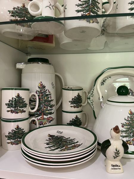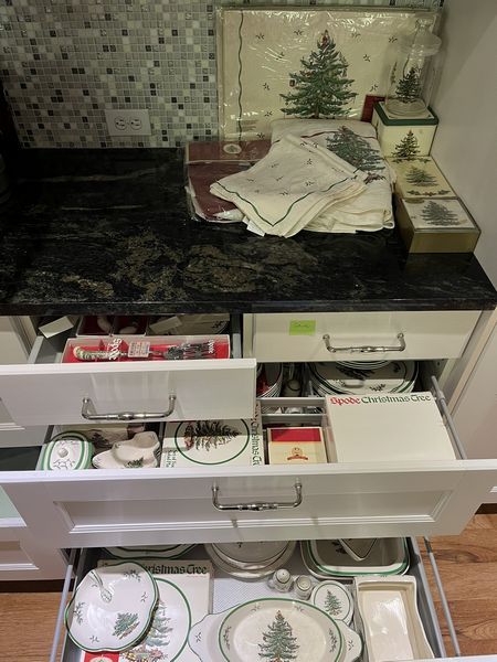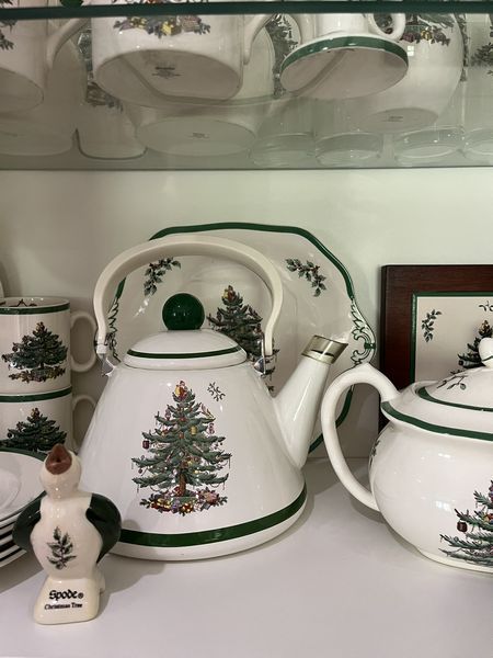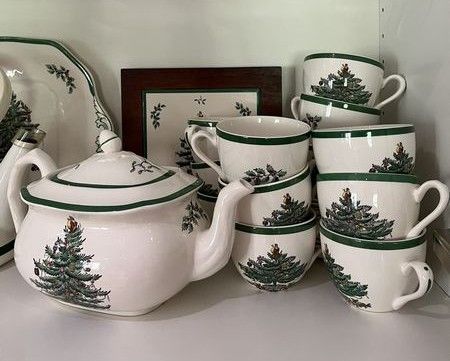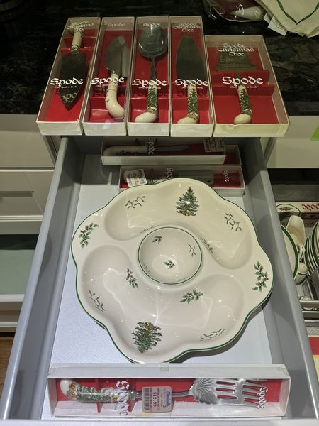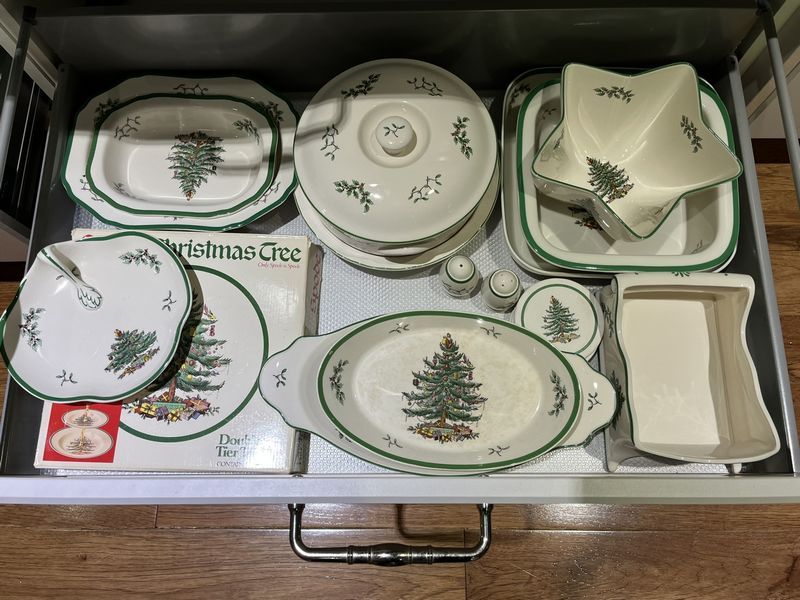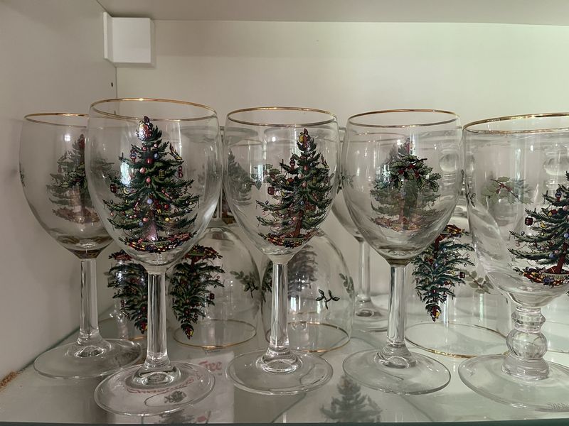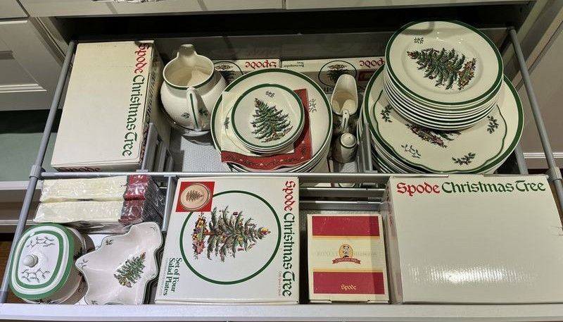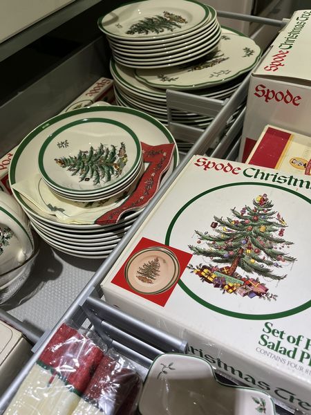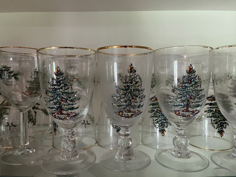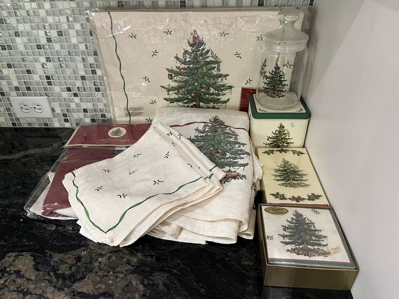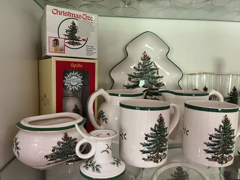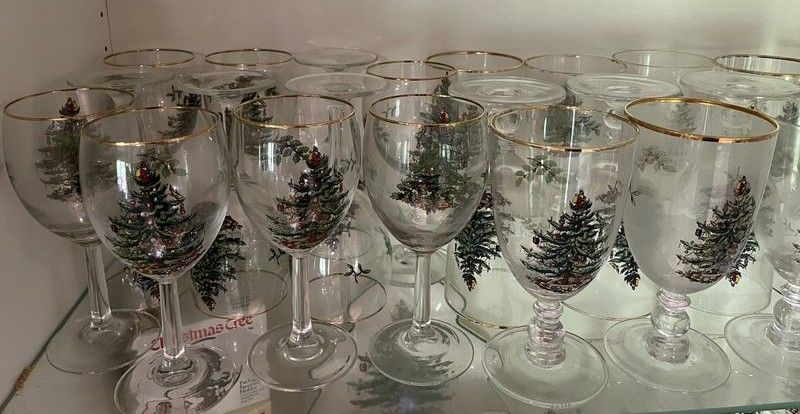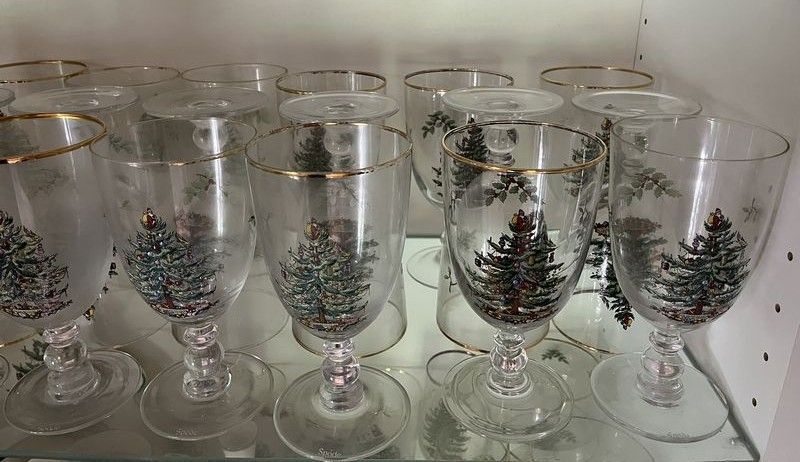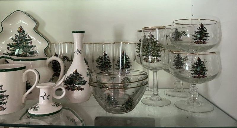 Spode Christmas Entertaining. Expansive Spode collection (over 100 pcs) incl: serv pcs; entertaining pcs; glassware; table linens; much more! Please see photos for details and quantities.