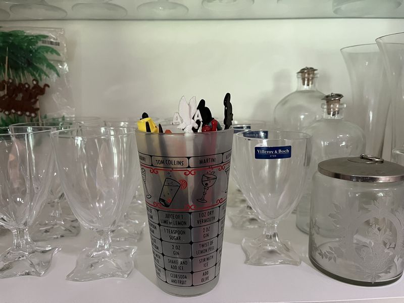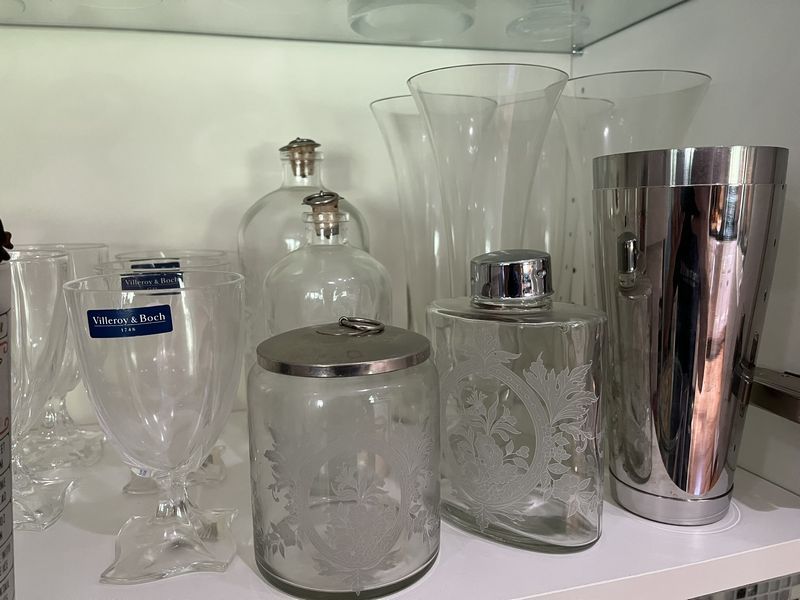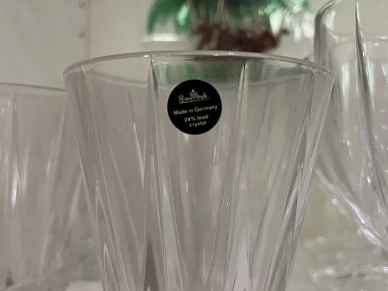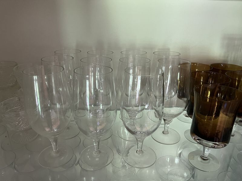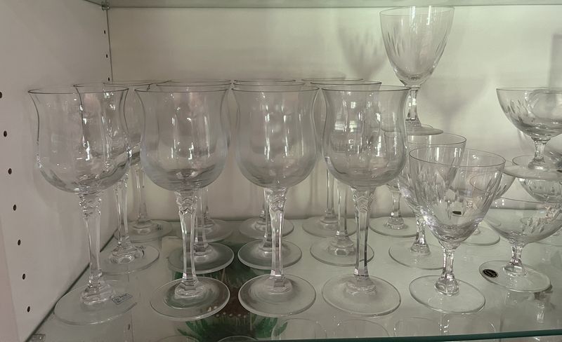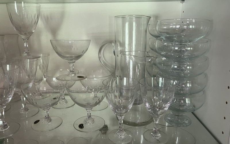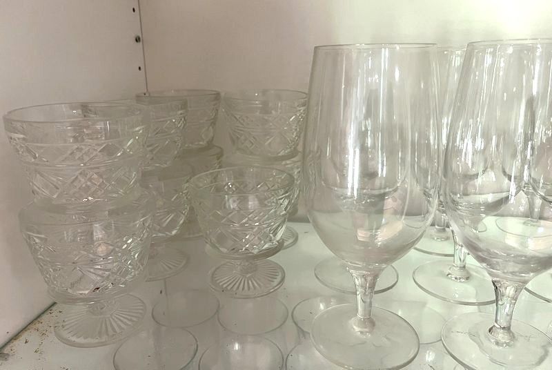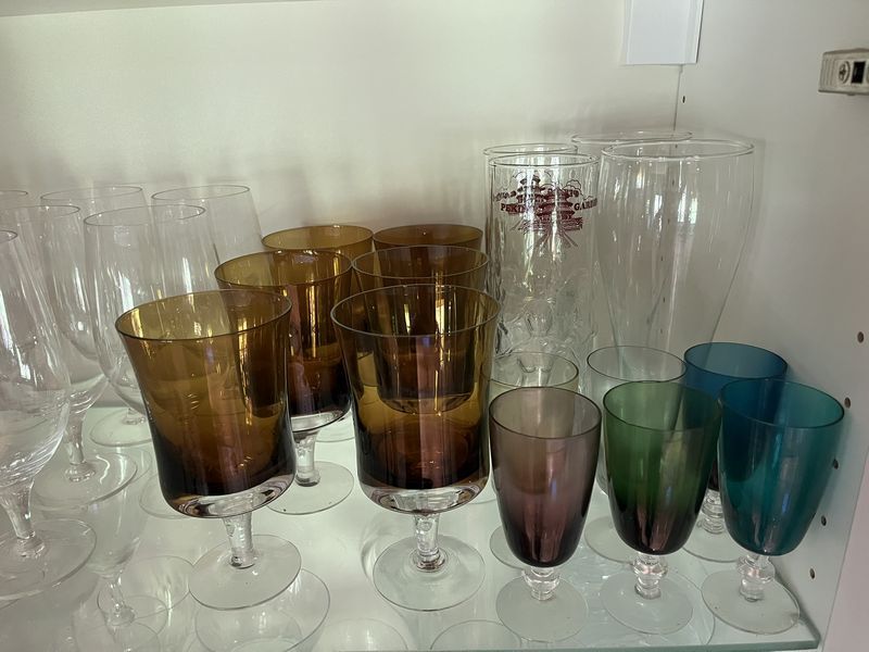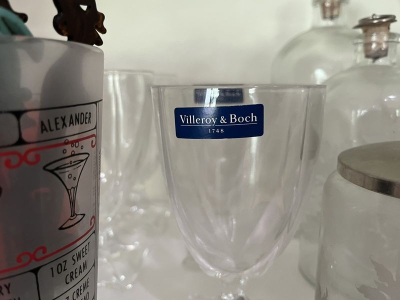 Barware, featuring Villeroy & Boch stemware, Rosenthal Glassware. Clean and colored glass stemware; ice cream cup; bowls; pitcher; more, incl set/6 W. German crystal high ball glasses and set/9 Villeroy & Boch pedestal glasses. See photos for details and quantities.