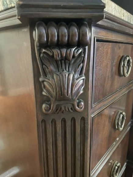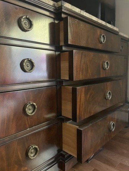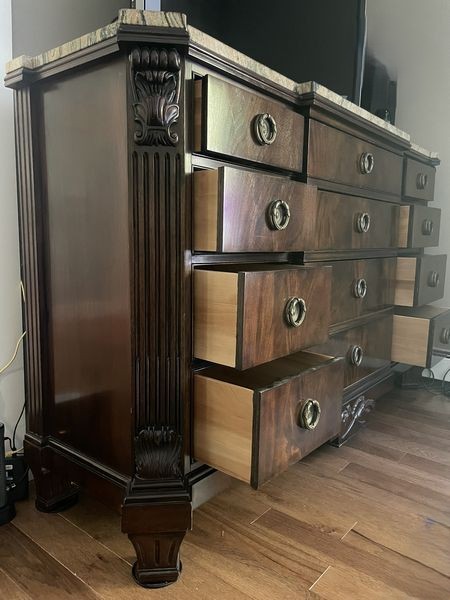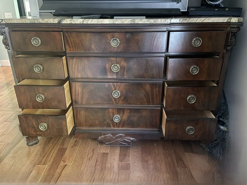 Drexel Heritage Nine Elms Dresser. Drexel Heritage "Nine Elms Collection" 12-drw dresser w/ marble top & original HW (purchased in NC), 74”Wx20”Dx47”H. Other items seen in photos not incl. Extremely heavy, loc on main floor, much bring proper help to safely remove.