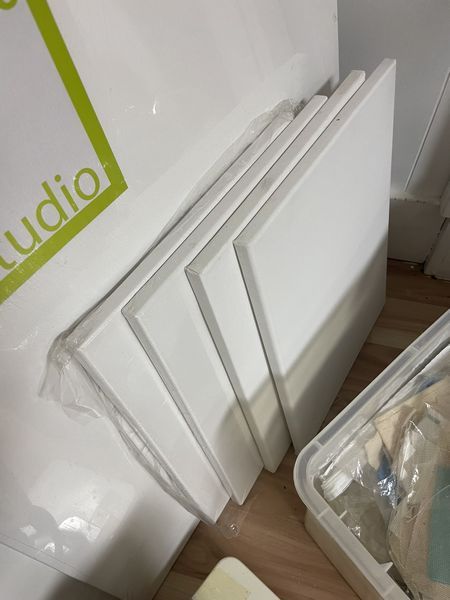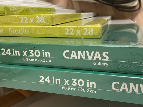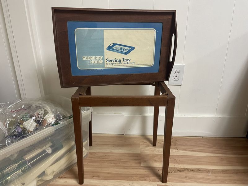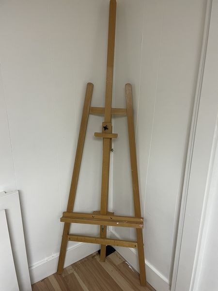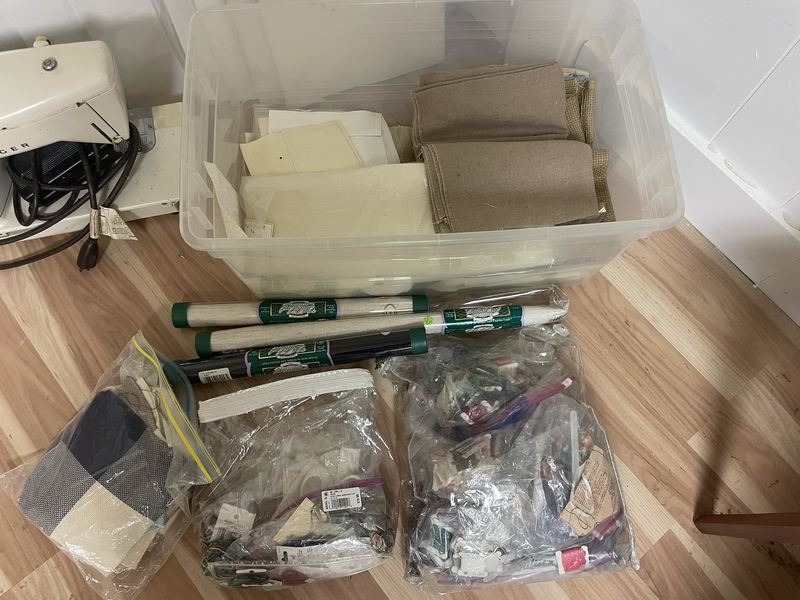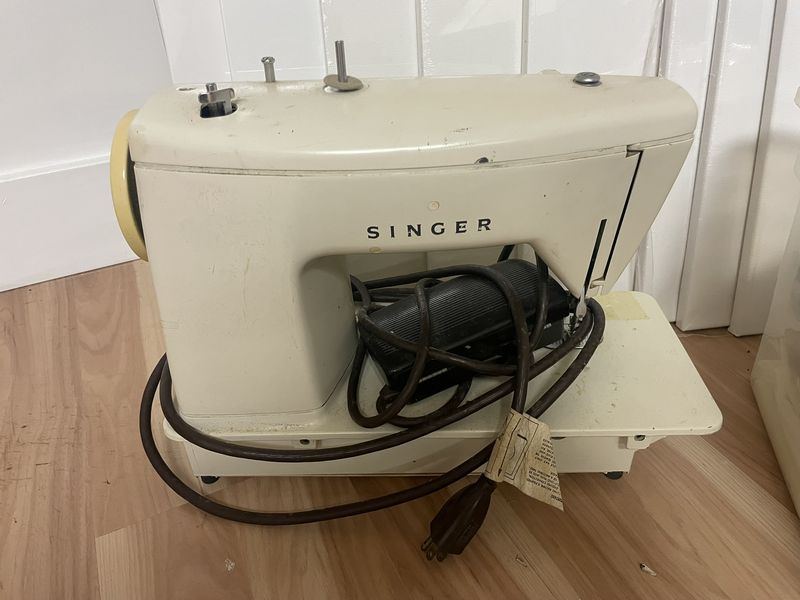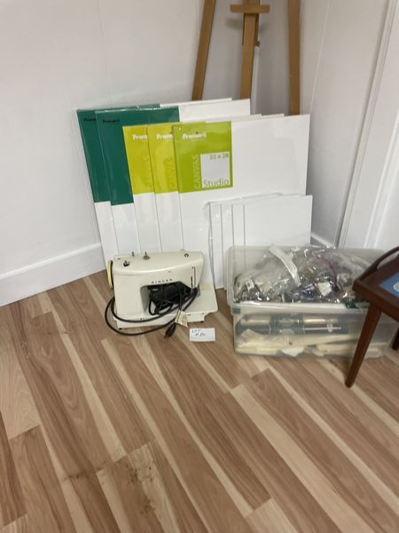 Singer Sewing Machine and Crafts. Singer sewing machine; wood easel, 74”H; wood serving tray/table; painting canvases; trash pail; other related items as seen in photos.