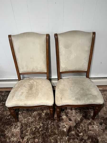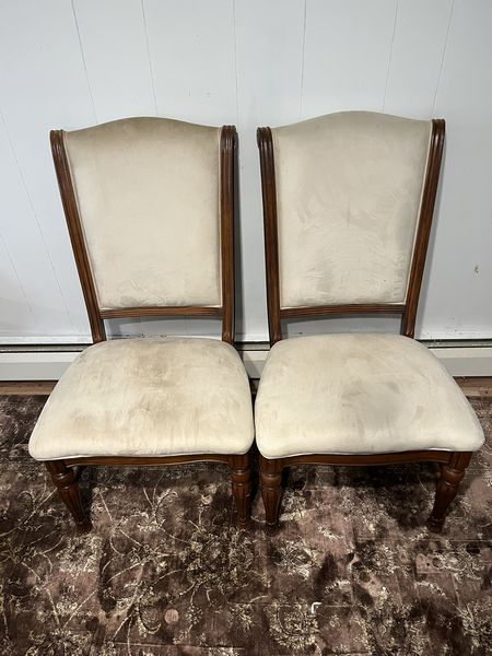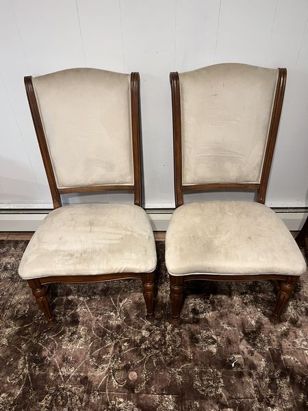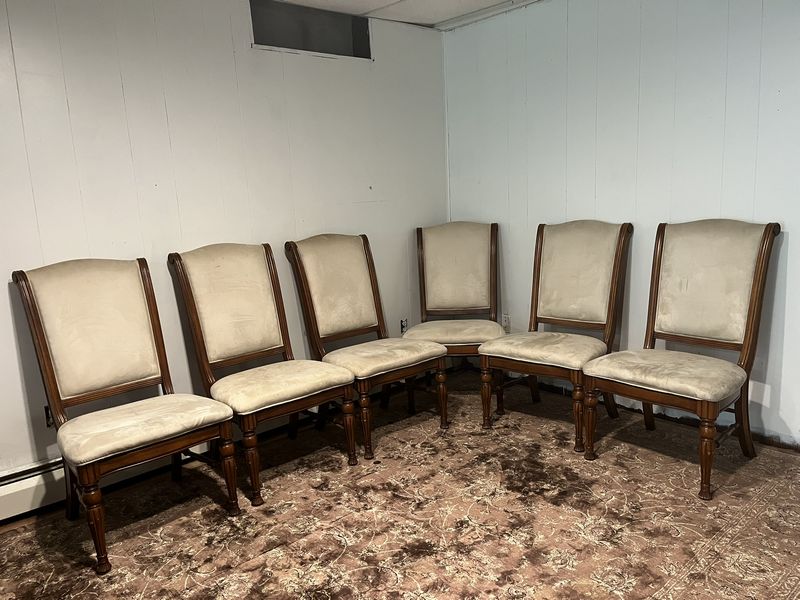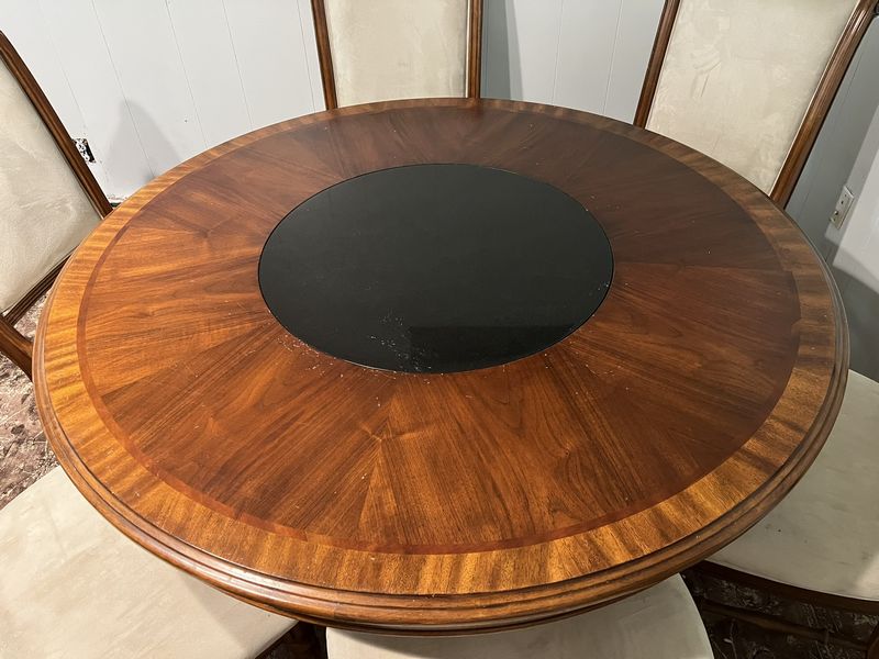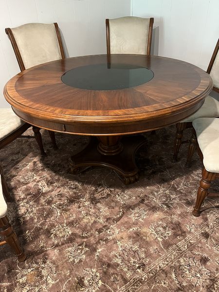 Pedestal Game Table and Chairs, Rug. Round pedestal table, 55”diam w/ center lazy Susan insert; set/6 wood & upholstered chairs (see photos for condition); area rug, 7'x10'.