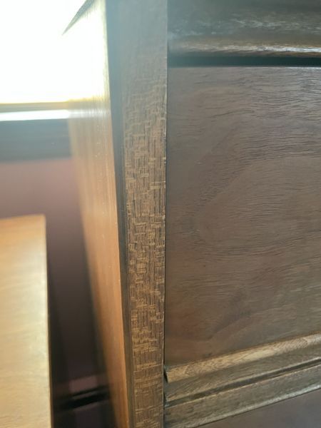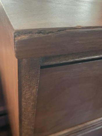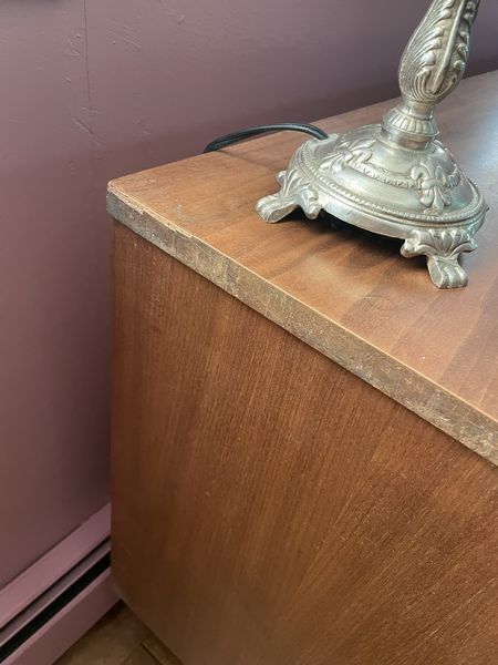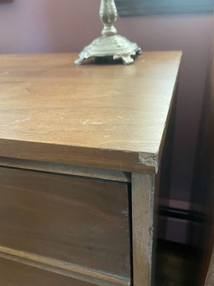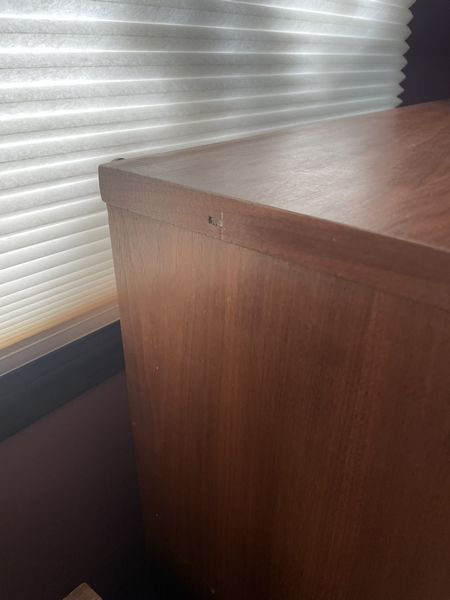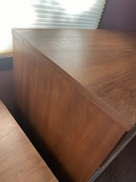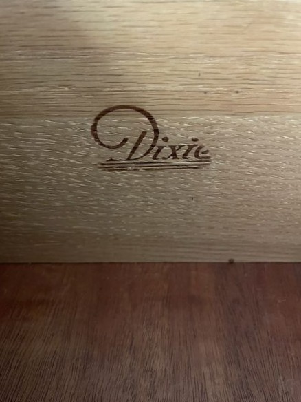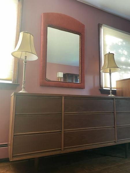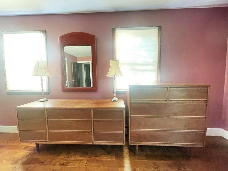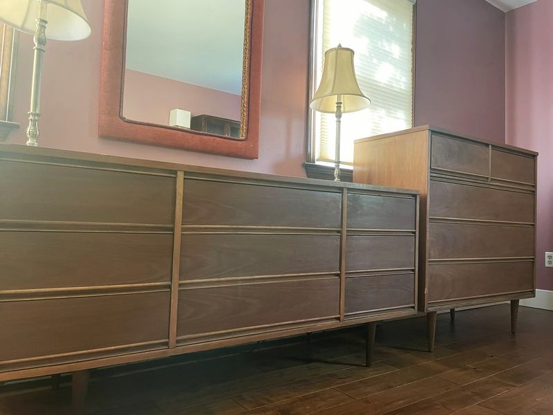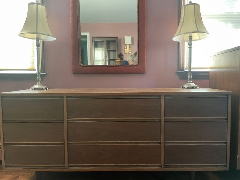Dixie Mid Century Modern Bedroom Furniture. Incl: 9-drw MCM dresser (dovetailed), 63"Wx19"Dx30"H; 5-drw MCM chest (dovetailed), 41"Wx19"Dx42"H; wood framed wall mirror; pr pencil lamps w/ shades, ea. 30"H. See photos re condition of dressers. Loc on 2nd floor.