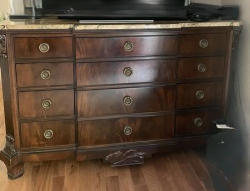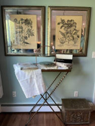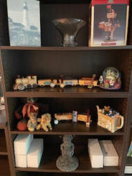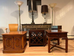 Items include Thomasville dining room set; Royal Worcester Evesham China; Louis XV style console table; camelback sofa; Asian-style shelving units; Lladro figurines; Mid Century Modern sectional sofa; glass decor: Lenox/Delft/Wedgewood/Rosenthal; Asian inspired wall art; steins; Spode Christmas entertaining items; Singer sewing machine; pedestal game table/chairs; Villeroy & Boch stemware; mirrored botanical prints; Drexel Heritage Nine Elms dresser; Sony 60" TV; Cuisinart griddler; Santa Fe quesadilla maker; Disney watches & more. Items are located in Ledyard, CT.