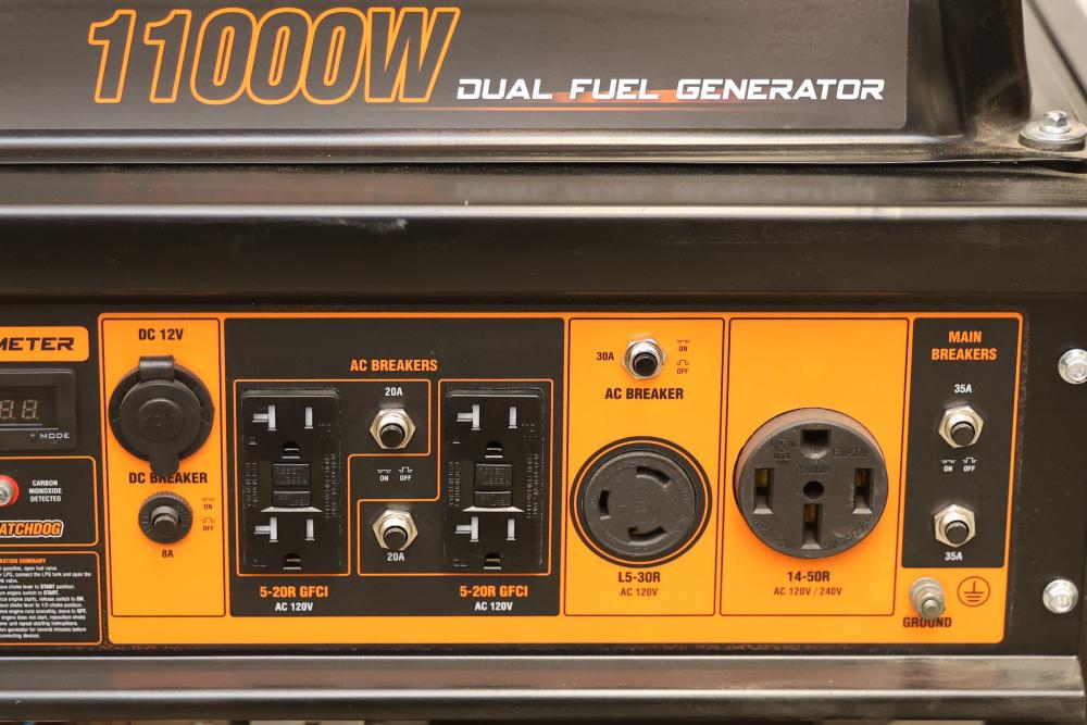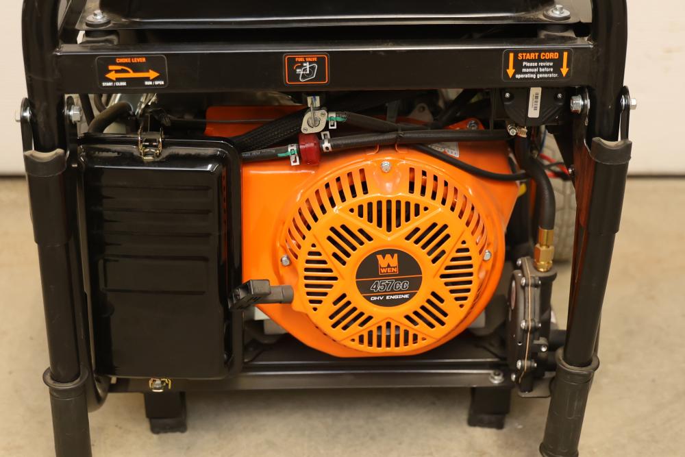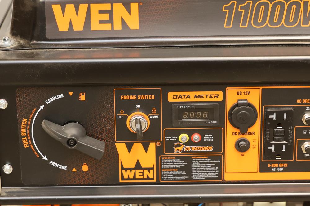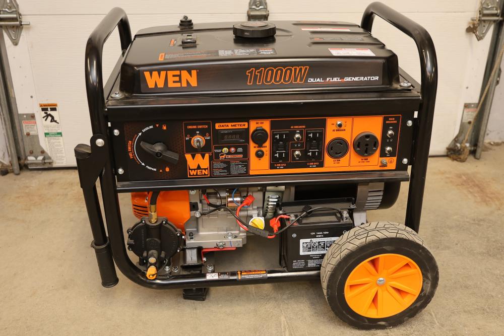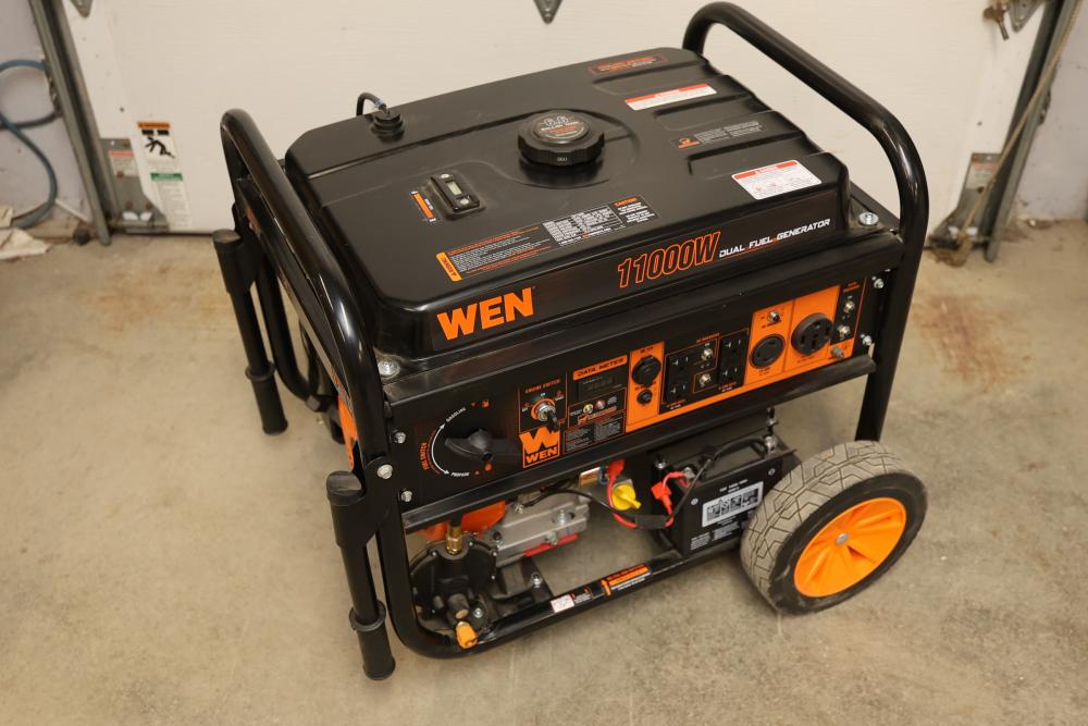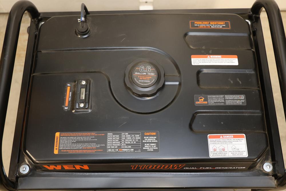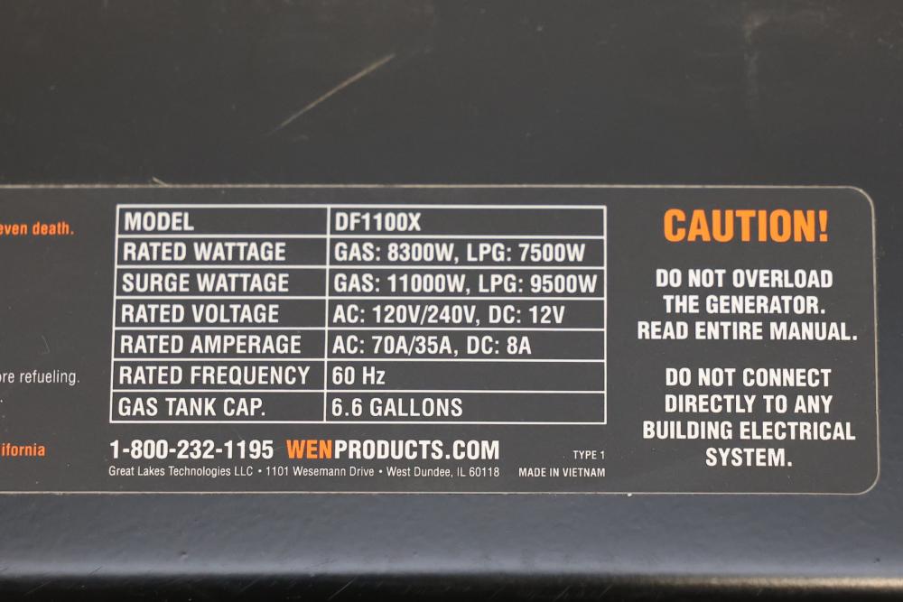 WEN DF1100X dual fuel generator offering dual-fuel capability using gasoline or propane. Rated wattage is 8,300W (gas) and 7,500W (propane), with surge wattages of 11,000W (gas) and 9,500W (propane). Rated voltage is 120V/240V AC and 12V DC. The fuel tank capacity is 6.6 gallons. Features a wheel kit for portability. Working condition. Pickup only.