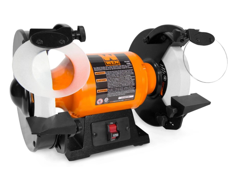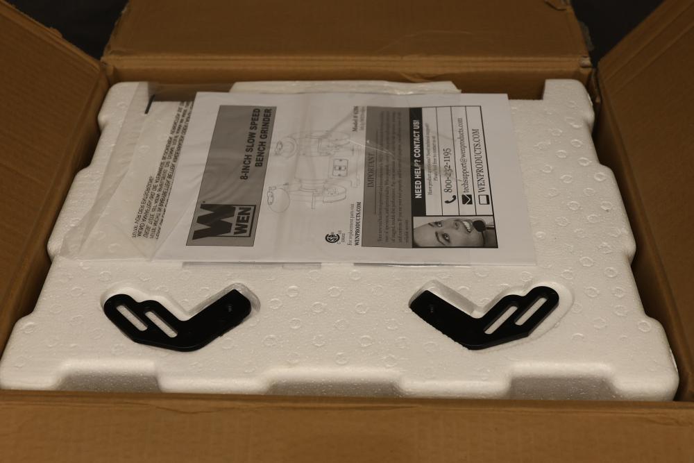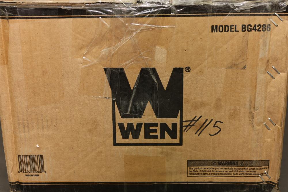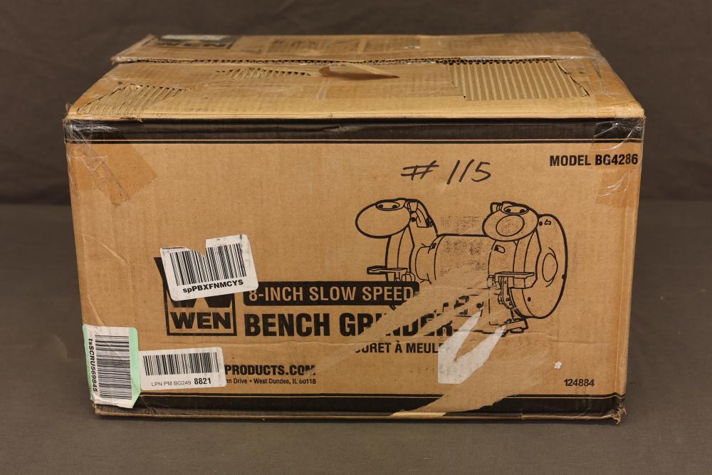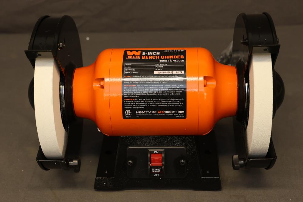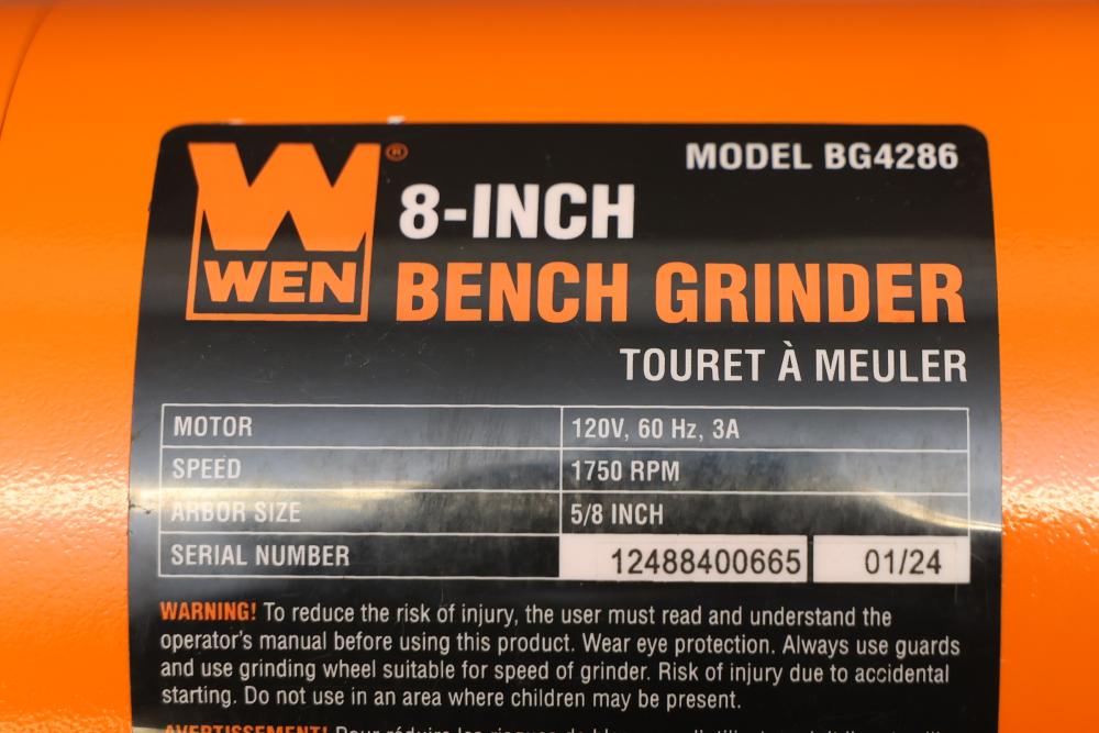 WEN 8-inch slow speed bench grinder, Model BG4286, with a 120V, 60 Hz, 3A motor running at 1750 RPM. Features 5/8-inch arbor size and includes original packaging. Serial number: 1248400665, manufactured in 01/24. Working condition. Pickup only.