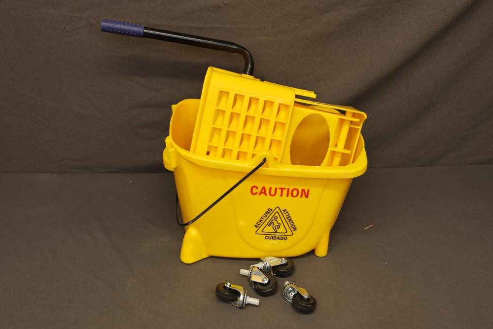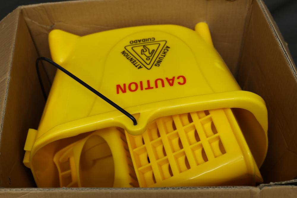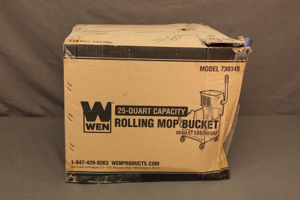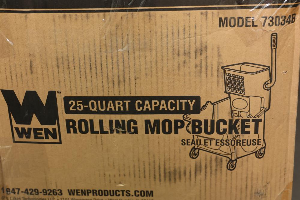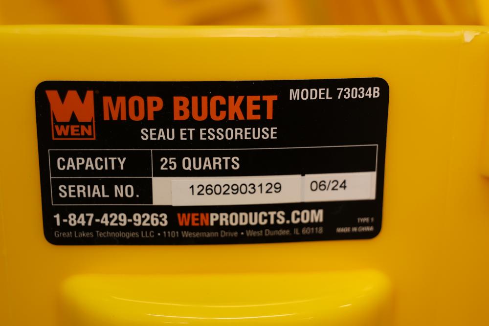 WEN Model 73034B rolling mop bucket with a 25-quart capacity. Features a durable design and integrated wringer. Serial number of 12602903129 with a production date of June 2024. Working condition. Pickup only.