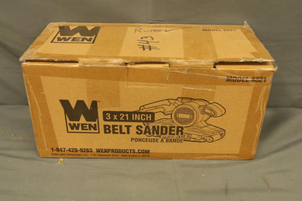 Wen 3 x 21 inch belt sander, model 6321, featuring a lightweight design with front roller and dust collection system. Working condition.