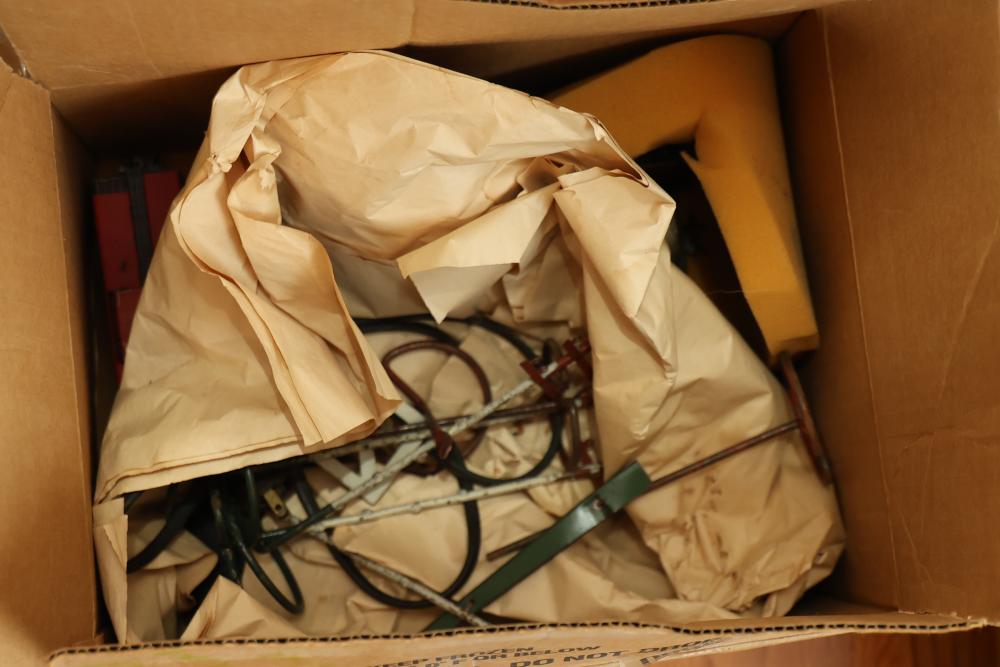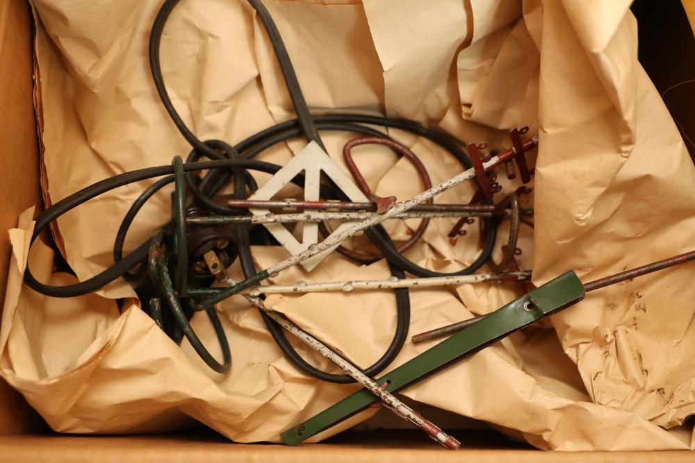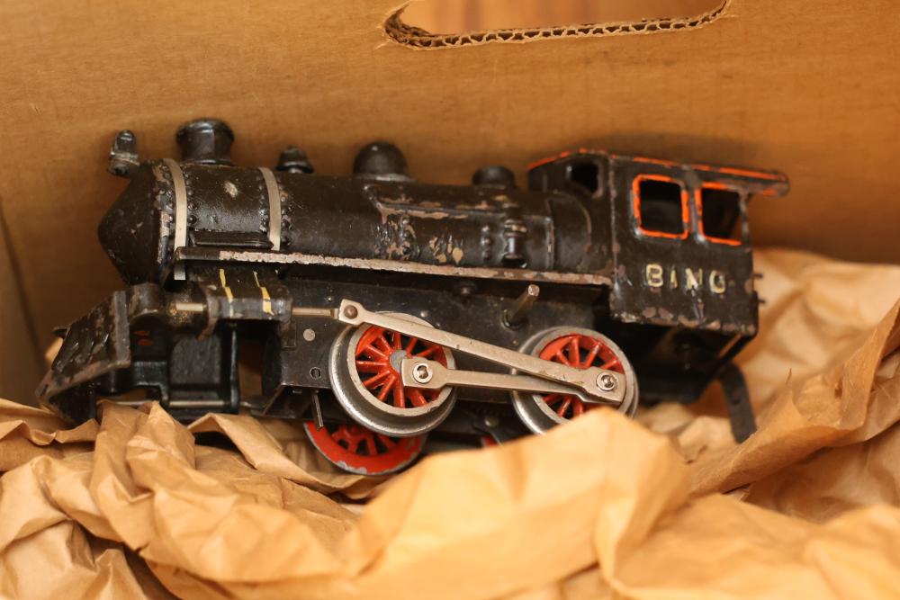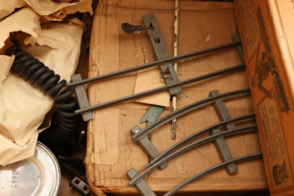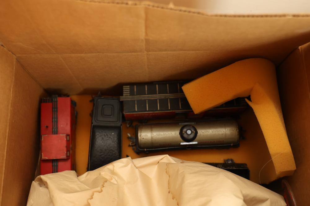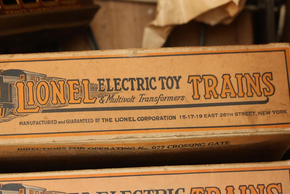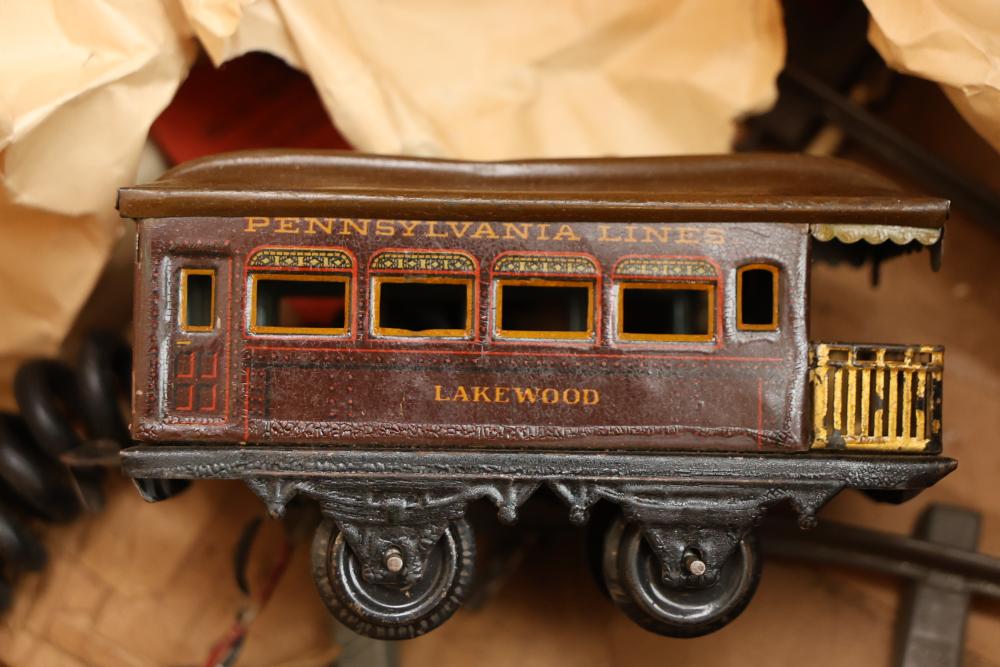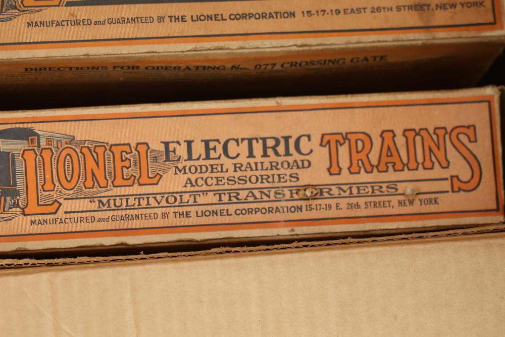 Lionel Electric Toy Trains and Accessories includes boxed transformers, metal railroad tracks, a Pennsylvania Lines 'Lakewood' passenger car, a Bing steam locomotive, and additional components. Seller believes from 1930s.