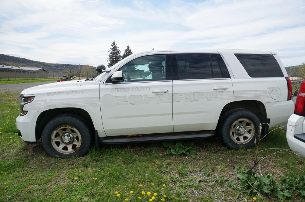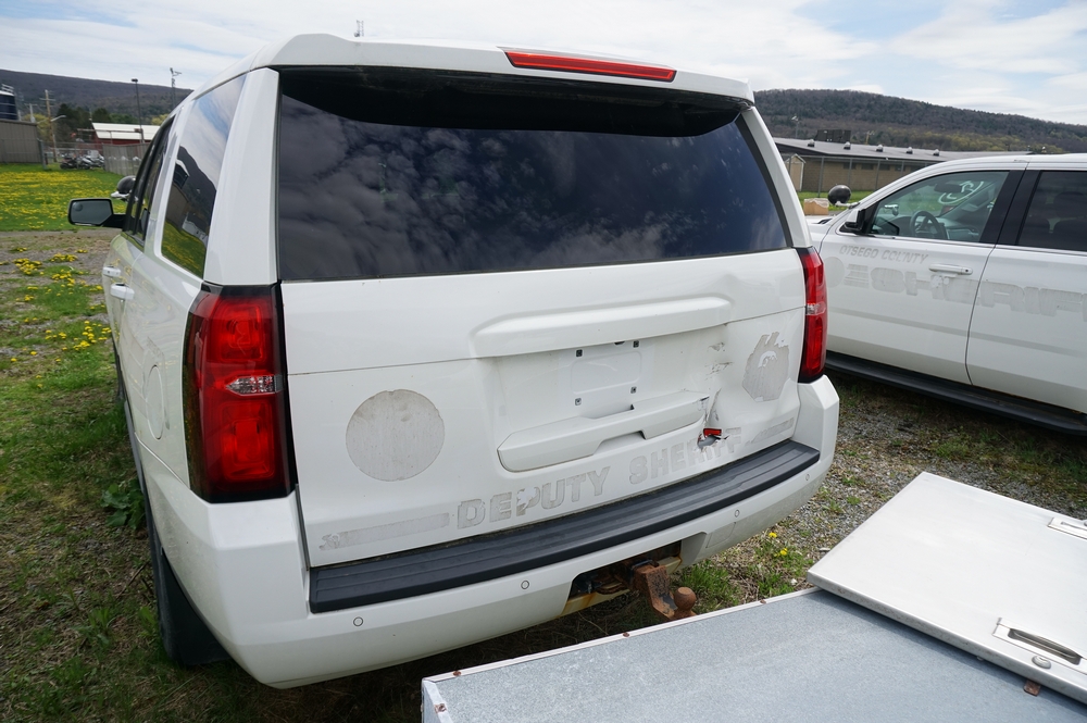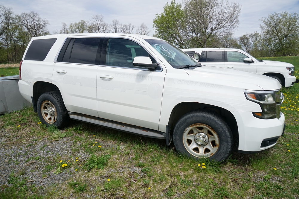 Items include 2014 Ford E-350 Super Duty XL passenger van; 2015, 2017, 2018 Chevrolet Tahoes; 2002 Honda NSS250 (REFLEX) motor scooter; 2005 Yamaha RX-1 snowmobile; police light bars; Havis console mounts; police radios/speakers/monitor; AFX Motorsport helmets & more. Items are located in Cooperstown, NY.