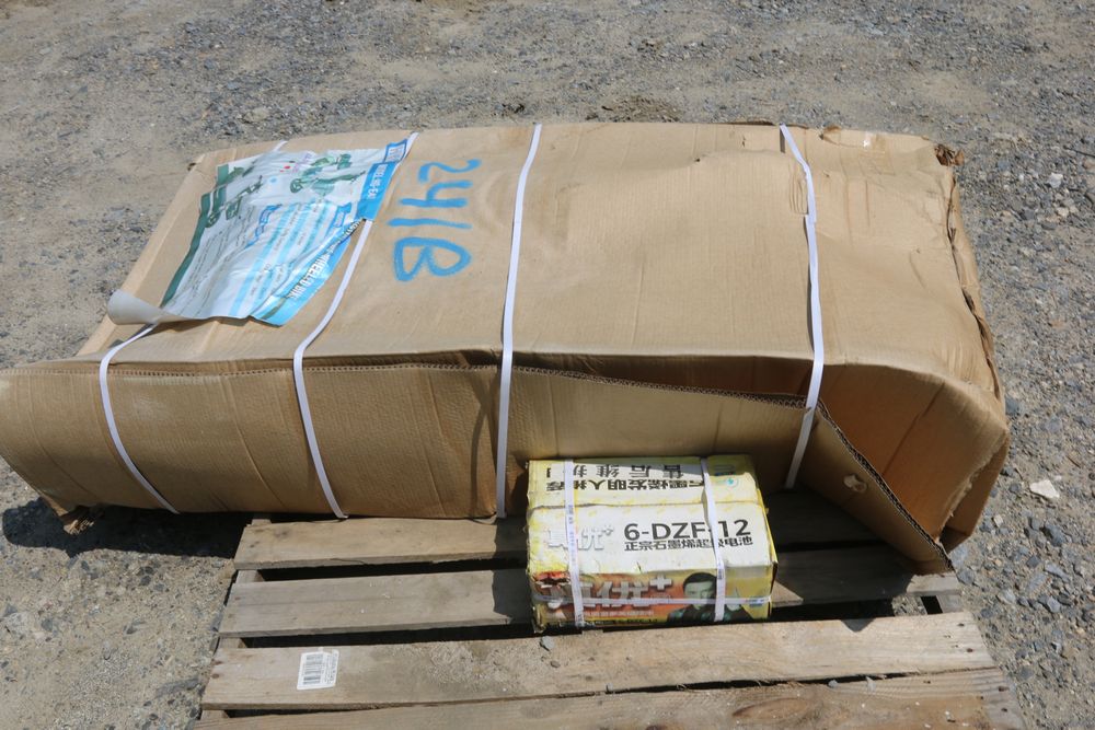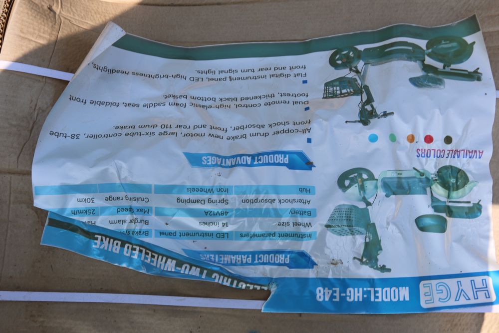 Hyce Model HG-E48 electric two-wheeled bike with features including a 48V12Ah lithium battery, a 350W motor, and a top cruising range of 30km. Additional specifications include spring damping shock absorption and steel spoke hub wheels. LED headlight, brake lamp, and turn signal lights are included. The item is in its original packaging, though there is visible wear on the outer cardboard.