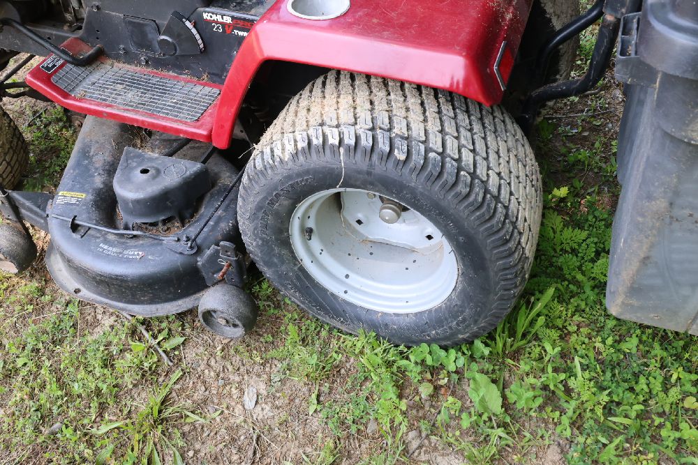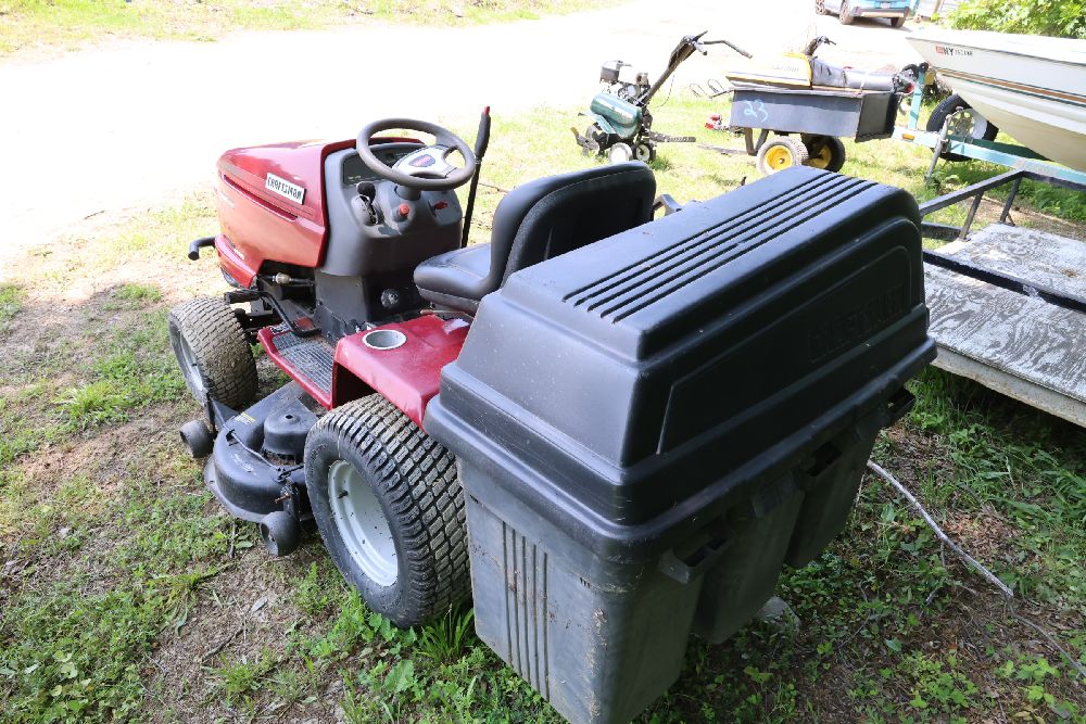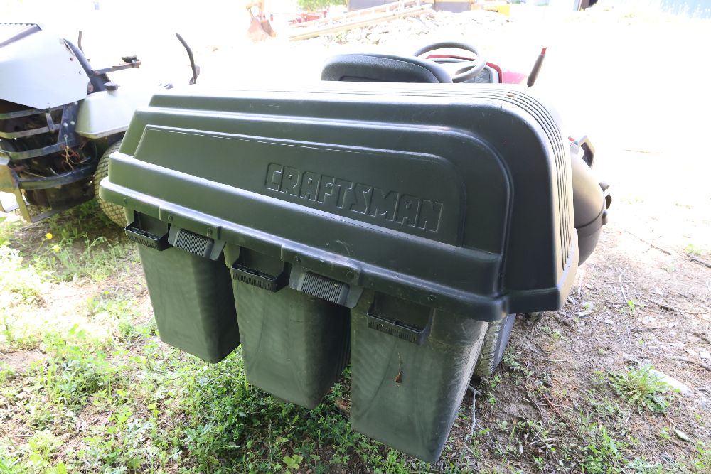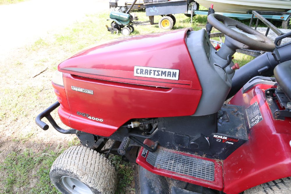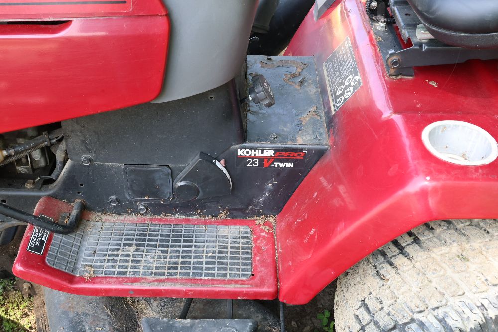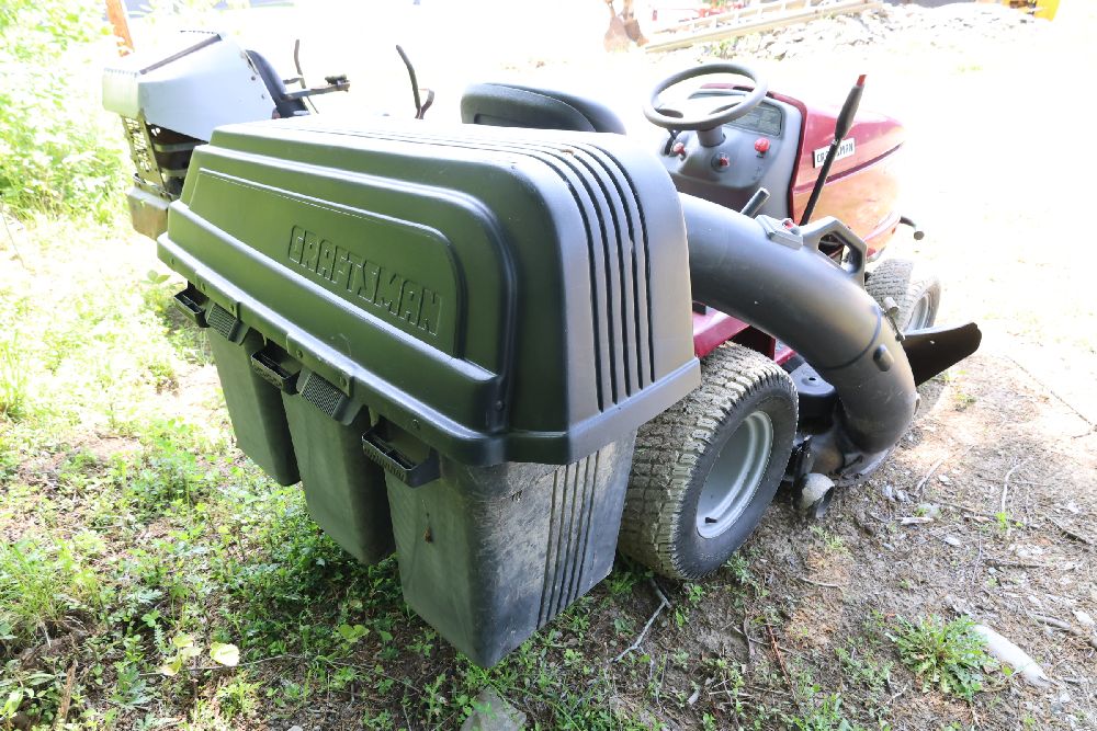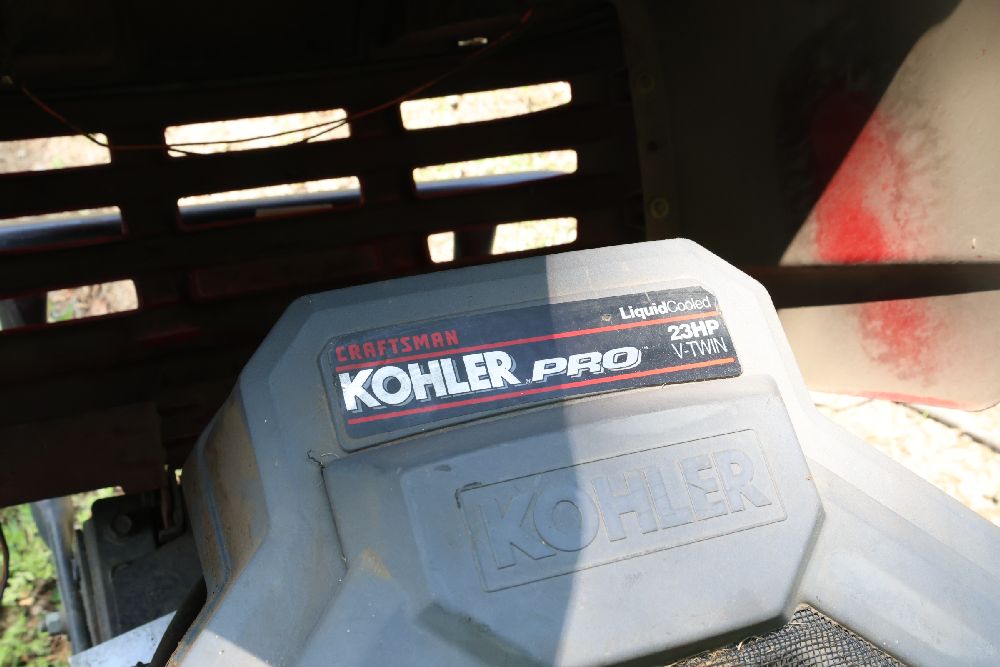 Craftsman riding lawn mower featuring a Kohler Pro engine with 23 horsepower and a V-twin OHV configuration. Equipped with a bagger attachment and a 46-inch cutting deck. The hour meter indicates 683.3 hours of usage. Includes an adjustable seat and operating instructions on the dashboard. Seller reports: needs battery.