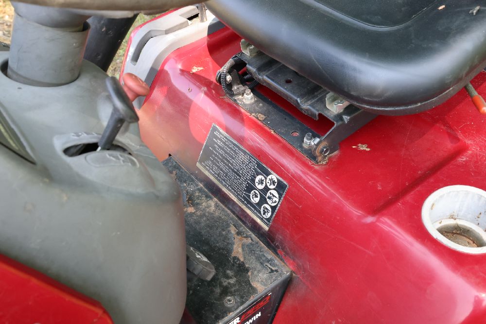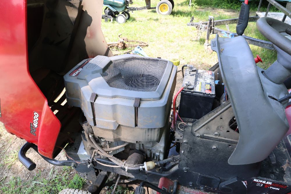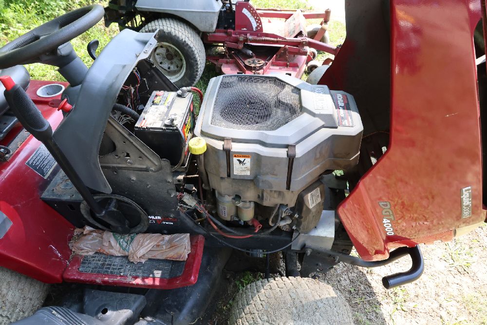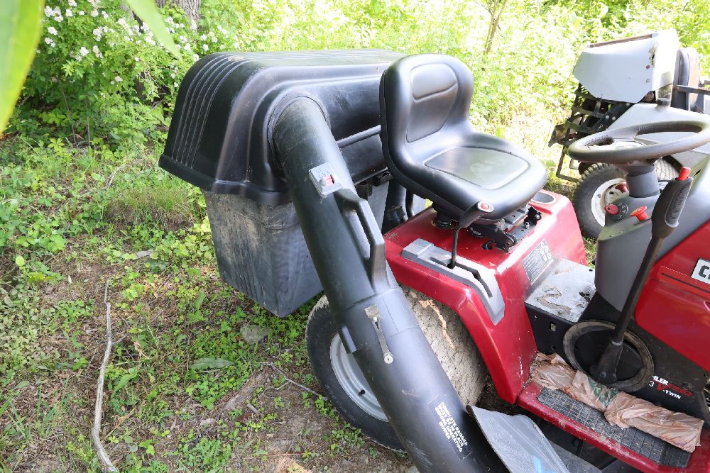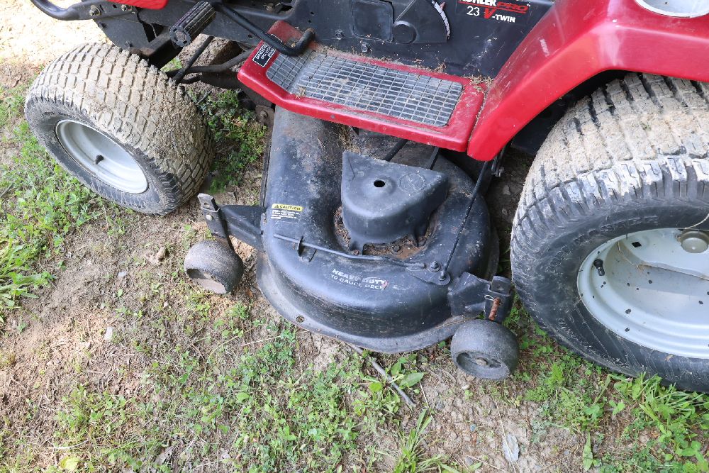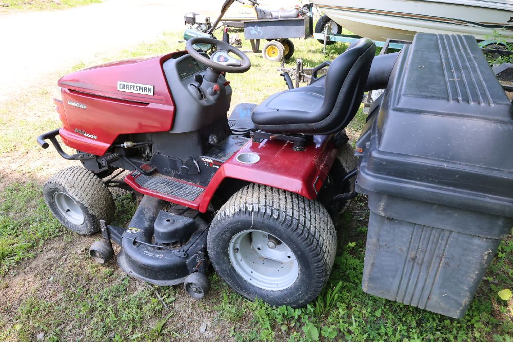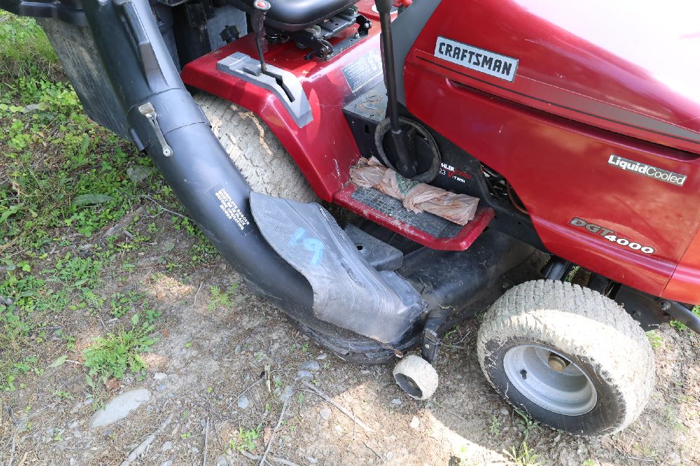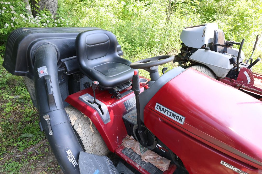 Craftsman riding lawn mower featuring a Kohler Pro engine with 23 horsepower and a V-twin OHV configuration. Equipped with a bagger attachment and a 46-inch cutting deck. The hour meter indicates 683.3 hours of usage. Includes an adjustable seat and operating instructions on the dashboard. Seller reports: needs battery.