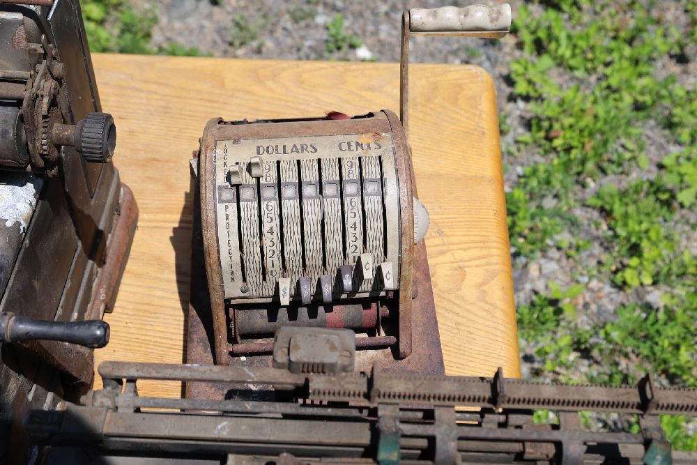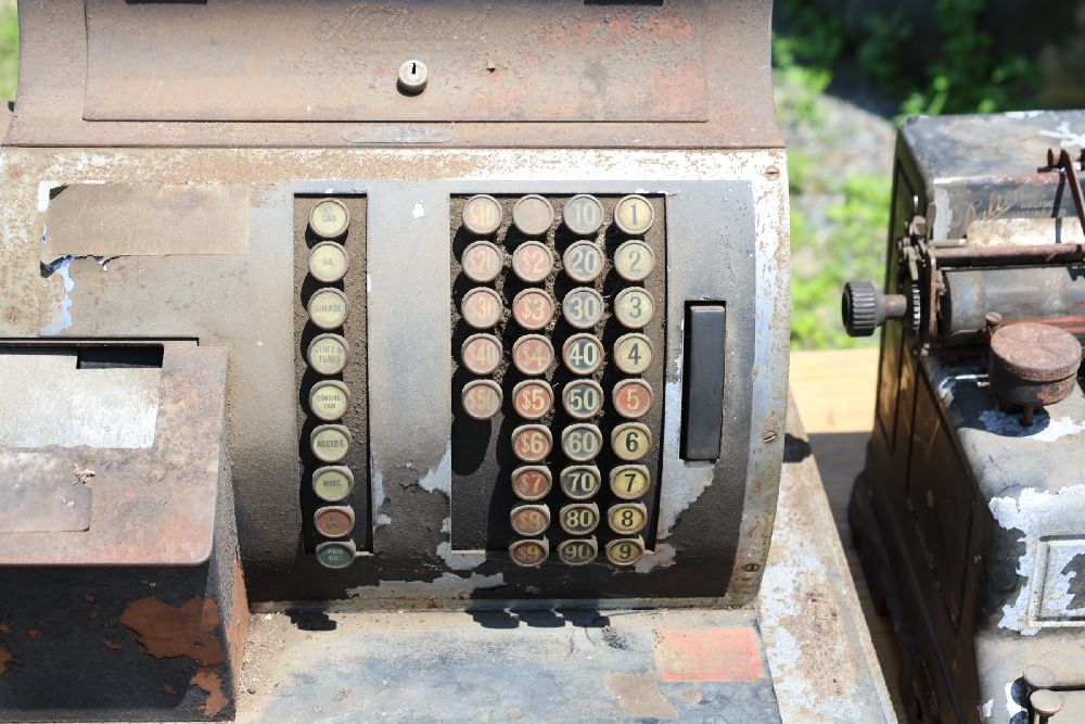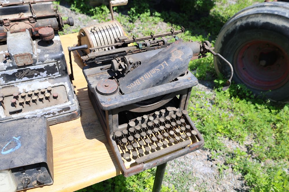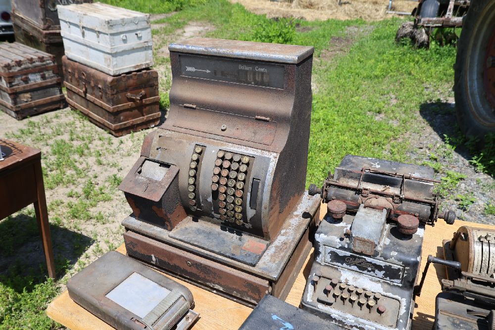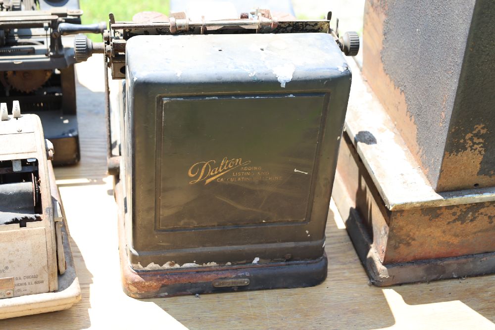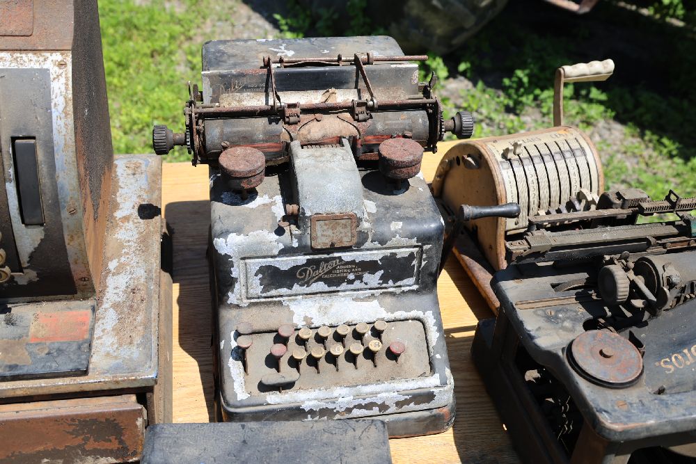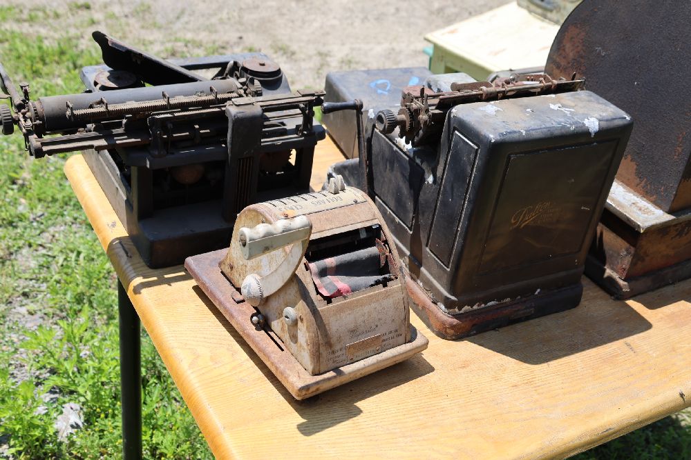 Vintage mechanical devices, including a cash register, typewriters, and additional equipment. The cash register features numeric keys and a display panel.