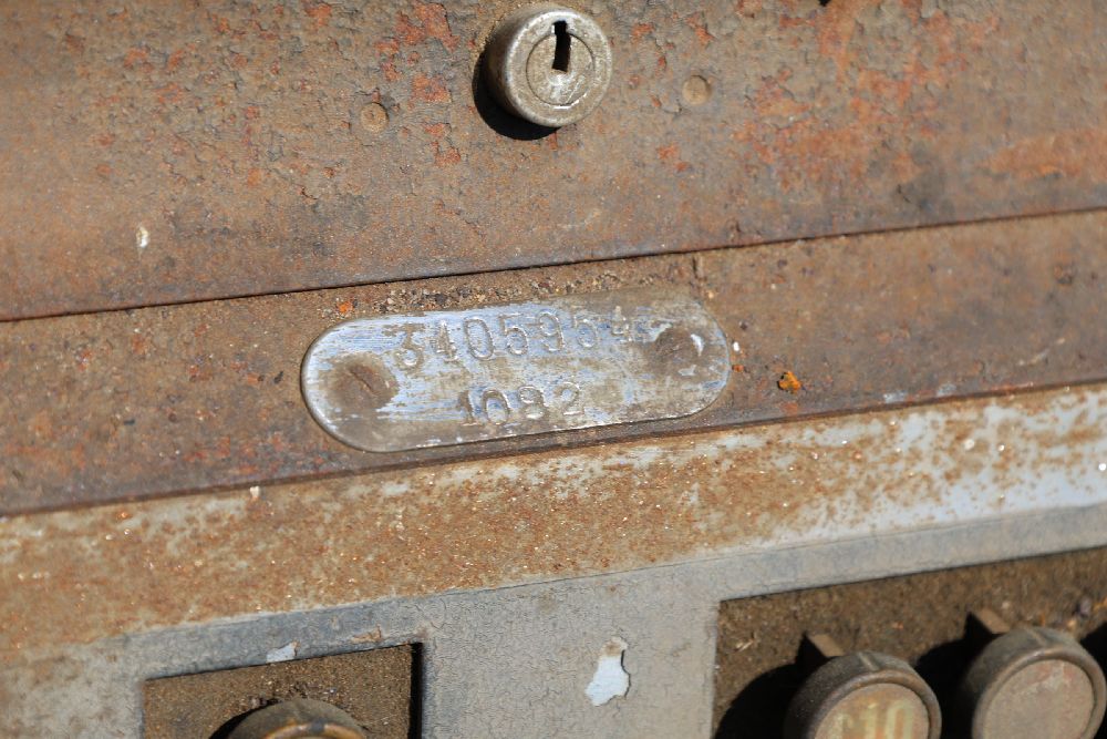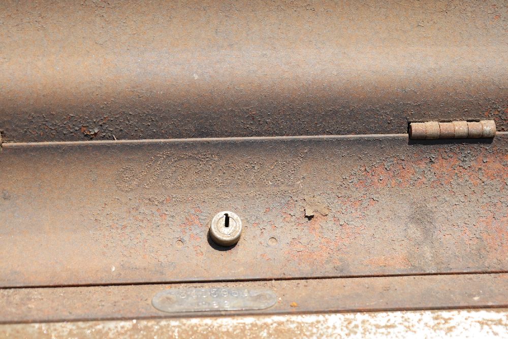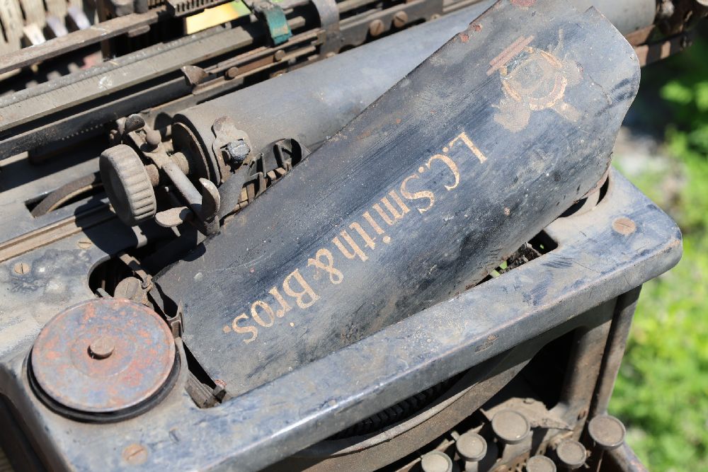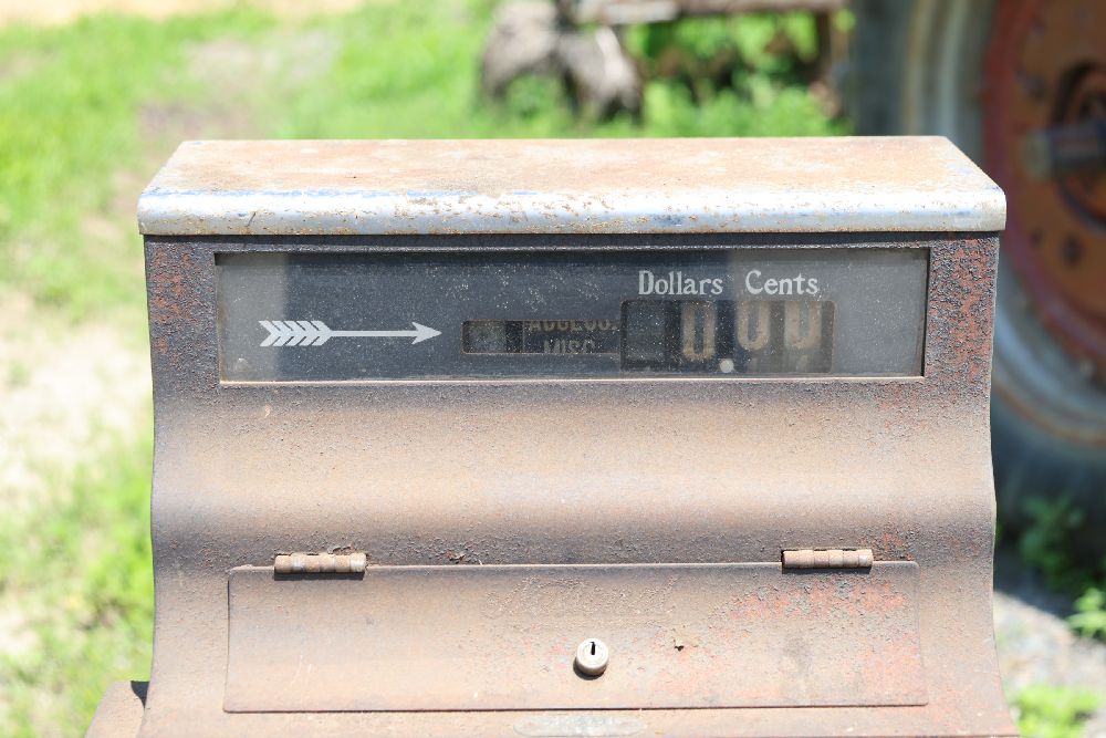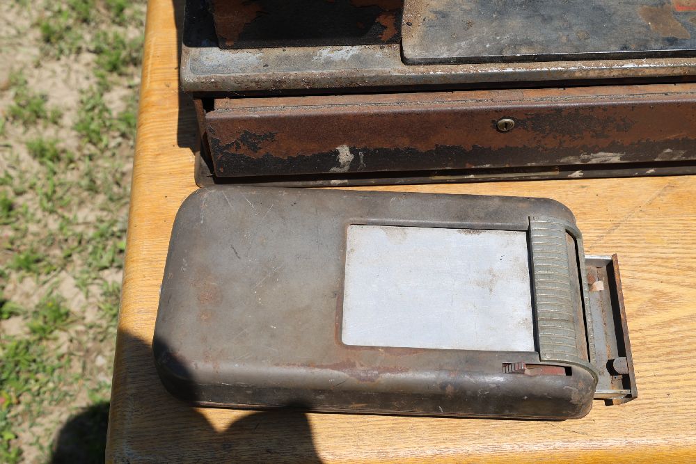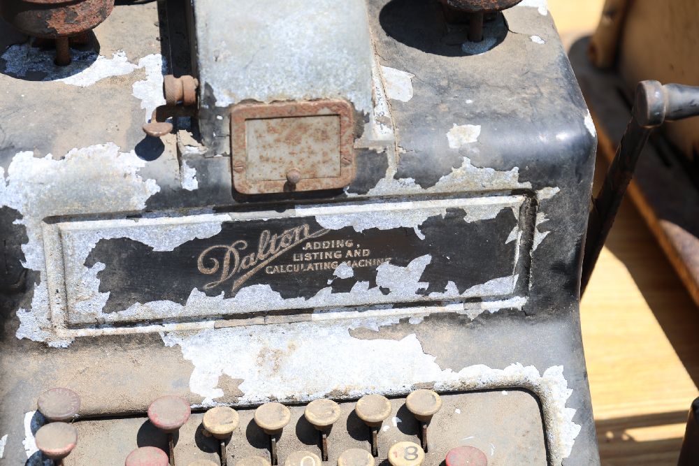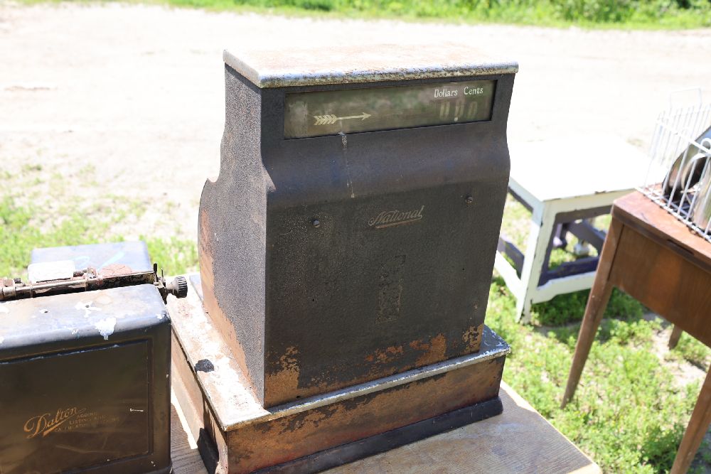 Vintage mechanical devices, including a cash register, typewriters, and additional equipment. The cash register features numeric keys and a display panel.