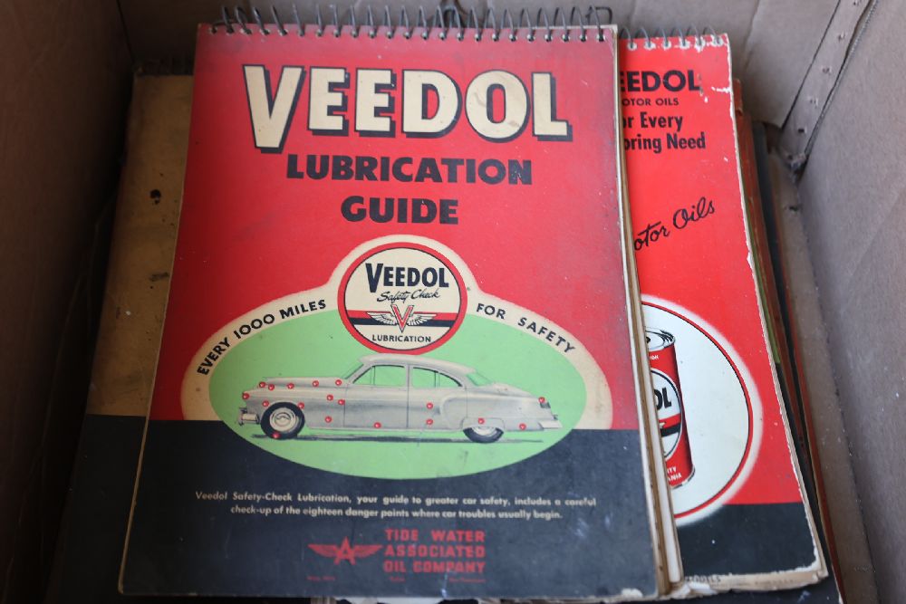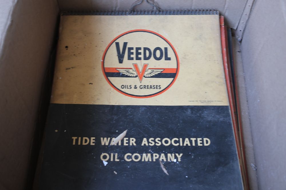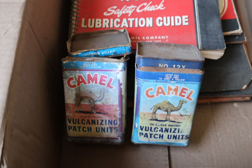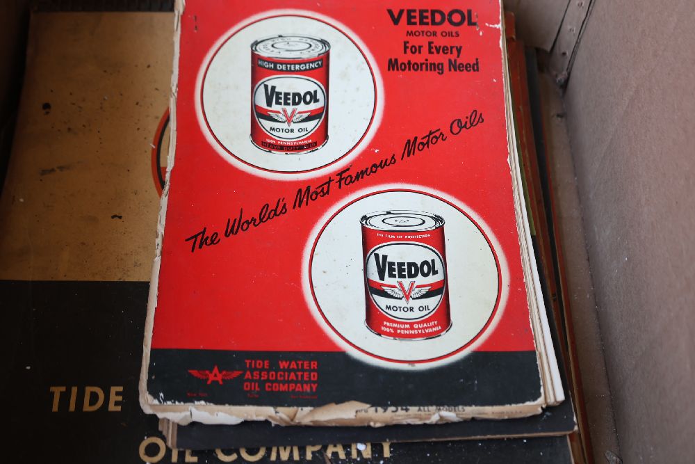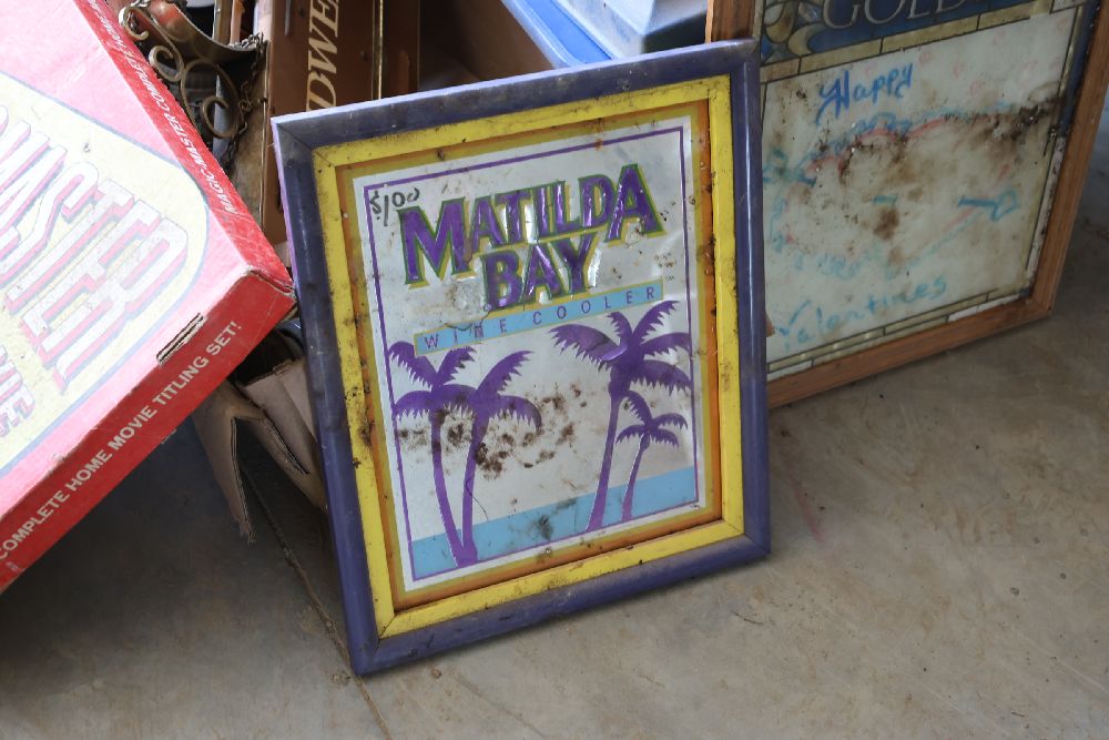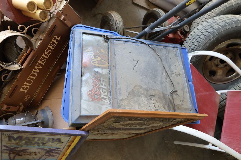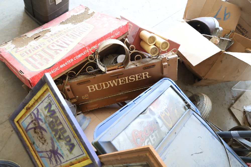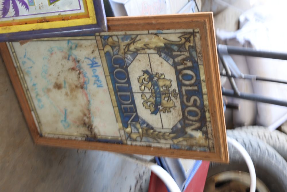 Includes components such as vintage automotive parts, Veedol lubrication guides, Camel vulcanizing patch units, framed advertising signs for brands including Molson, Doral, and Matilda Bay, and other items like a Budweiser-branded metal piece.