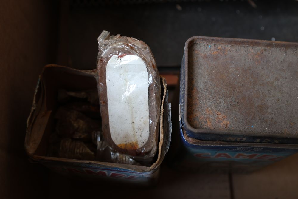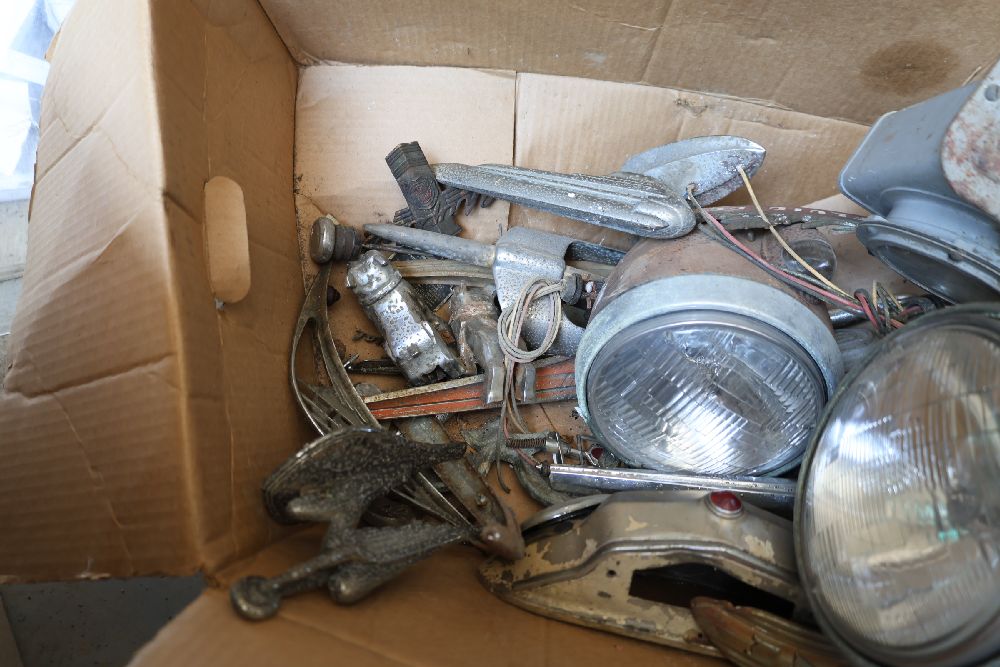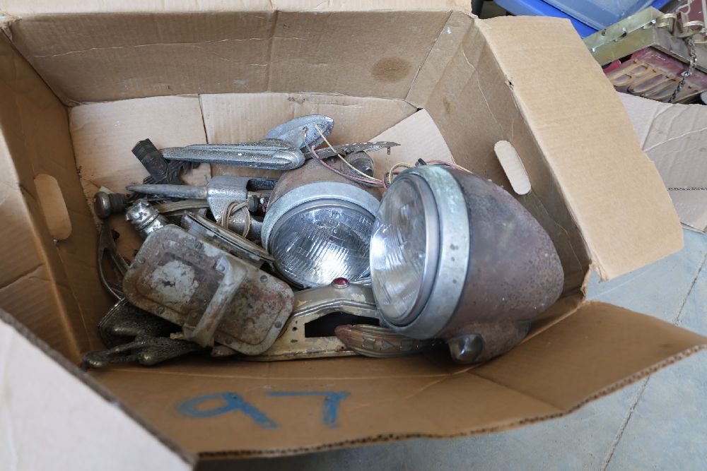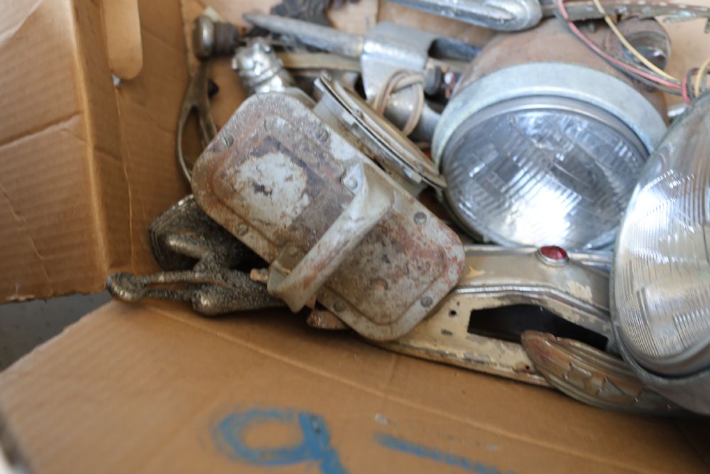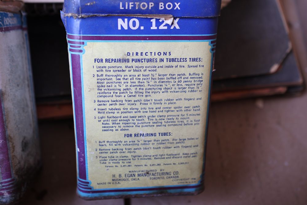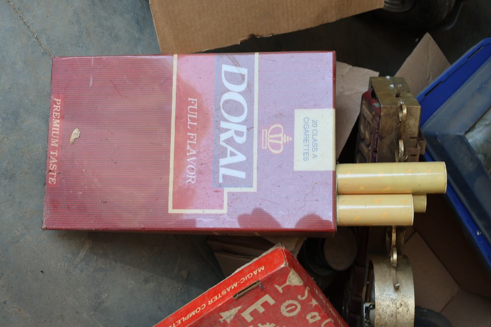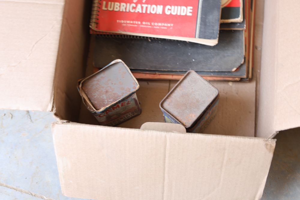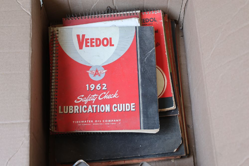 Includes components such as vintage automotive parts, Veedol lubrication guides, Camel vulcanizing patch units, framed advertising signs for brands including Molson, Doral, and Matilda Bay, and other items like a Budweiser-branded metal piece.