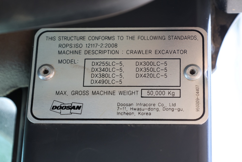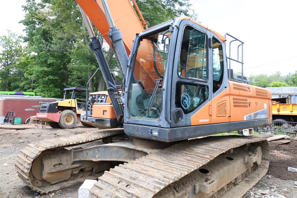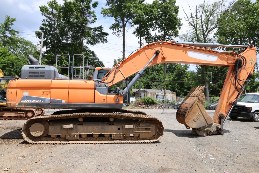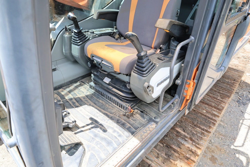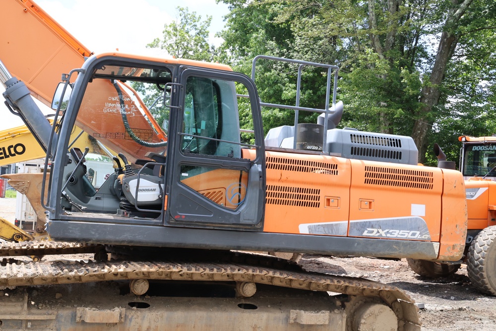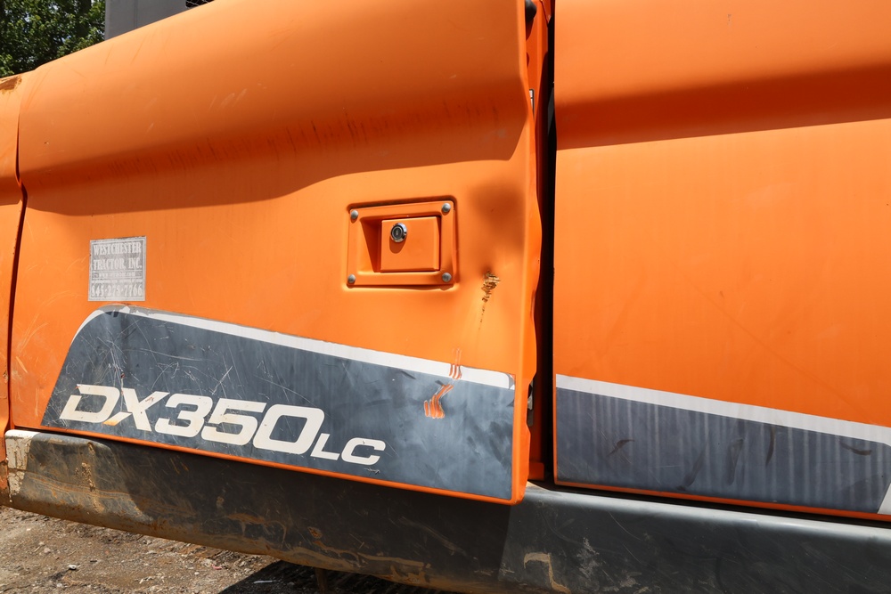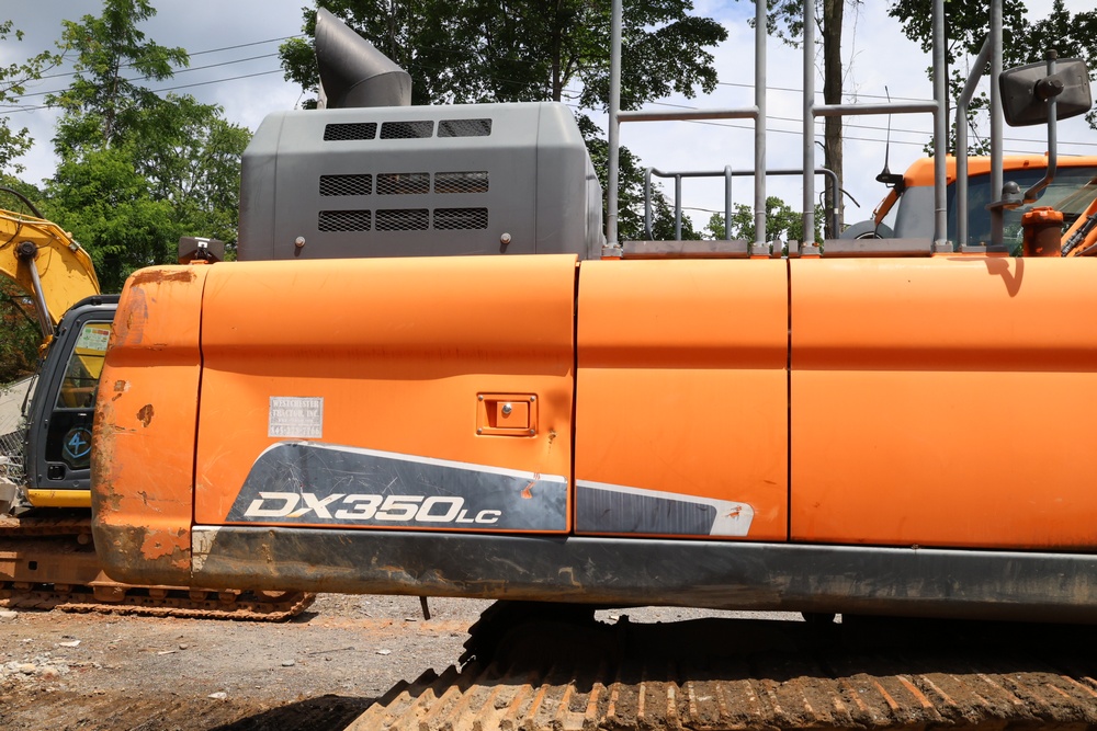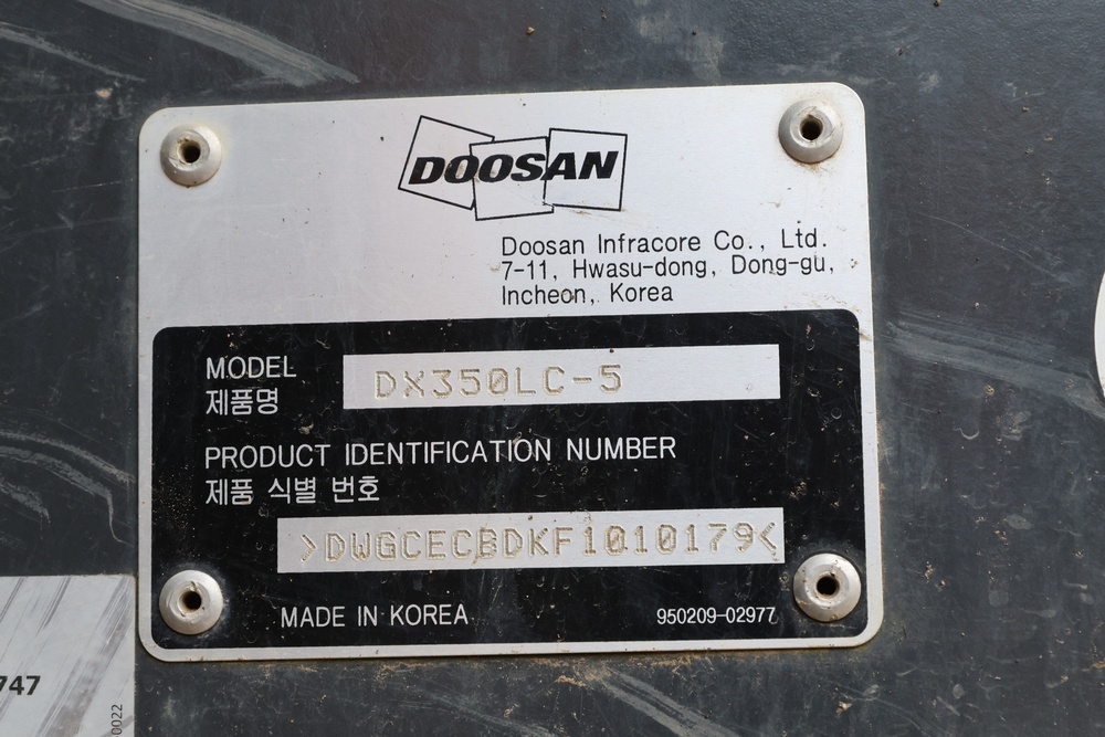 Doosan model DX350LC-5 excavator PIN: DQGCECBDKF1010179, aux hydraulic kit number 247747. With Scania engine type DC09 089A, heat, A/C, AM/FM radio, hour meter reading. Runs and operates. Key available.