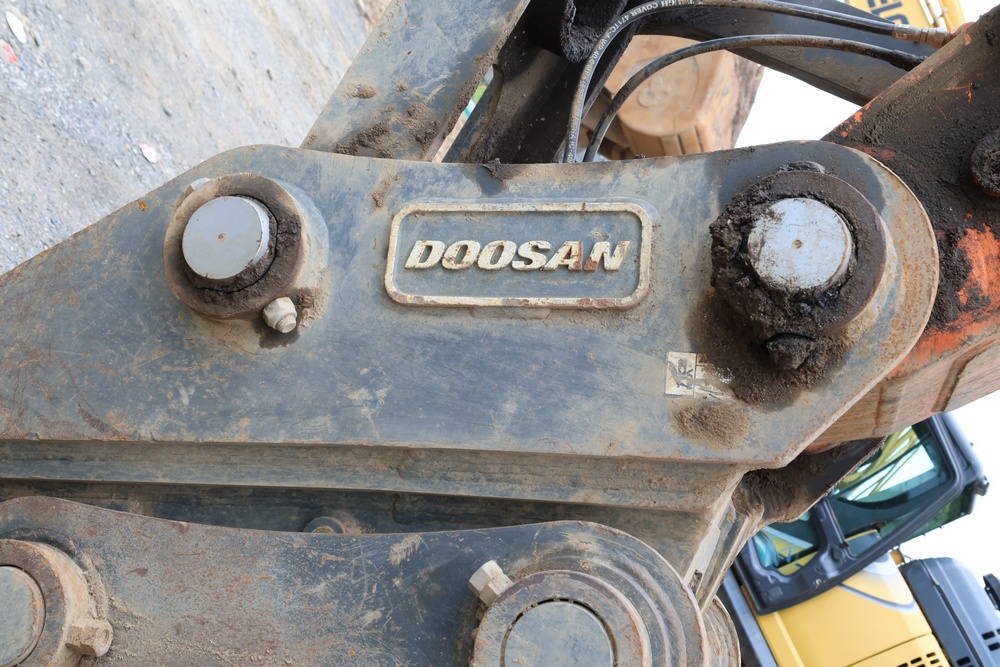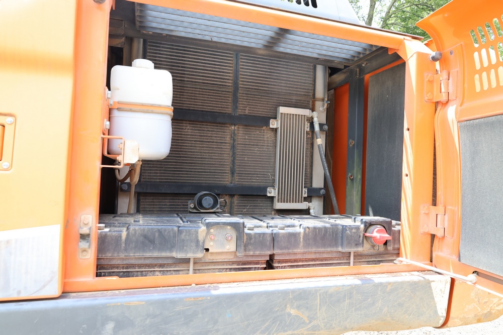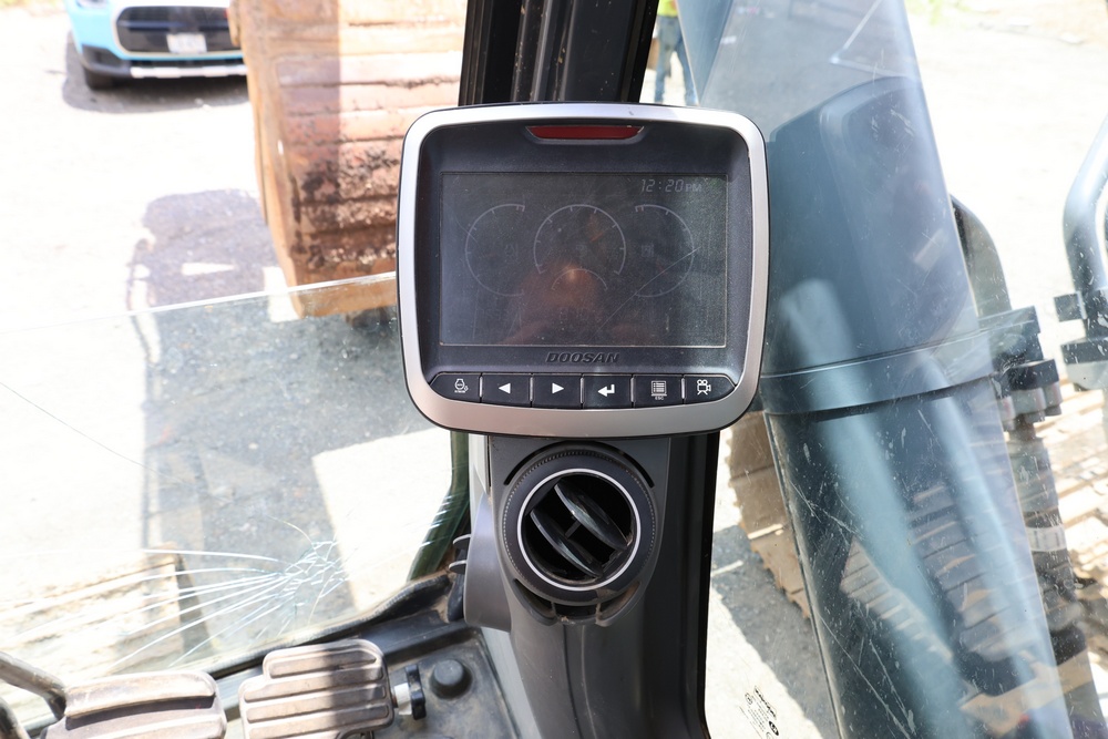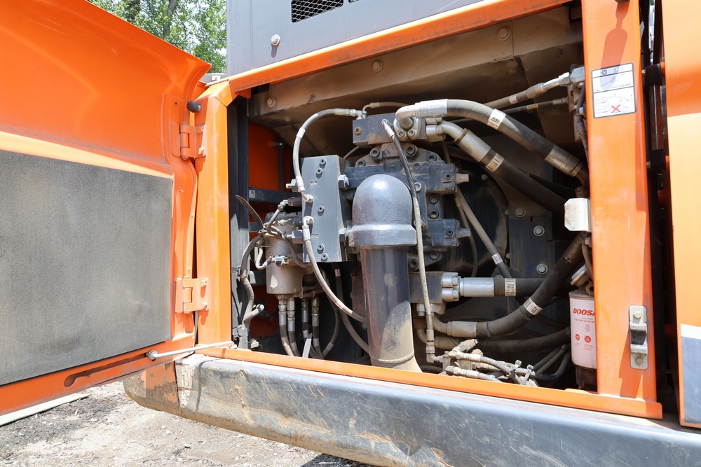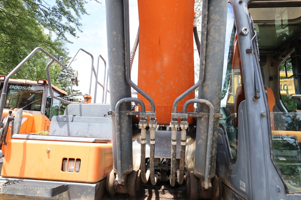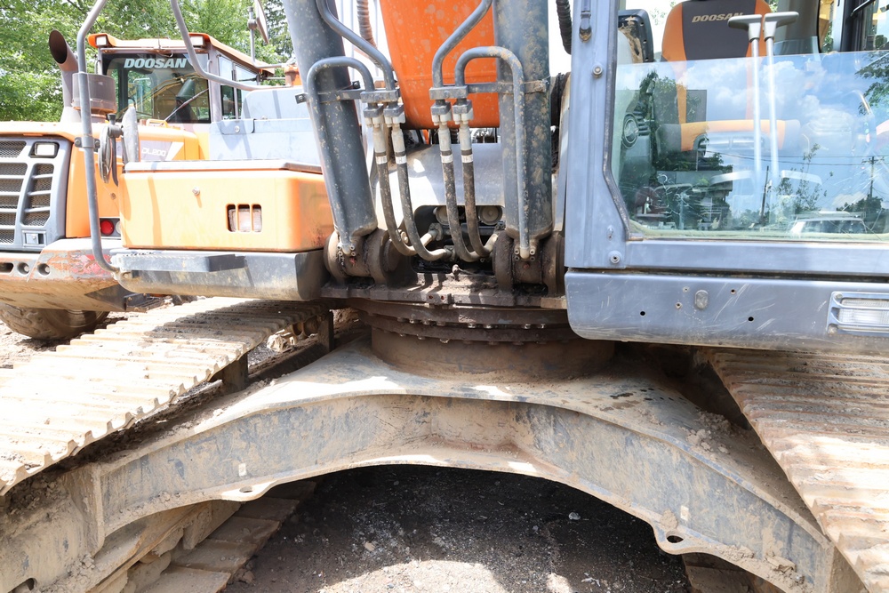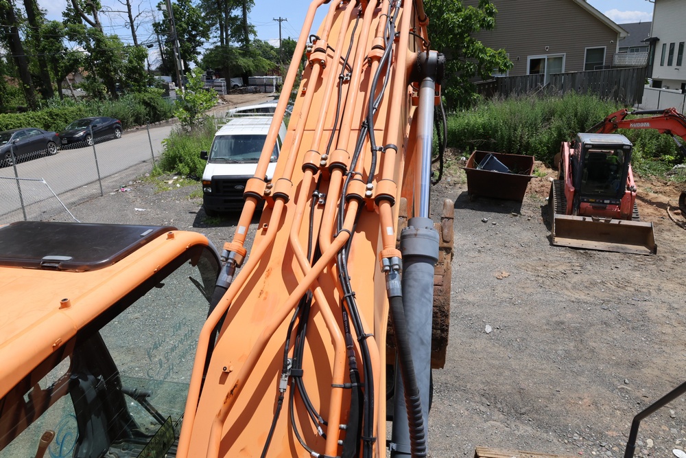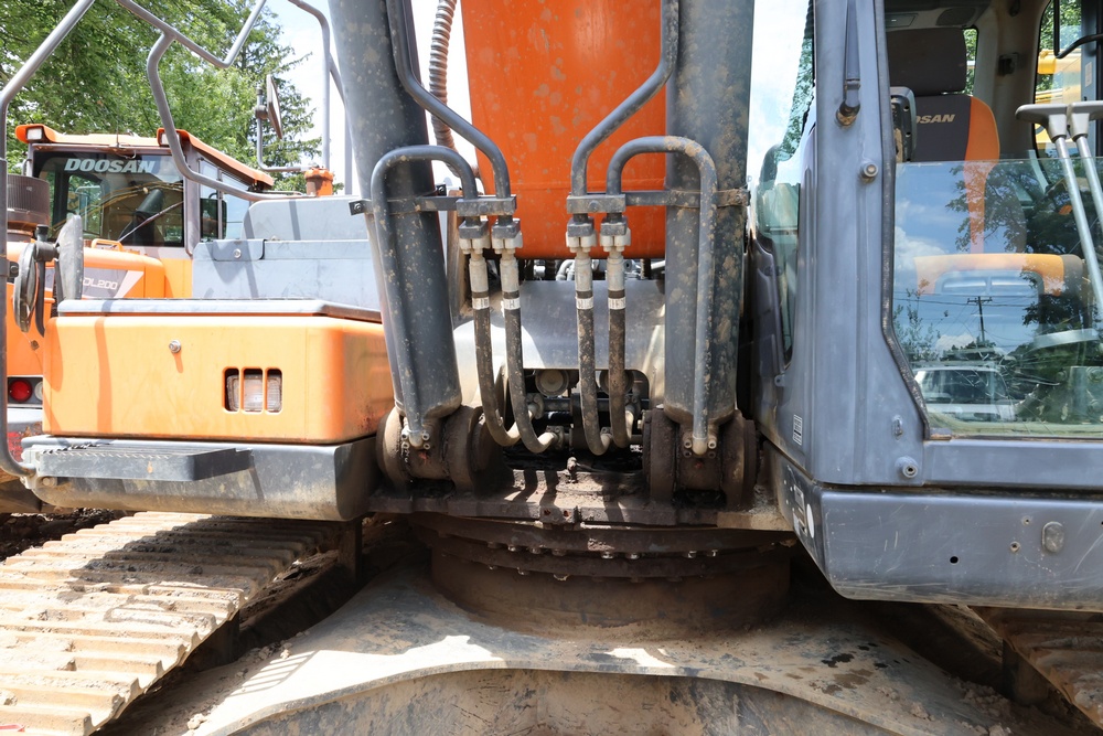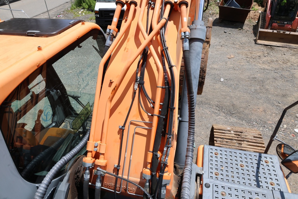 Doosan model DX350LC-5 excavator PIN: DQGCECBDKF1010179, aux hydraulic kit number 247747. With Scania engine type DC09 089A, heat, A/C, AM/FM radio, hour meter reading. Runs and operates. Key available.