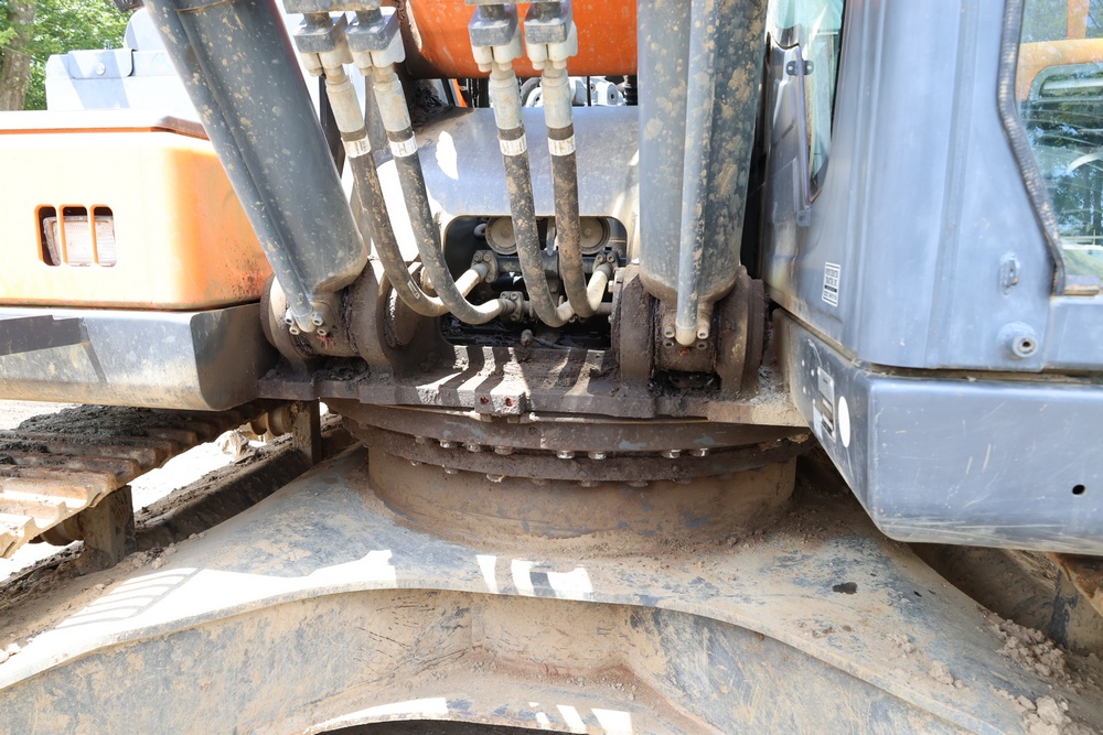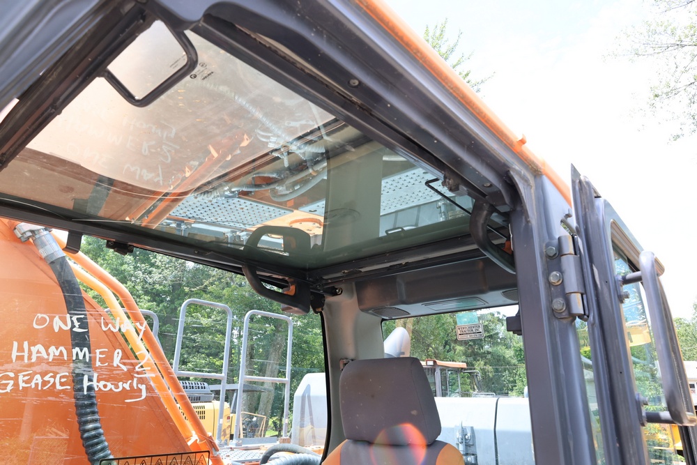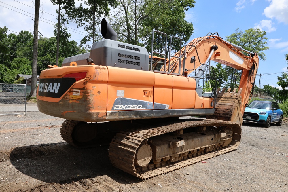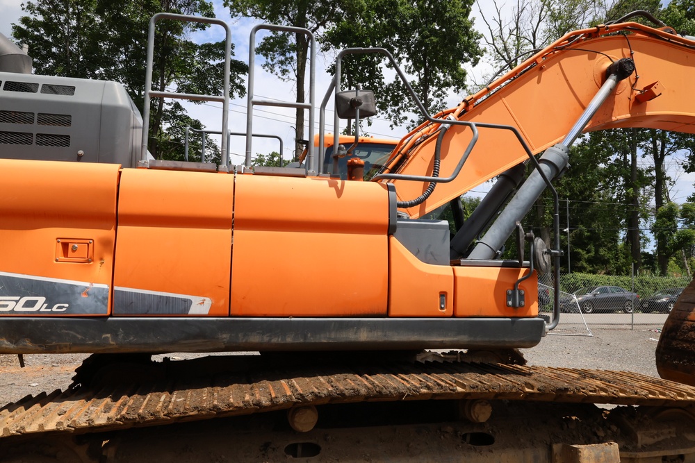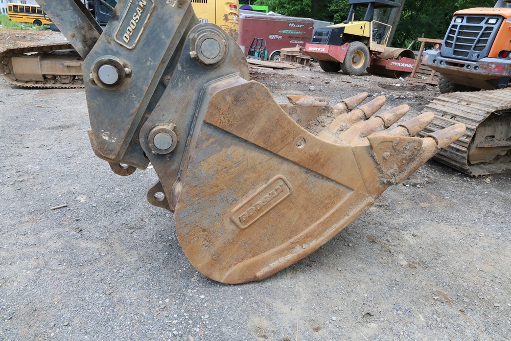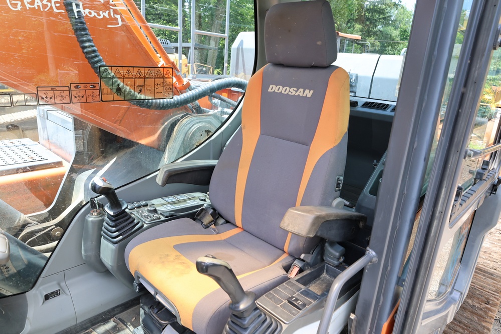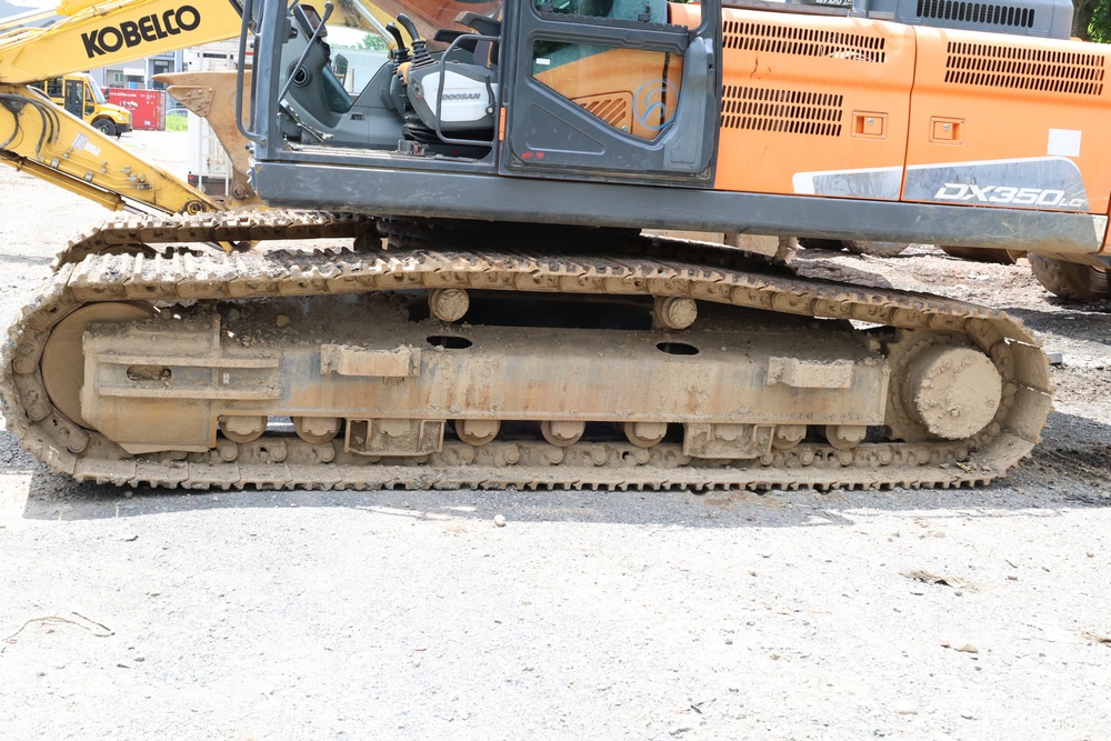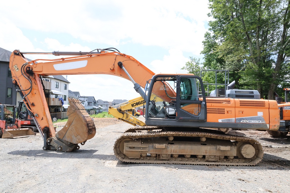 Doosan model DX350LC-5 excavator PIN: DQGCECBDKF1010179, aux hydraulic kit number 247747. With Scania engine type DC09 089A, heat, A/C, AM/FM radio, hour meter reading. Runs and operates. Key available.