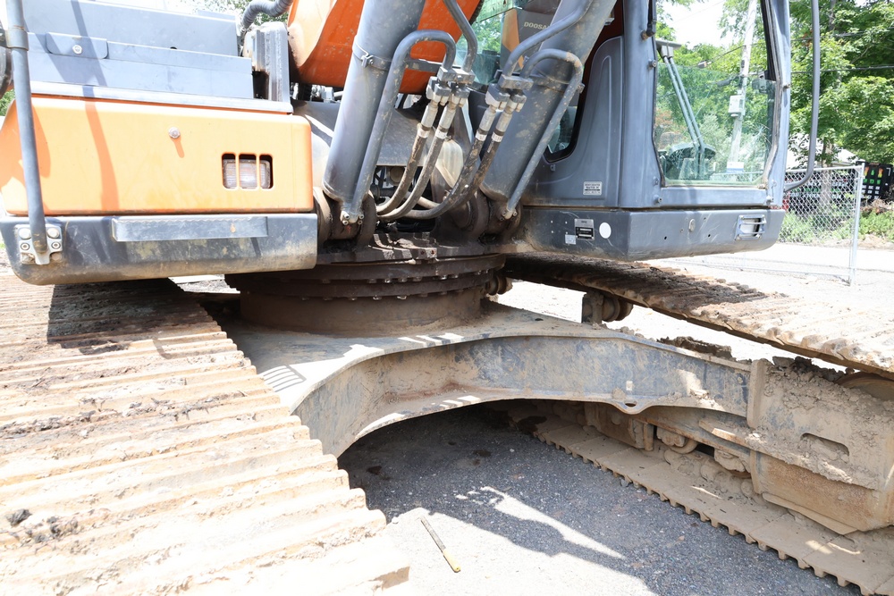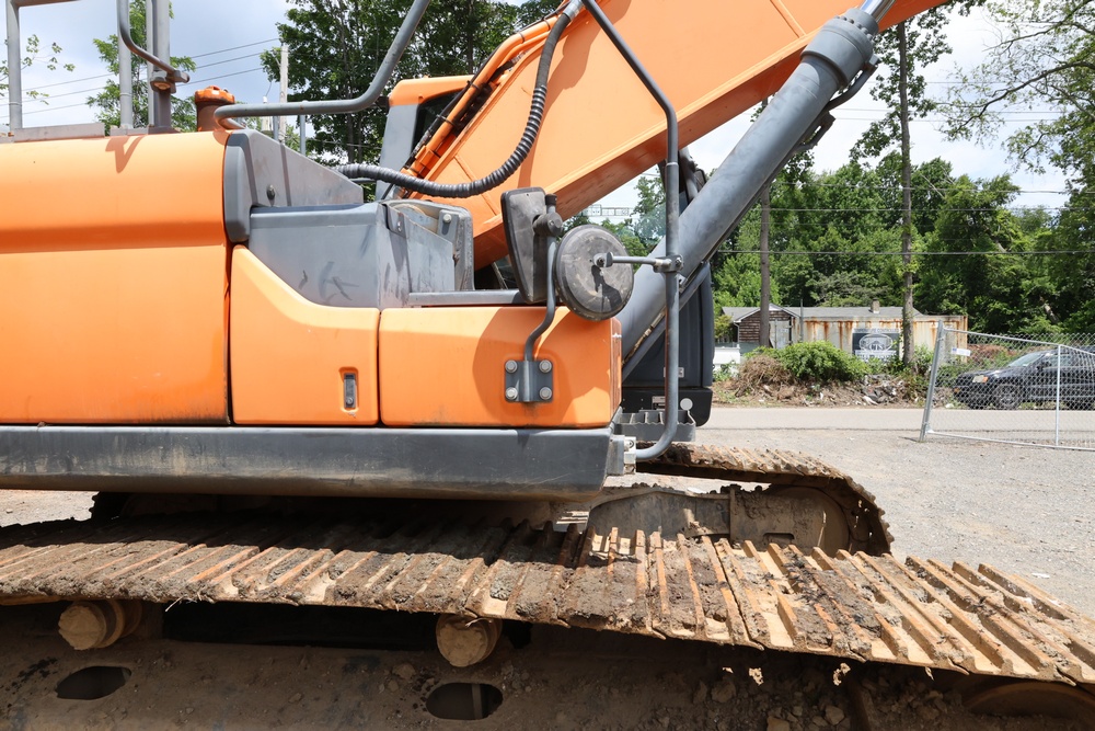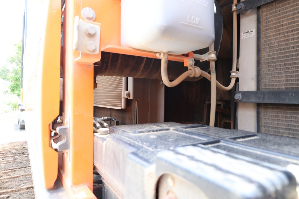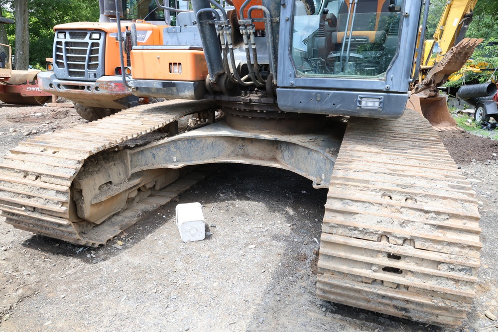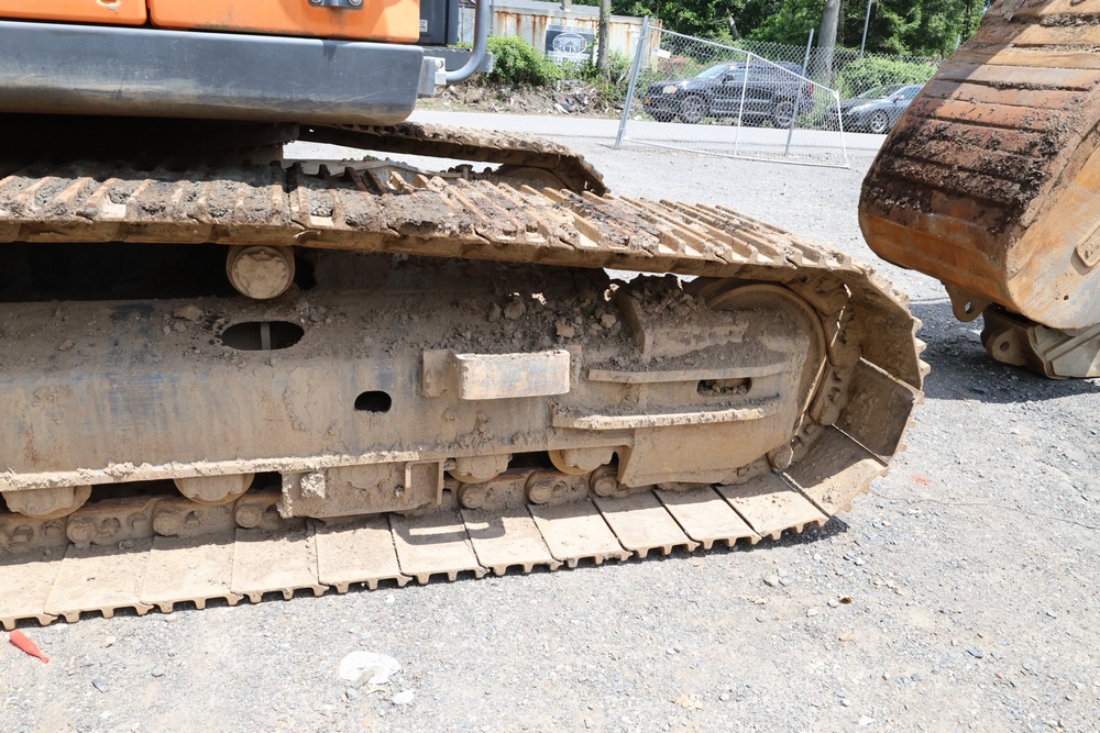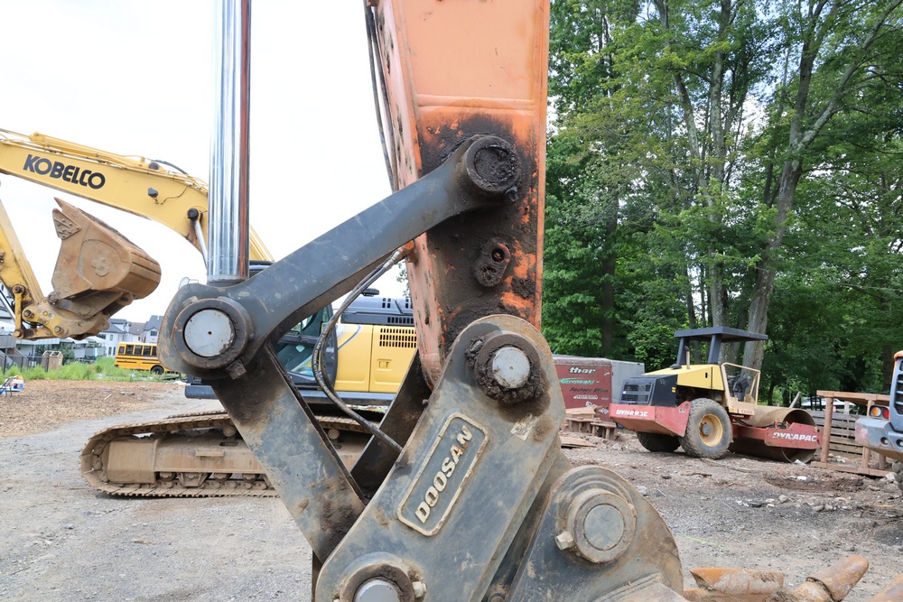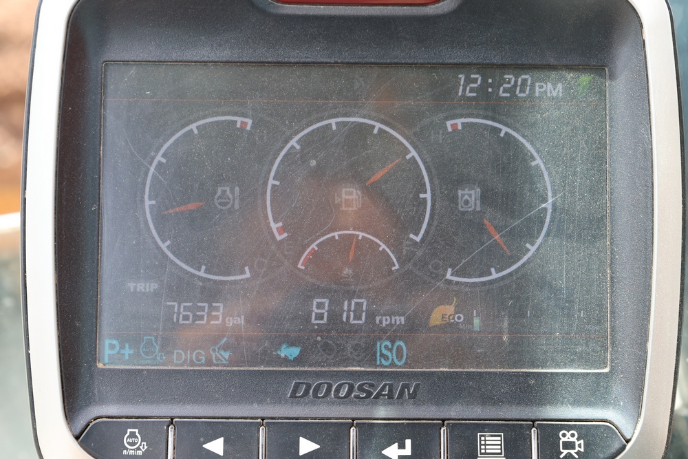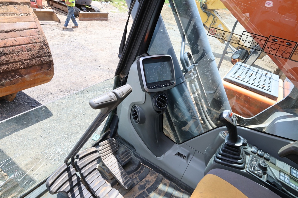 Doosan model DX350LC-5 excavator PIN: DQGCECBDKF1010179, aux hydraulic kit number 247747. With Scania engine type DC09 089A, heat, A/C, AM/FM radio, hour meter reading. Runs and operates. Key available.