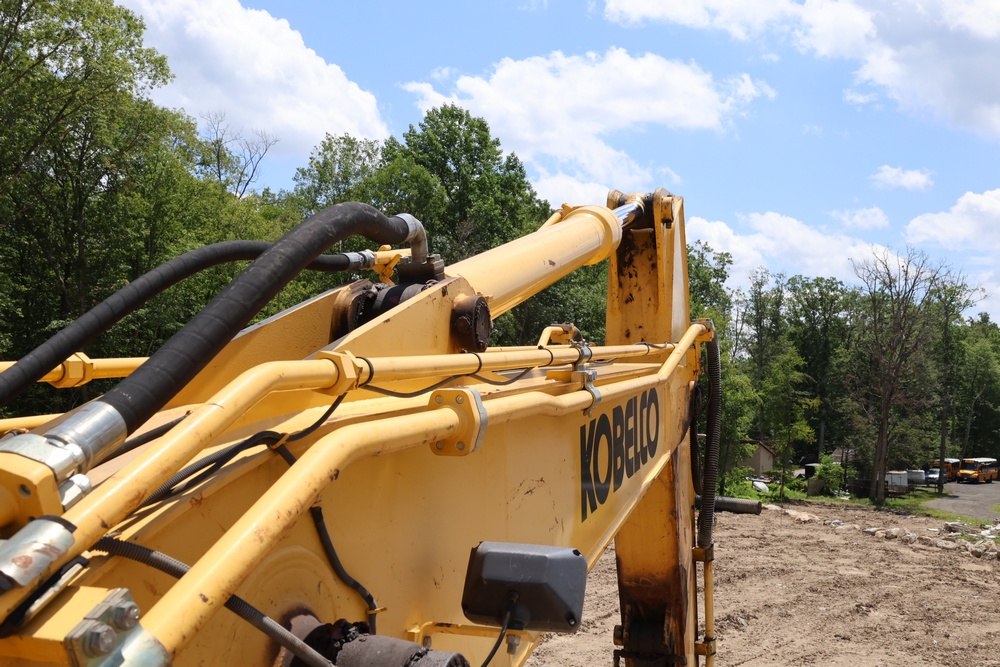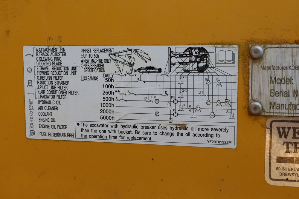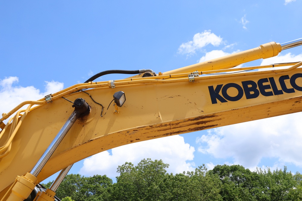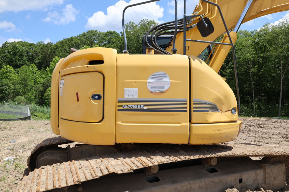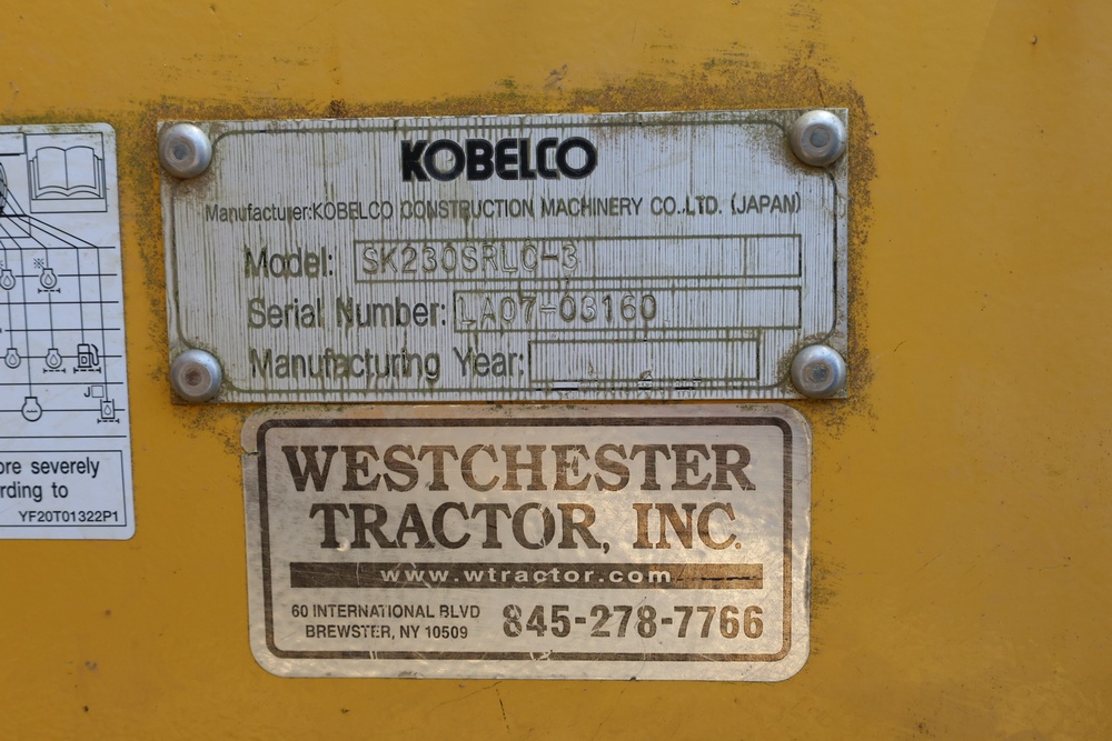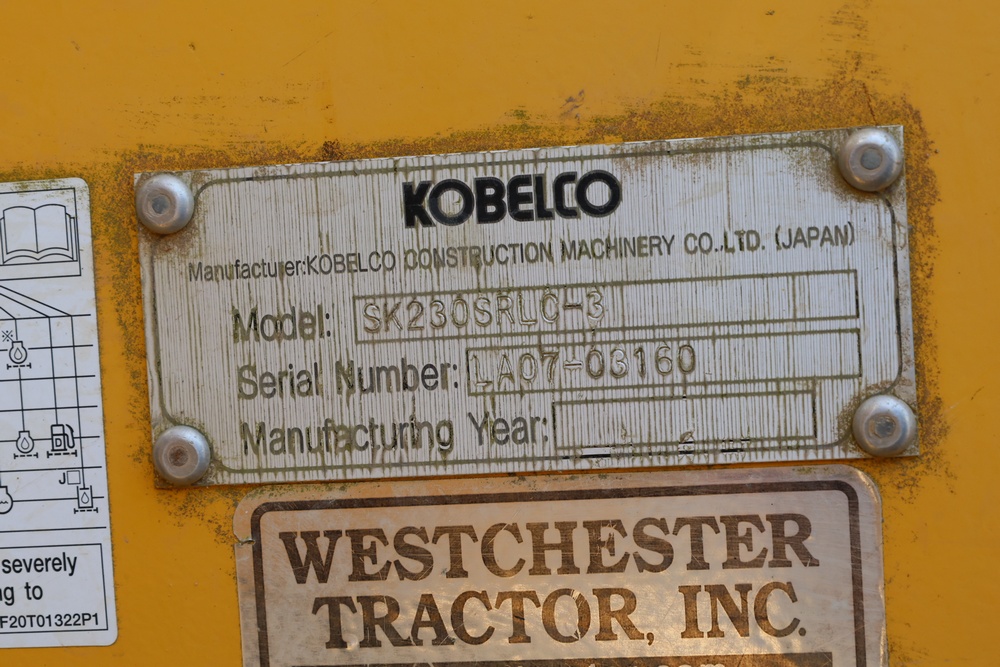 Kobelco model SK230SRLC-3 excavator serial number LA07-03160. With Hino 166 HP 5.123L engine, AM/FM radio, heat, A/C, hour meter reading 3916. Runs and operates. Key available.