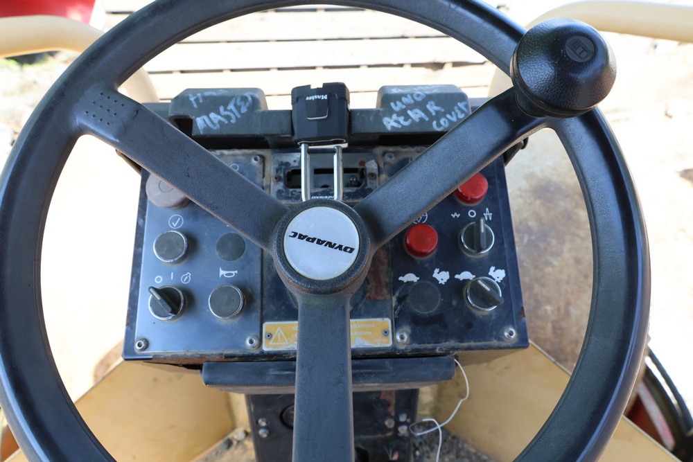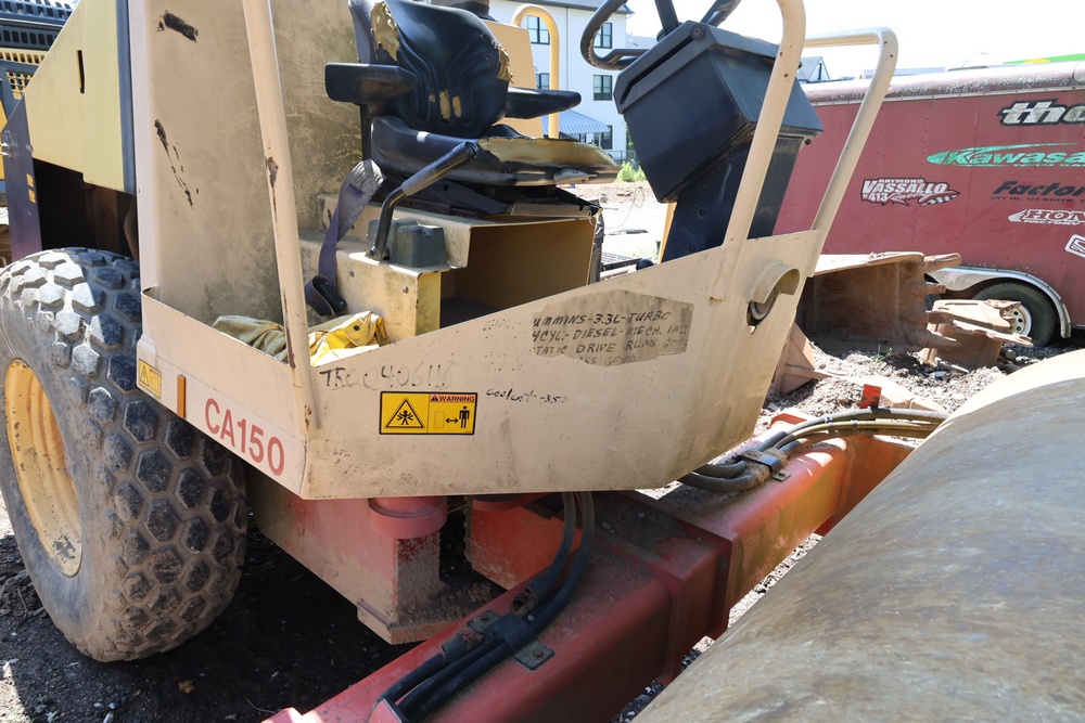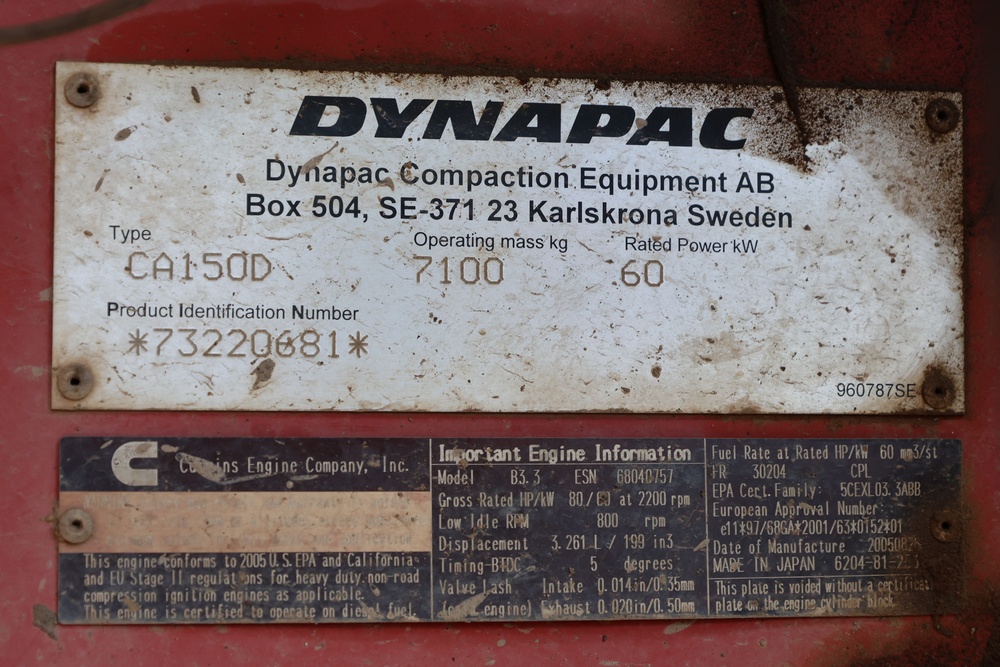 Dynapac model CA150D vibratory roller PIN: 73220681. With 7100 KG operating mass, rated 60 KW power, Cummins 3.261 L engine, hour meter reading 2184. Runs and operates. Key available.