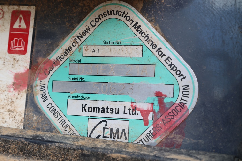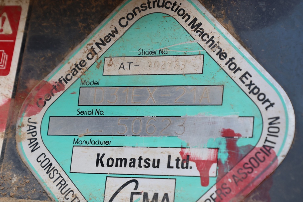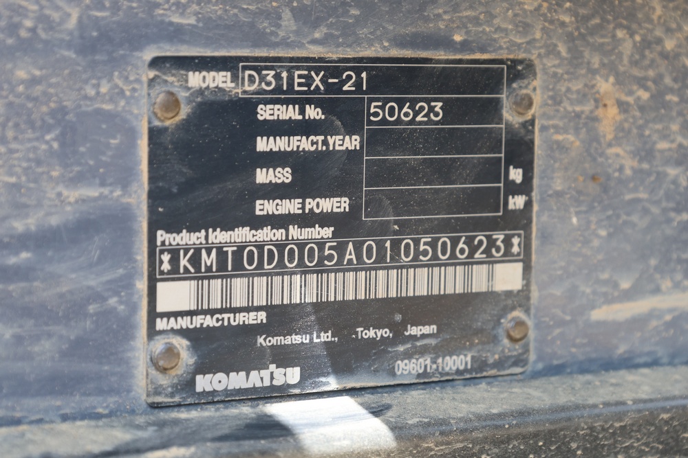 Komatsu model D31EX-21 dozer PIN: KMT0D005A01050623. With heat, A/C, AM/FM radio, hour meter reading 2863. Runs and operates. Key available.