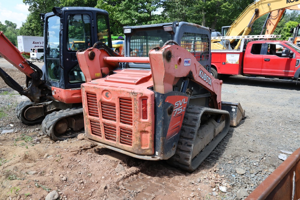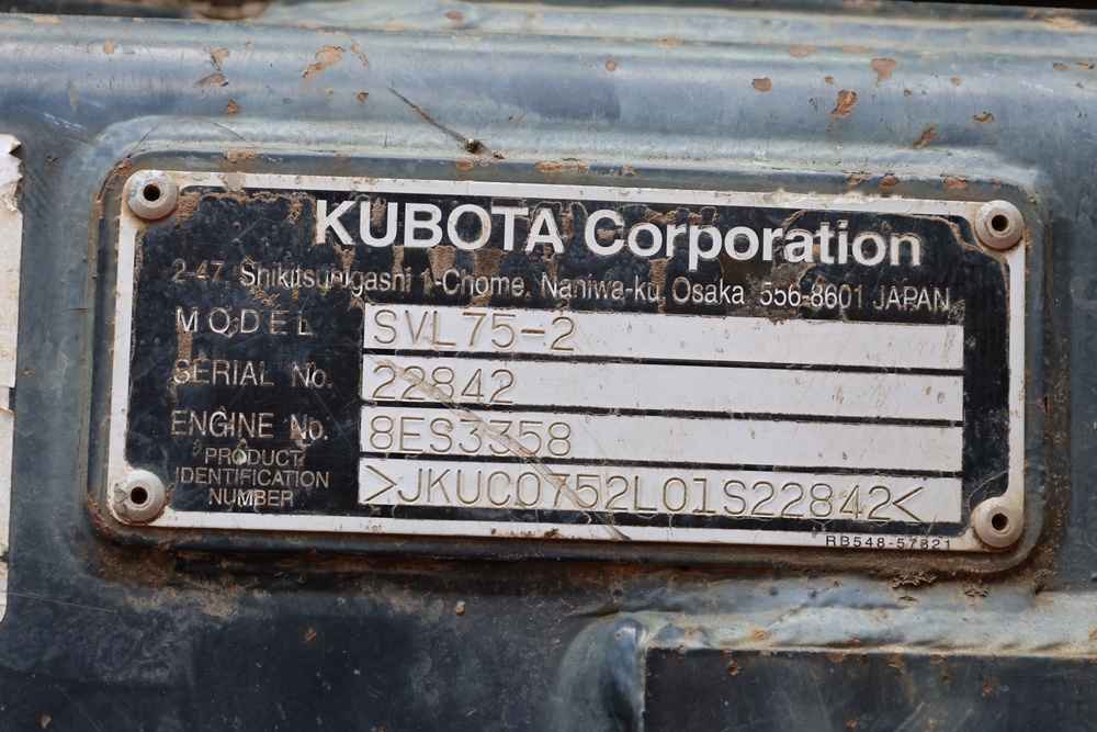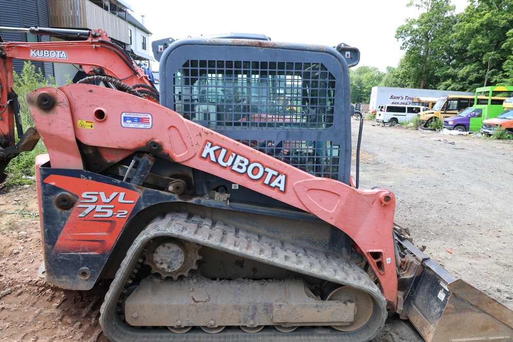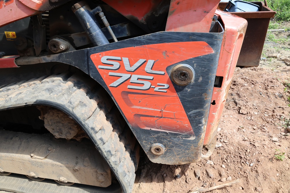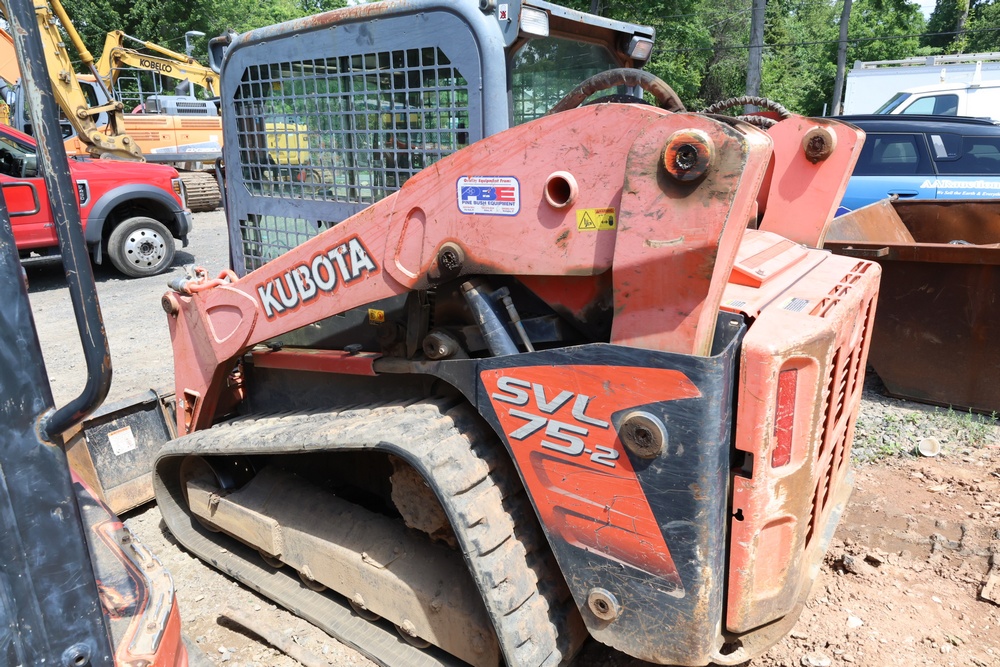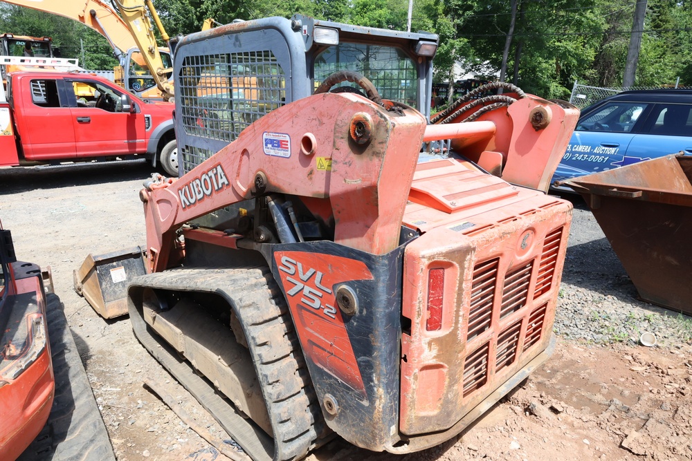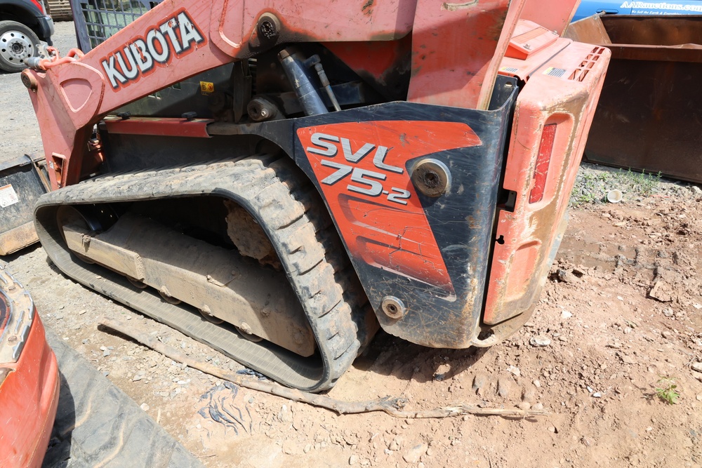 Kubota model SVL75-2 track skid steer PIN: JKUC0752L01S22842. Hour meter reading: 2489, with A/C, heat, and Paladin fork attachment. Runs and operates. Key available.