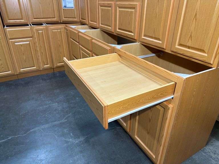 Regal Oak Kitchen Cabinet Set 12'x12'. Classic Layout, 30" Walls, By GHI, Additional pieces may be available for order to the high bidder. Additional cabinets ship boxed, ready to assemble. -All Wood Construction -3/4” Plywood with Veneer Oak Face Frame -Solid Oak Raised Panel Door with Veneer Center Panel -1/2” Plywood Box Construction -5/8” Plywood Shelf -Side Mount Glides and Plywood Drawer Box -Concealed Hinges. Enclosed in each cabinet set will be a Build Sheet which lists the individual cabinets in each set. As the cabinets are palletized each cabinet will be checked off and signed by our staff member to ensure that the set is complete at the time of pick-up. Please keep this Build Sheet on hand because it will be required if there is an issue with your cabinet set. Cabinet issues will not be addressed without this build sheet. Weight: x. Sold by: Set. Sold as: Price x Quantity.