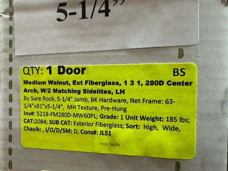Medium Walnut, Ext Fiberglass 1-3-1, 280D Center Arch, W/2 Matching Sidelites, LH. By Sure Rock, 5-1/4" Jamb, BK Hardware, Net Frame 63 1/4"x81"x5 1/4", MH Texture Pre-Hung, Grade: 1 Weight: 185. Sold by: Door. Sold as: Price x Quantity.
