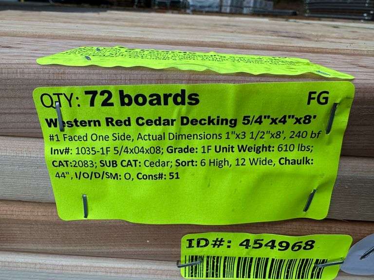 Western Red Cedar Decking 5/4"x4"x8'. #1 Faced One Sie, Actual Dimensions 1"x3 1/2"x8', 240 Board Foot Grade: 1F Weight: 610. Sold by: Board. Sold as: Price x Quantity.