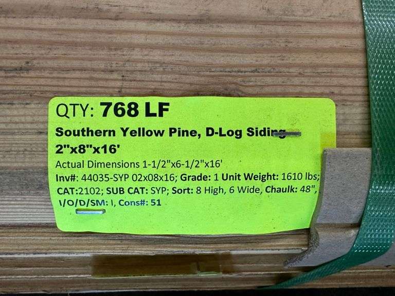 Southern Yellow Pine D-Log Siding 2"x8"x16'. Actual Dimensions 1-1/2"x6-1/2"x16', Grade: 1 Weight: 1610. Sold by: Linear Foot. Sold as: Price x Quantity.