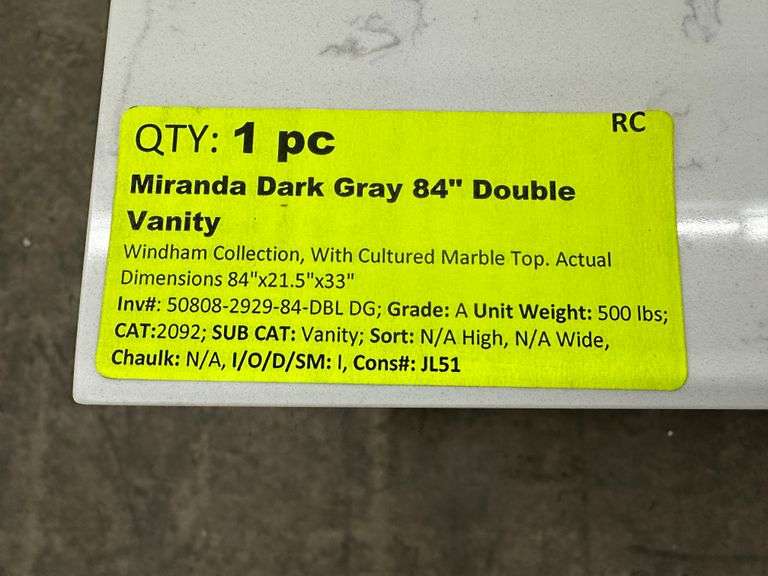 Miranda Dark Gray 84" Double Vanity. Windham Collection, With Cultured Marble Top, Actual Dimensions: 84"x21.5"x33", Does Not Include Hardware, Grade: A Weight: 500. Sold by: Piece. Sold as: Price x Quantity.