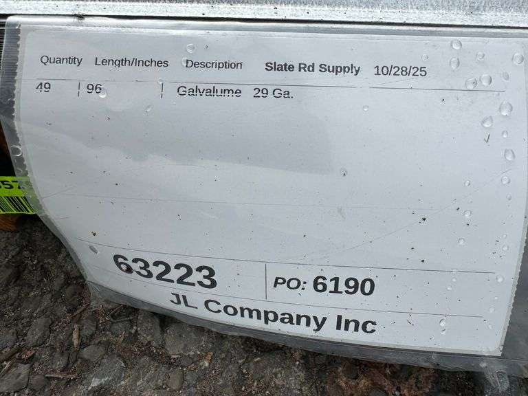 Galvalume Metal Panel 3'x8'. 29 Gauge, 49 Pieces, Grade: B. Metal can be labeled as "B Grade" for many reasons. Some may include possible paint imperfections such as; off colors, light or heavy coating, dirt in paint, paint splash or blisters. They may contain steel imperfections such as; creases, wrinkles, wavy edges, dents, or general handling damage. When bidding on Grade B metal panels please don't assume that any two lots are the same. If you want to buy more than one (1) lot and need the same color please call us at 607-865-6951 to have us inspect the lots before you purchase. Weight: 843. Sold by: Linear Foot. Sold as: Price x Quantity.