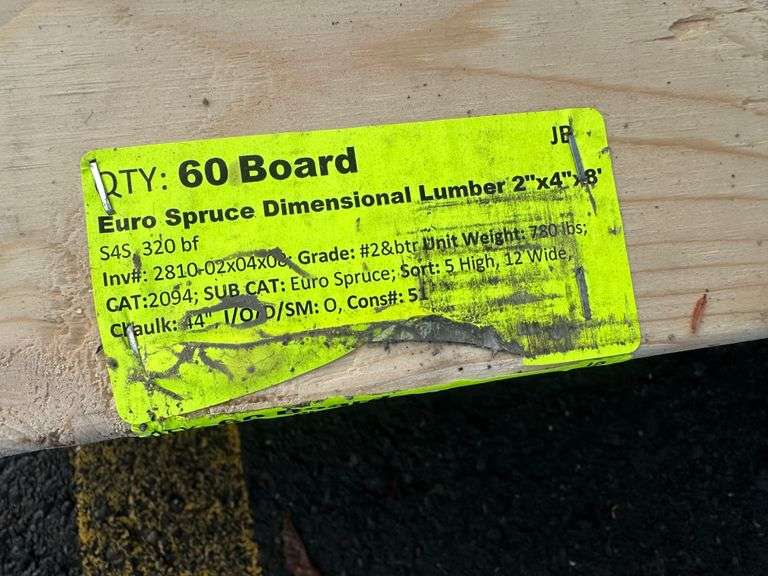 Euro Spruce Dimensional Lumber 2"x4"x8'. S4S, 320 Board Foot, Grade: PMO, *Condition Note: Split/Cracked Boards, Please See Photos* Weight: 780. Sold by: Board. Sold as: Price x Quantity.