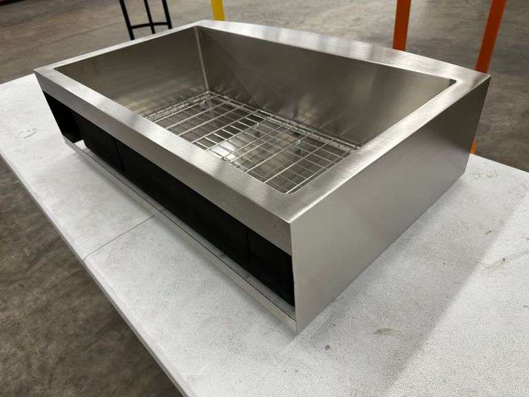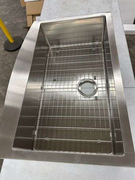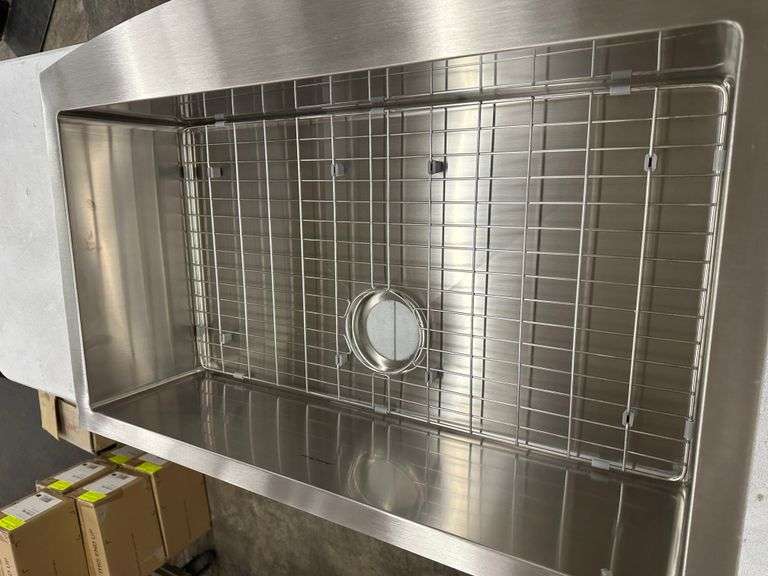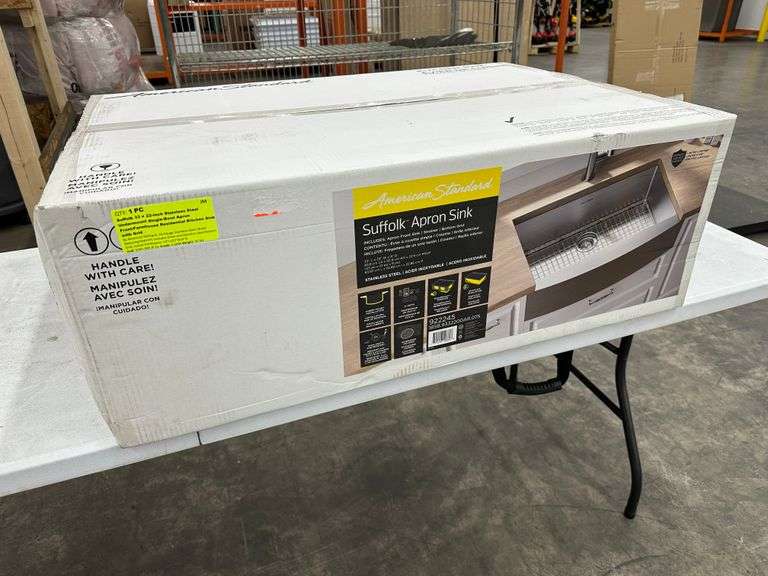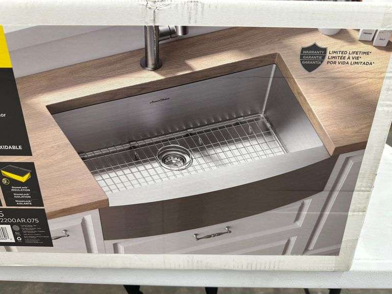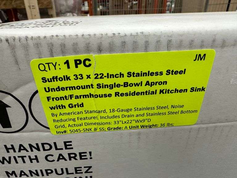 Suffolk 33"x22" Stainless Steel Undermount Single-Bowl Apron Front/Farmhouse Residential Kitchen Sin. By American Standard, 18-Gauge Stainless Steel, Noise Reducing Features, Includes Drain and Stainless Steel Bottom Grid, Actual Dimensions: 33"L x 22"W x 9"D Grade: A Weight: 36. Sold by: Piece. Sold as: Price x Quantity.