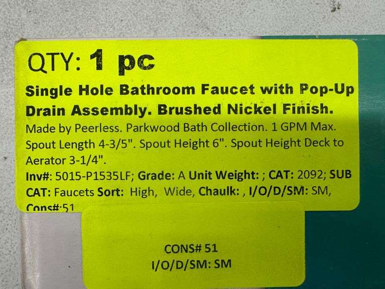 Single Hole Bathroom Faucet With Pop-Up Drain Assembly Brushed Nickel Finish. Made By Peerless, Parkwood Bath Collection, 1GPM Max, Spout Length 4 3/5", Spout Height 6", Spout Height Deck To Aerator 3 1/4", Grade: A Weight: x. Sold by: Piece. Sold as: Price x Quantity.