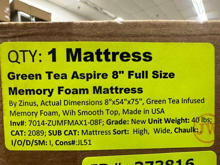 Green Tea Aspire 8" Full Size Memory Foam Mattress. By Zinus, Actual Dimension 8"x 54"x 75" Green Tea Infused Memory Foam with smooth Top, Made in USA Grade New Weight: 40. Sold by: Mattress. Sold as: Price x Quantity.