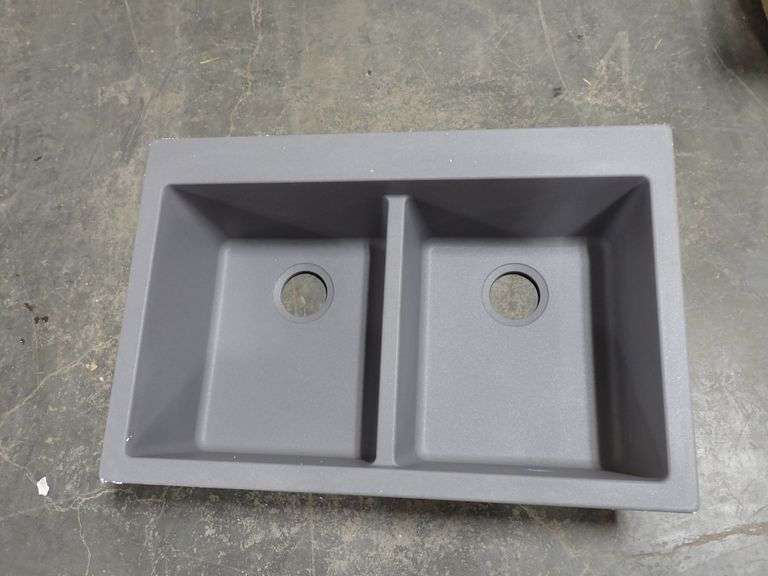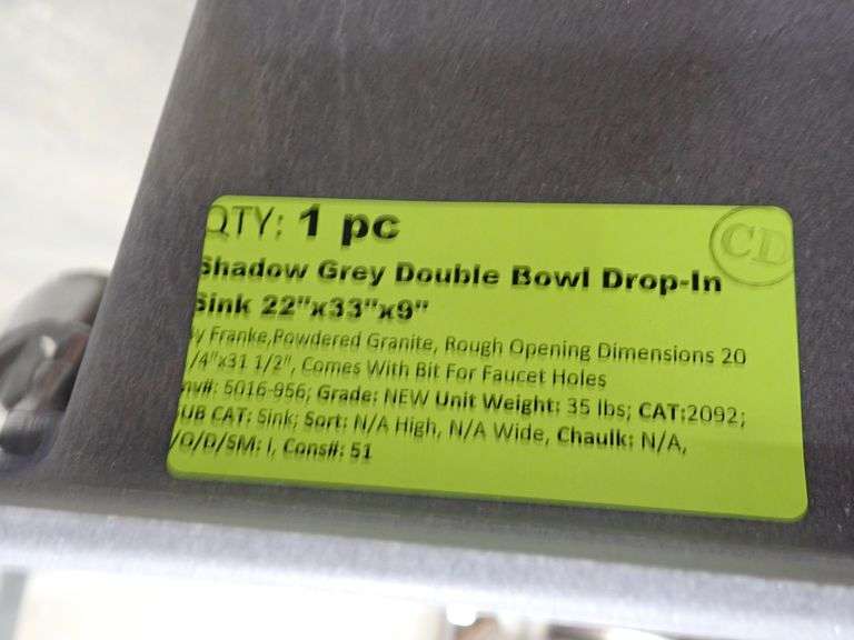 Shadow Grey Double Bowl Drop-In Sink 22"x33"x9". By: Franke, Powdered Granite, Rough Opening Dimensions: 20 1/4"x31 1/2", Comes With Bit For Faucet Holes, Grade: NEW Weight: 35. Sold by: Piece. Sold as: Price x Quantity.