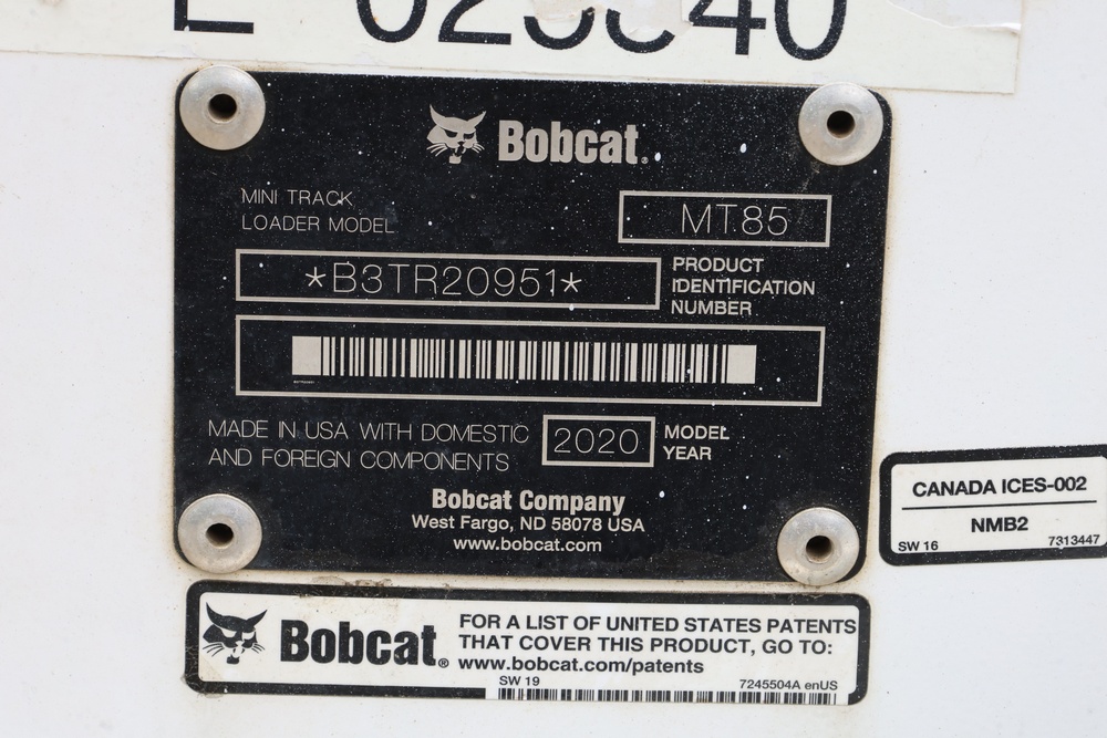 2020 Bobcat model MT85 Mini Track Loader PIN: B3TR20951. Hour meter reading: 1419. Seller reports: Operates as intended. Seller ID # 785-09.