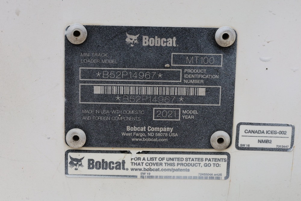 2021 Bobcat model MT100 Mini Track Loader PIN: B52P14967. Hour meter reading: 1399. Seller reports: Operates as intended. Seller ID # 785-13.