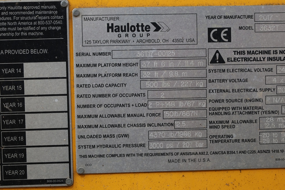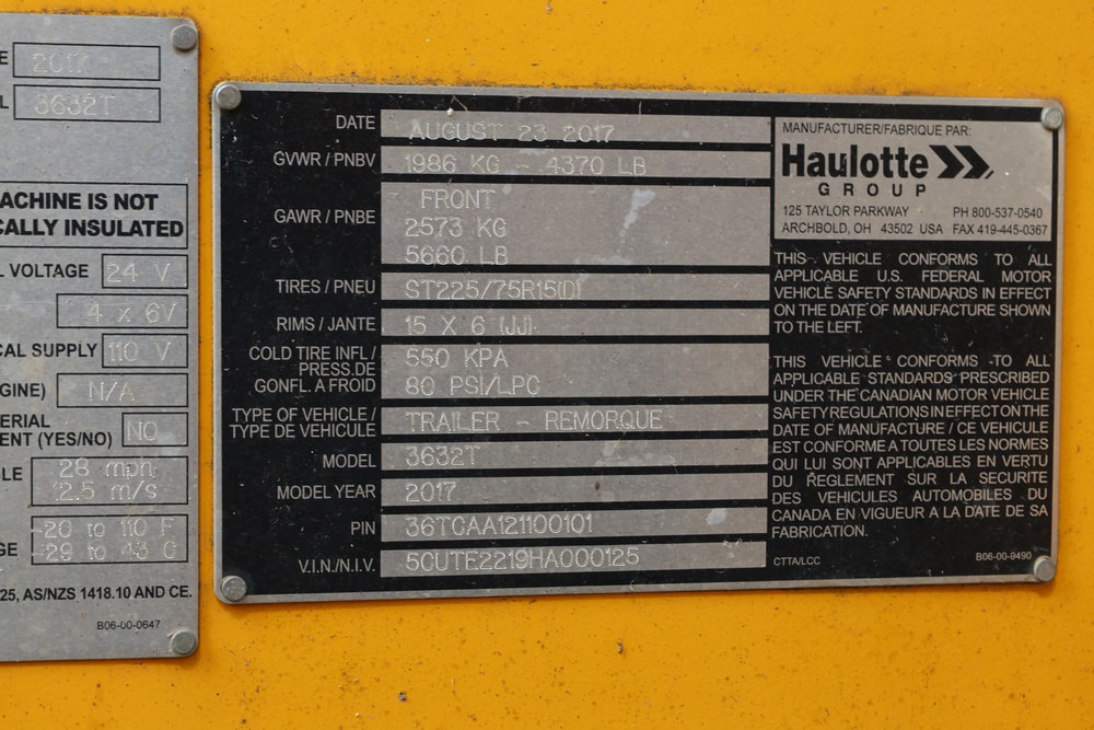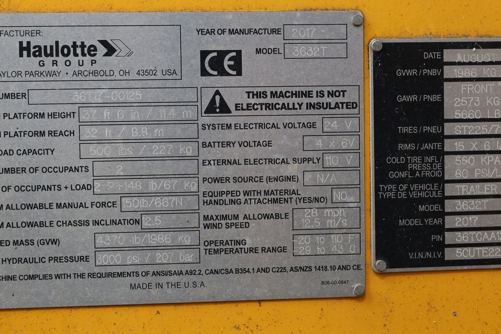 Bil-jax model 3632DC 36' Towable boom PIN: 5CUTE2219HA000125. Hour meter reading: N/A. Seller reports: Operates as intended. Seller ID # 647-21.
