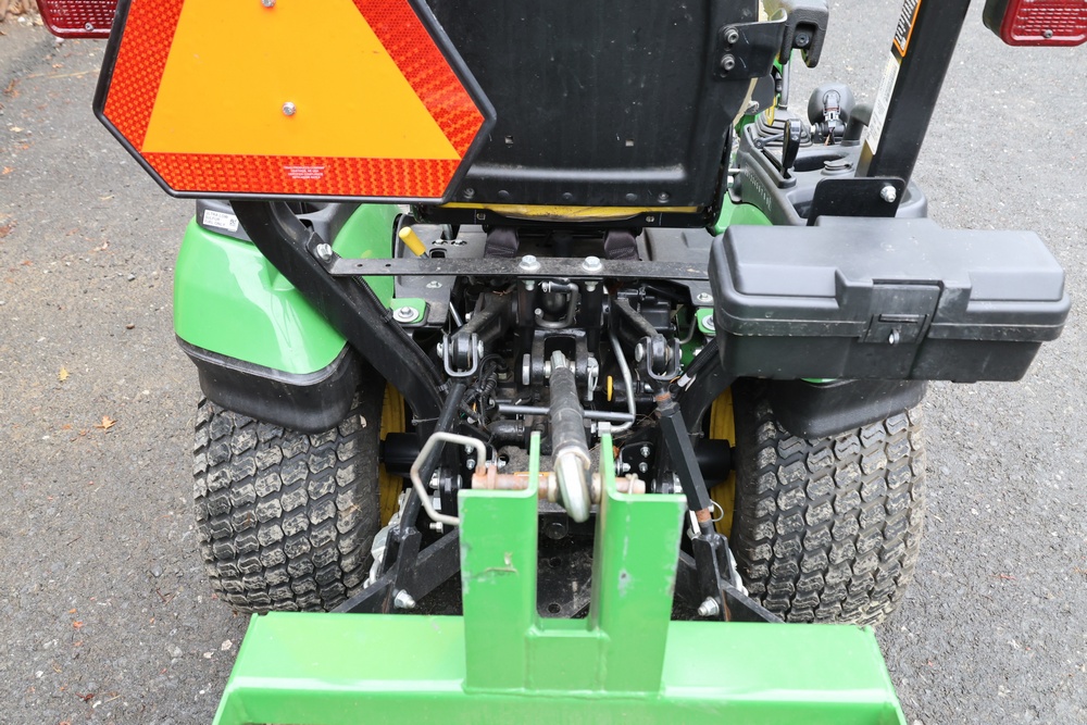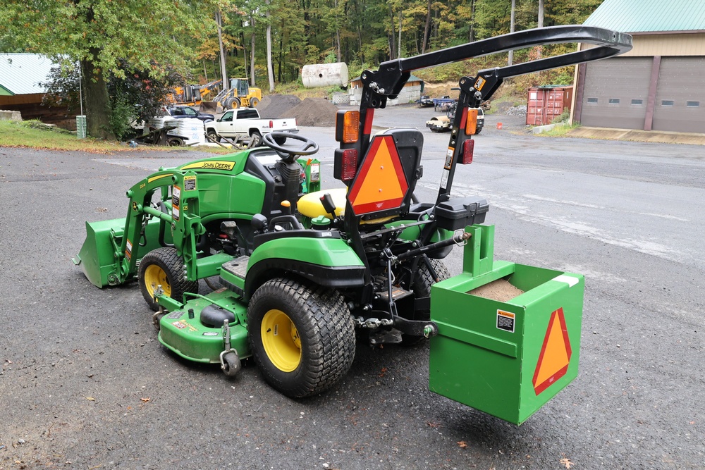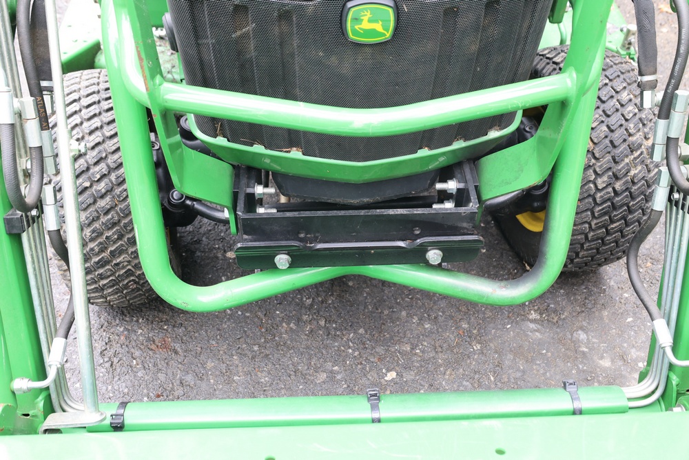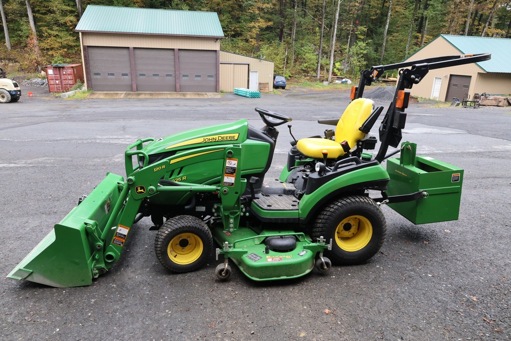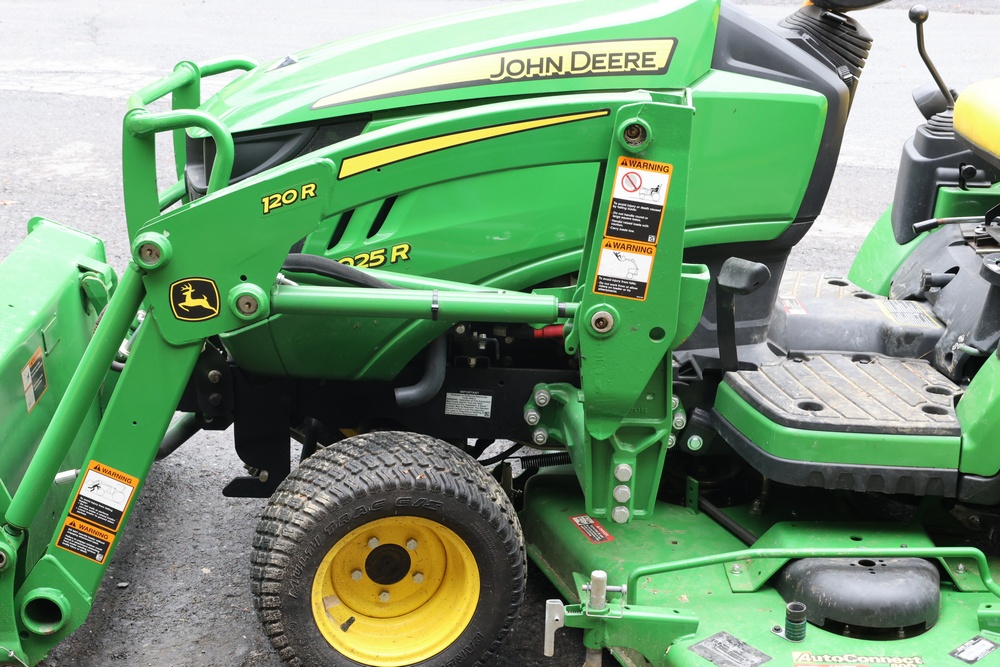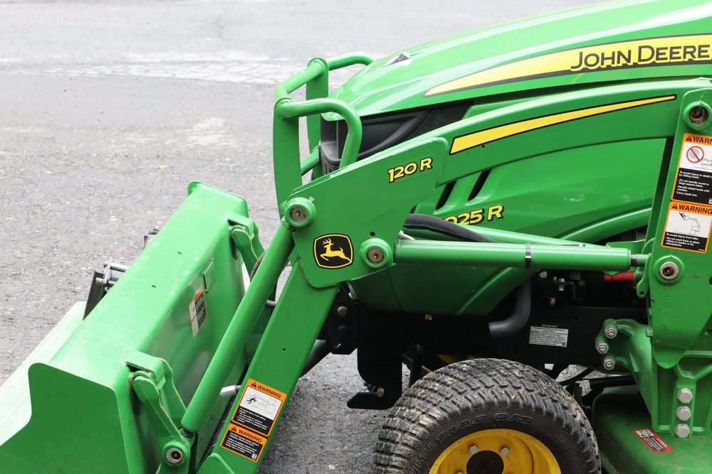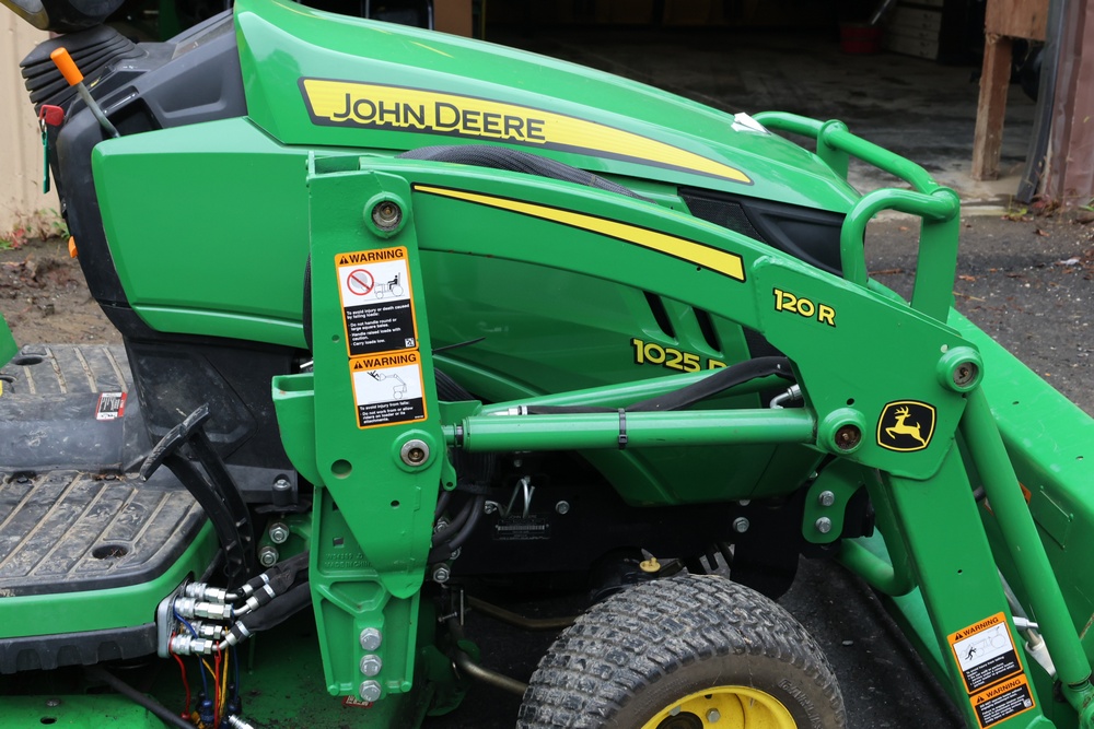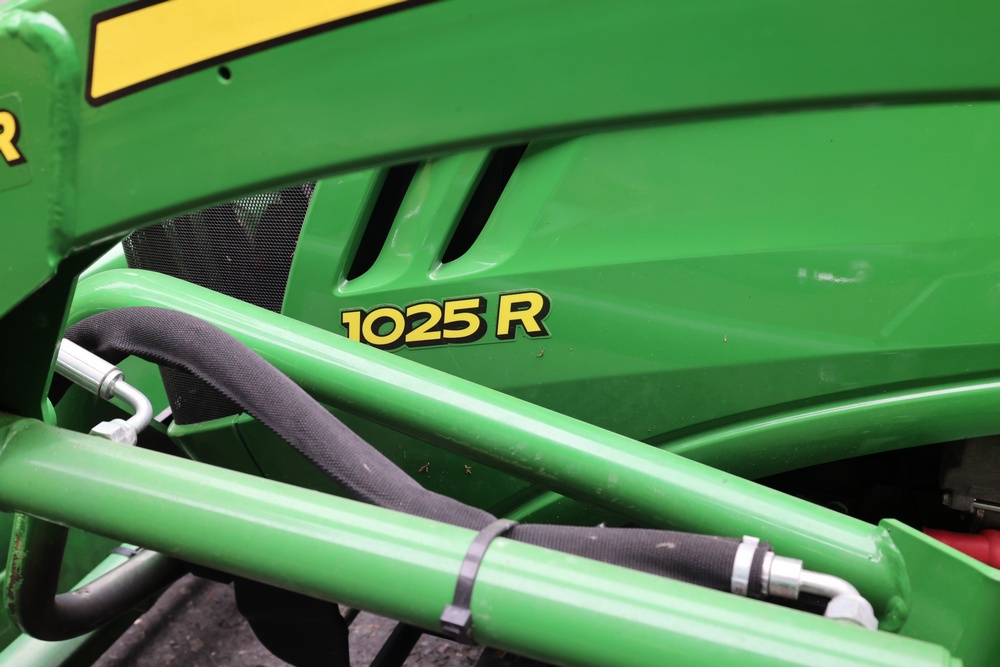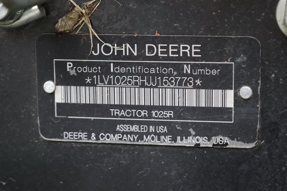 John Deere 1025R Sub-Compact Tractor. VIN: 1LV1025RHJJ153773. Hour meter reading: 145.4 hours (displayed). Equipped with a 120R front-end loader and mid-mount mower deck. The unit includes a rear weight box, new bagging system, quick attach Imatch, 47" snowblower, fork attachment, Frontier RC2048 rotary cutter, and rollover protection system. Exterior: Green and yellow finish with labeled John Deere branding. Assembled in the USA by Deere & Company, Moline, Illinois. Runs and operates as intended.